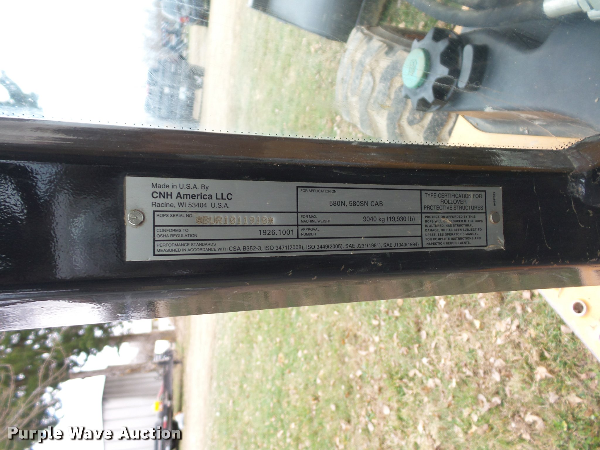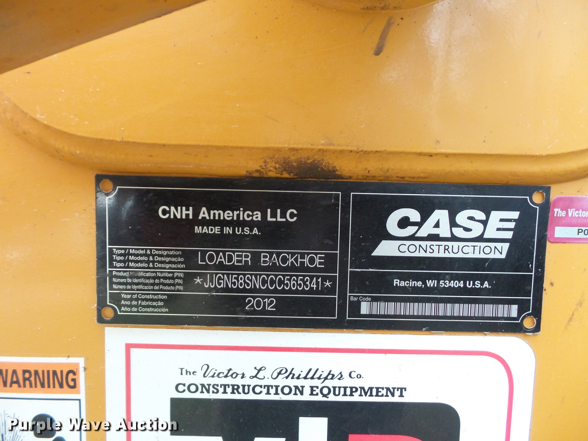 2012 Case 580 Super N backhoe. 2,608 hours on meter, Case four cylinder turbo diesel engine, Shuttle shift transmission 4F-4R gears, Four wheel drive, EROPS, AC and heat, Tilt steering wheel, Suspension seat, Four stick backhoe controls, Wipers, Backup alarm, Front and rear work lights, 82"W loader bucket, Auxiliary hydraulics, Extendahoe, 24"W backhoe bucket (5) teeth, Auxiliary hydraulics, Front counterweights, 12-16.5 front tires, 19.5-24 rear tires, Serial JJGN58SNCCC565341. Warrensburg, MO 64093
