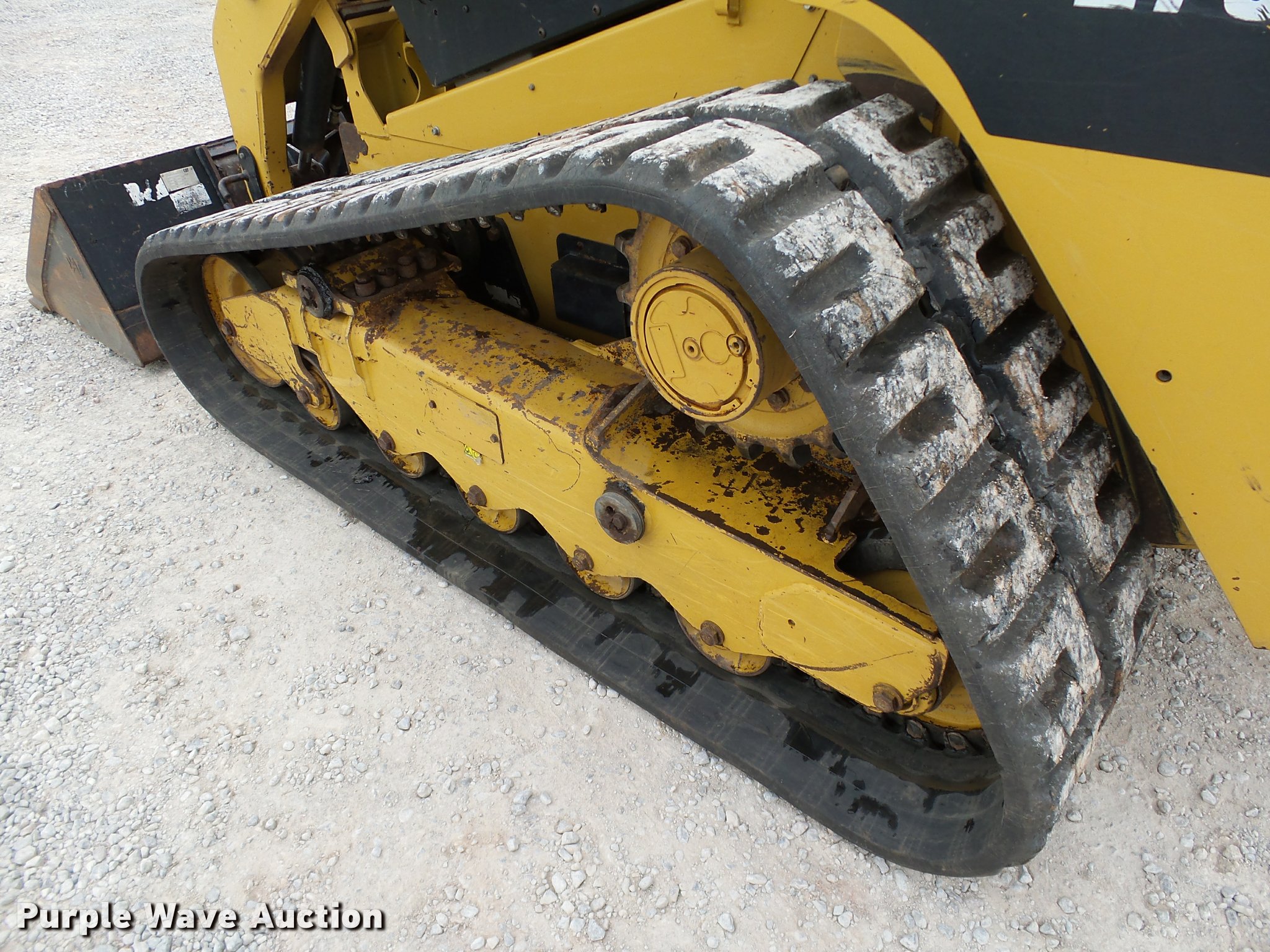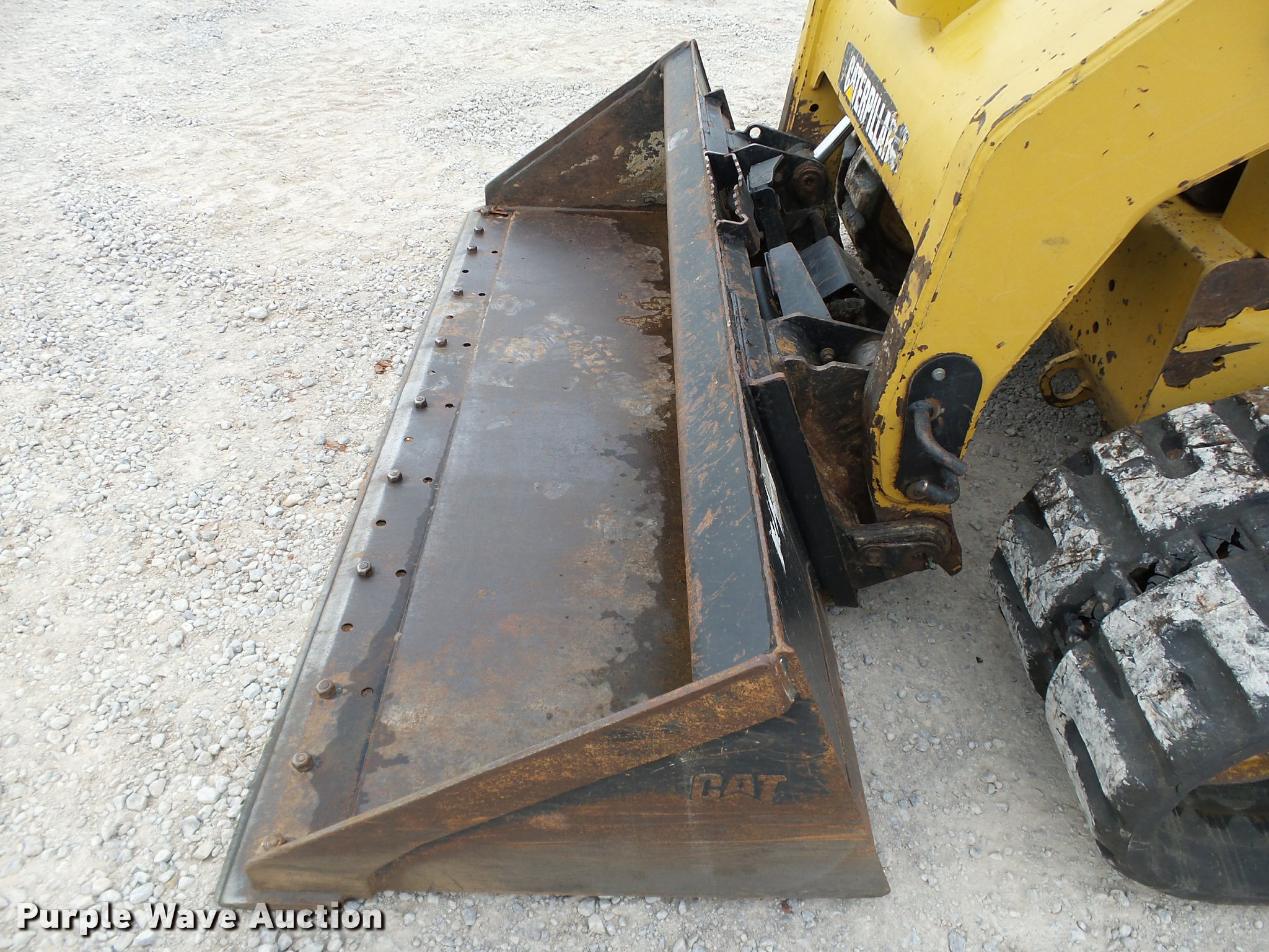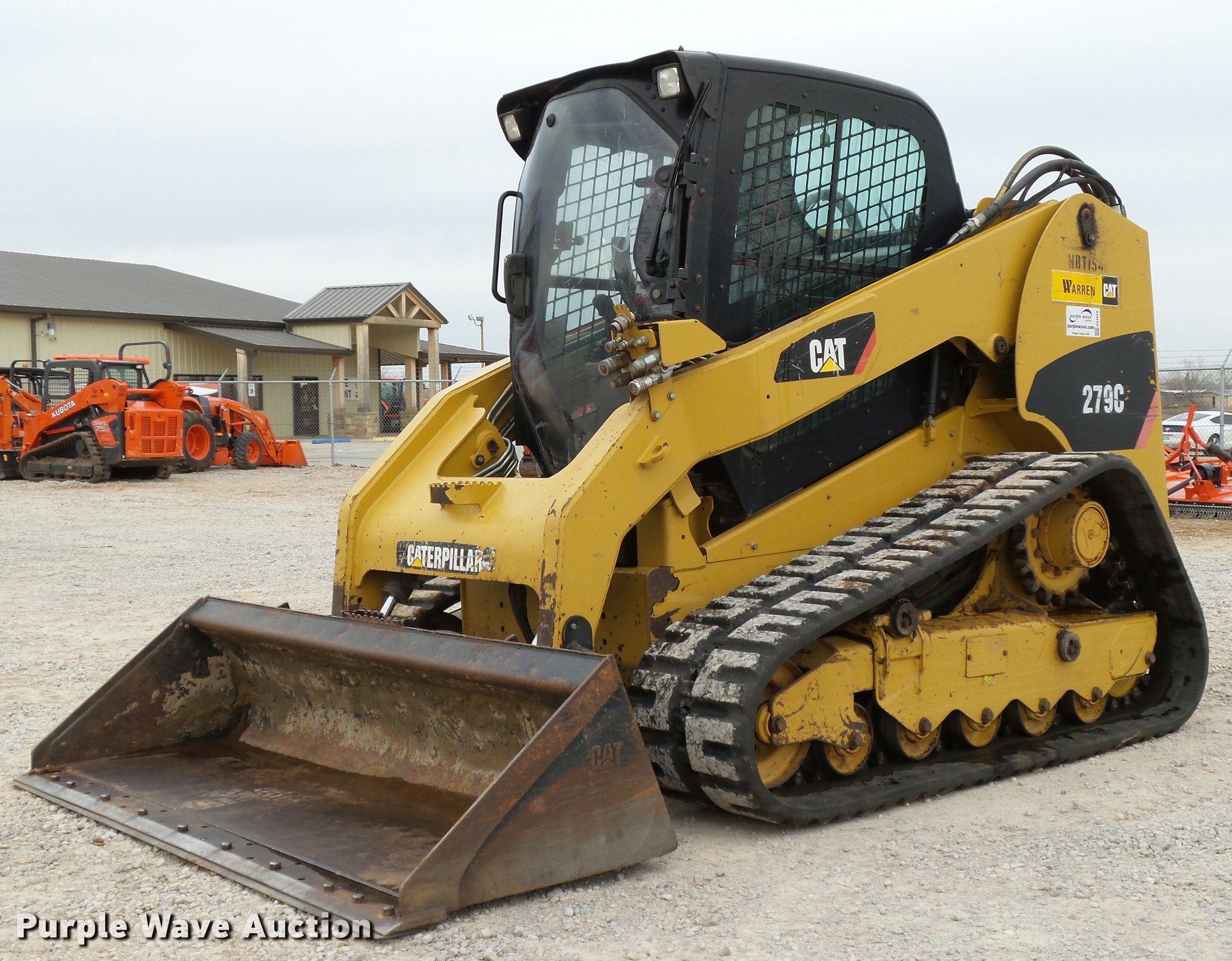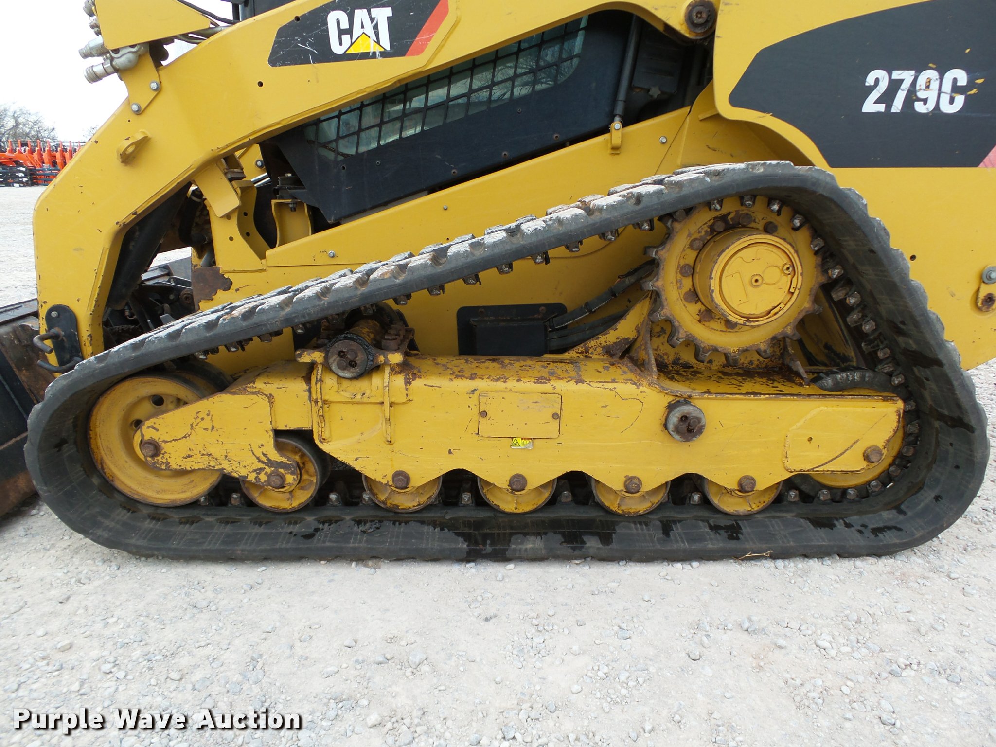 Purple Wave is selling a used Tracked Skid Steer Loader in Oklahoma. This item is a 2010 Caterpillar 279C skid steer with the following: 1,774 hours on meter, Caterpillar C3.4 3.4L four cylinder turbo diesel engine, 84 HP, Two speed hydrostatic transmission, Enclosed cab, AC and heat, Joystick controls, Spring suspension seat, Wipers, Front and rear work lights, Caterpillar 279-5376 80"W bucket, 0.62 cu.yd. capacity, Bolt-on cutting edge, Hydraulic quick coupler, High Flow auxiliary hydraulics, Auxiliary electrical outlet, 3,200 lbs rated operating capacity, Five bottom rollers, 17.5"W tracks, Serial CAT0279CKMBT01541