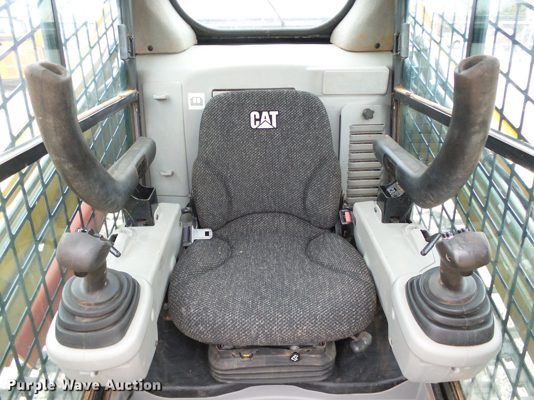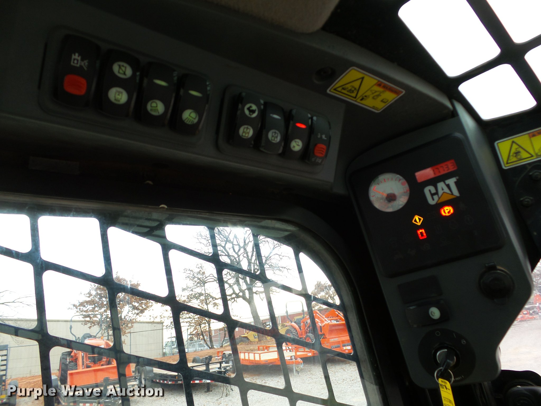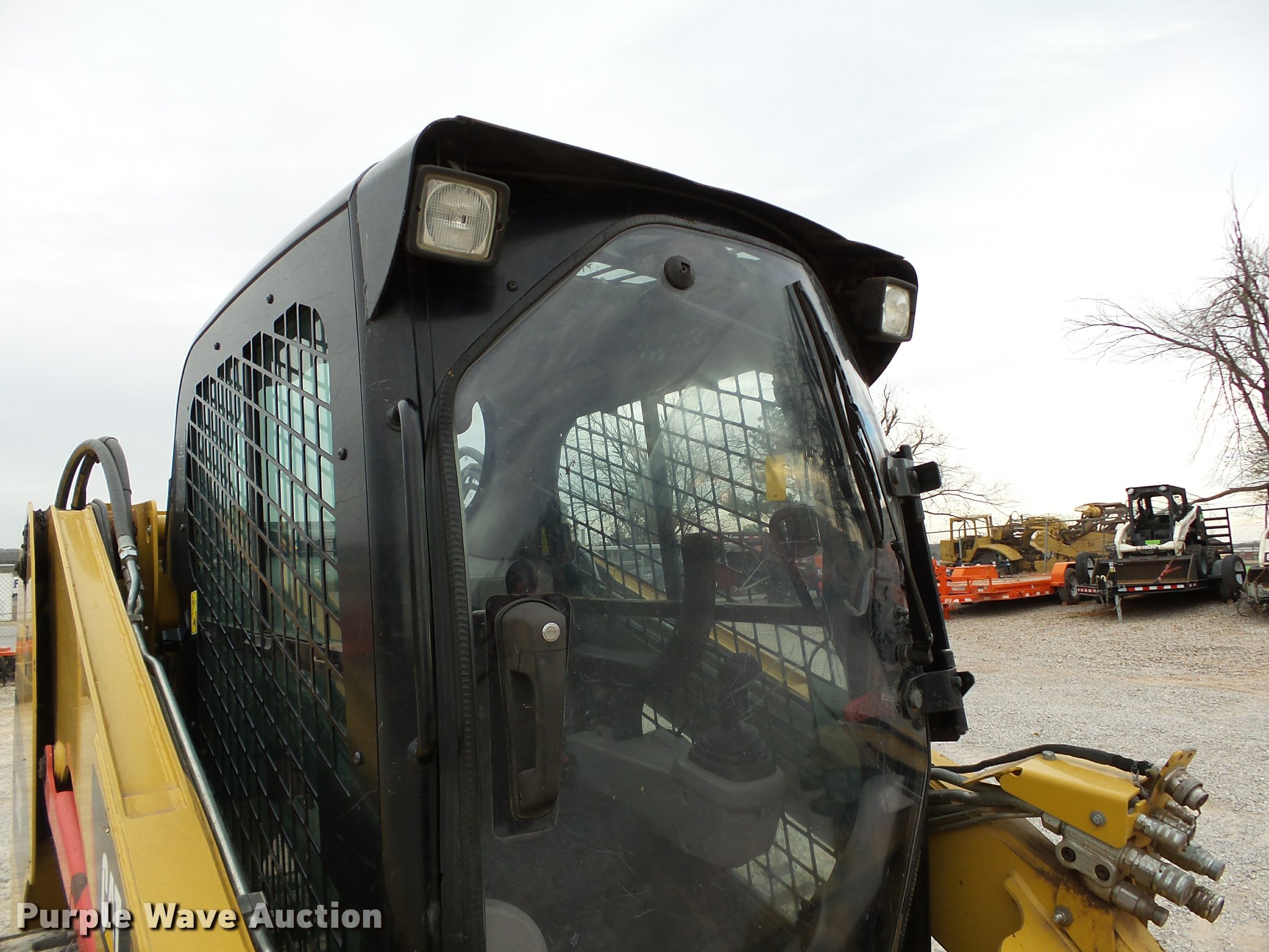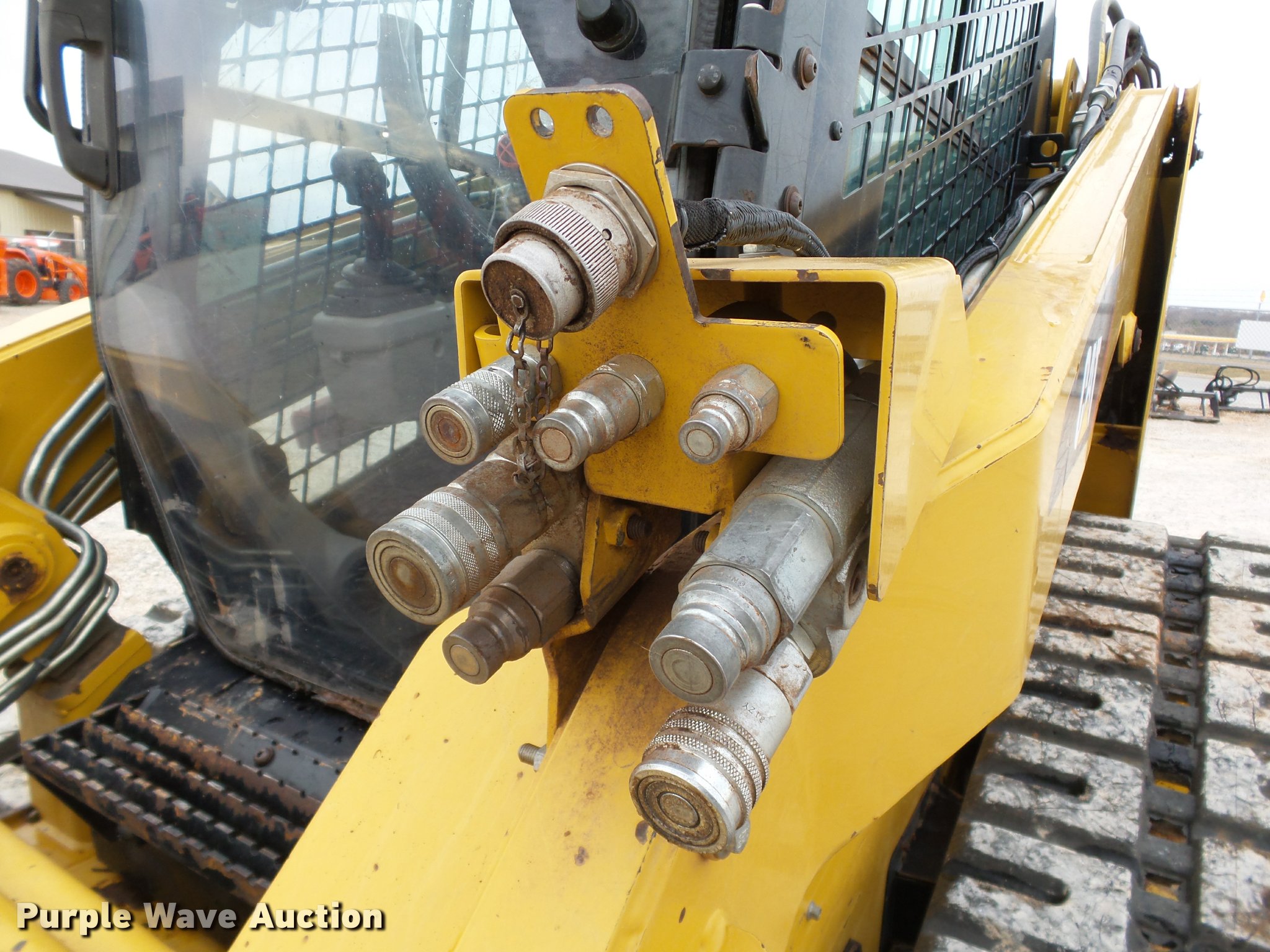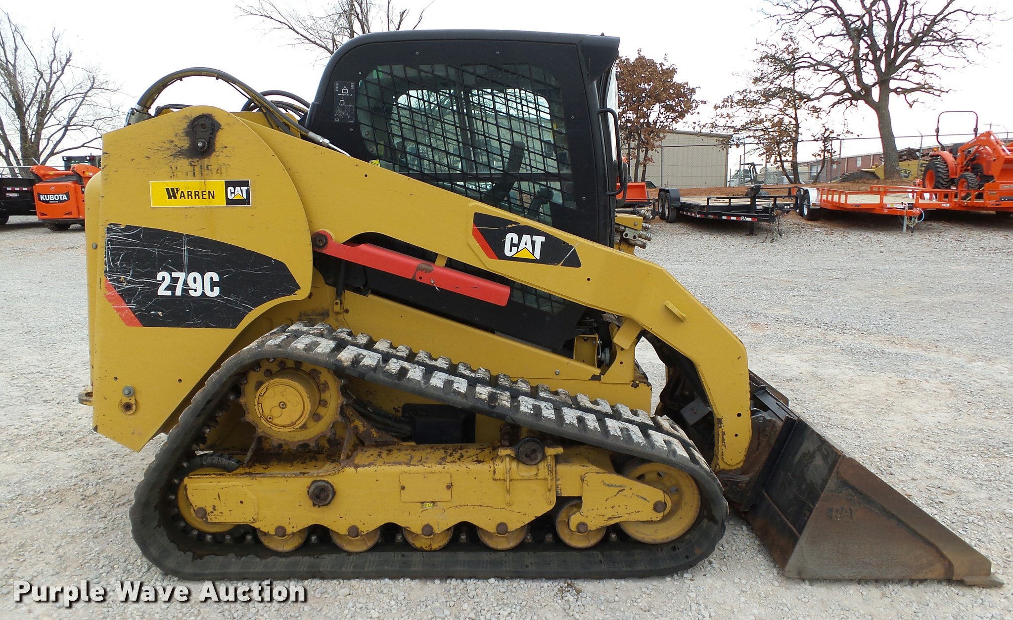 Purple Wave is selling a used Tracked Skid Steer Loader in Oklahoma. This item is a 2010 Caterpillar 279C skid steer with the following: 1,774 hours on meter, Caterpillar C3.4 3.4L four cylinder turbo diesel engine, 84 HP, Two speed hydrostatic transmission, Enclosed cab, AC and heat, Joystick controls, Spring suspension seat, Wipers, Front and rear work lights, Caterpillar 279-5376 80"W bucket, 0.62 cu.yd. capacity, Bolt-on cutting edge, Hydraulic quick coupler, High Flow auxiliary hydraulics, Auxiliary electrical outlet, 3,200 lbs rated operating capacity, Five bottom rollers, 17.5"W tracks, Serial CAT0279CKMBT01541