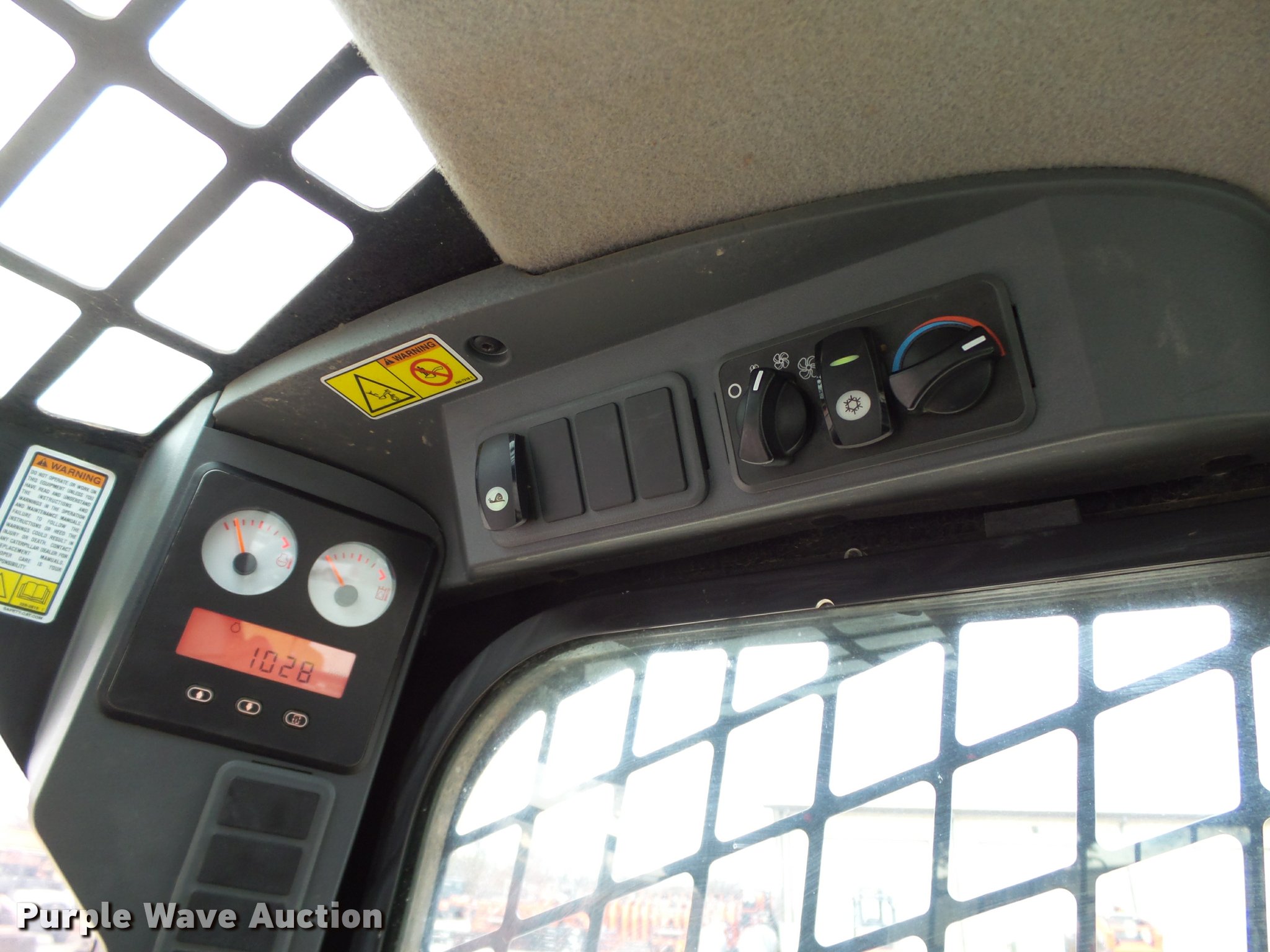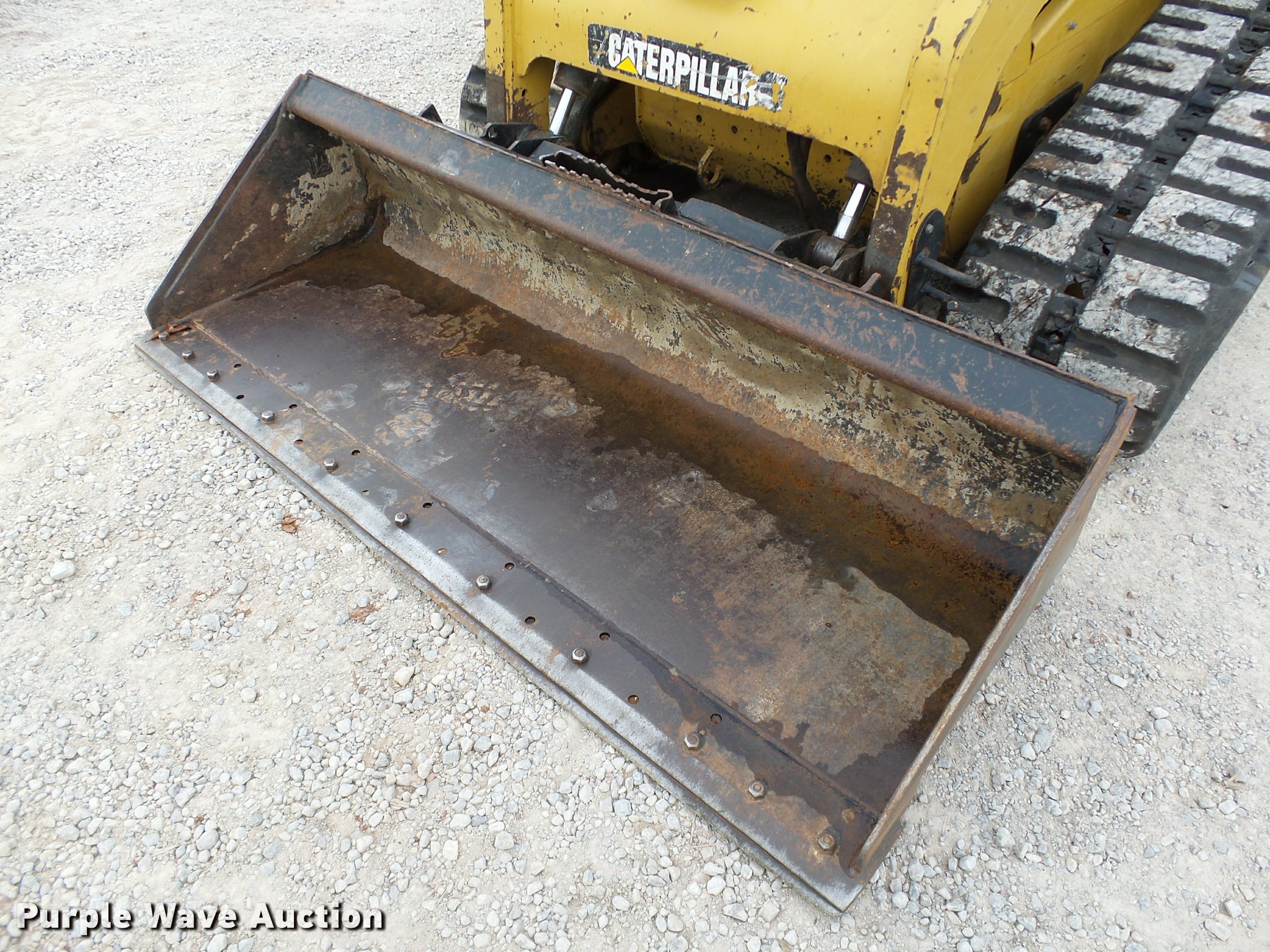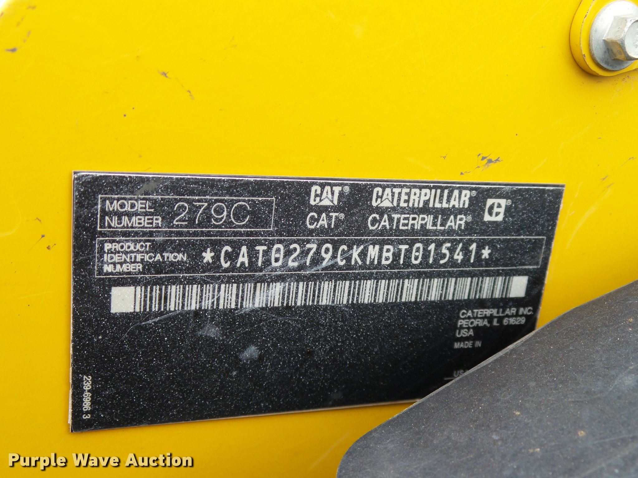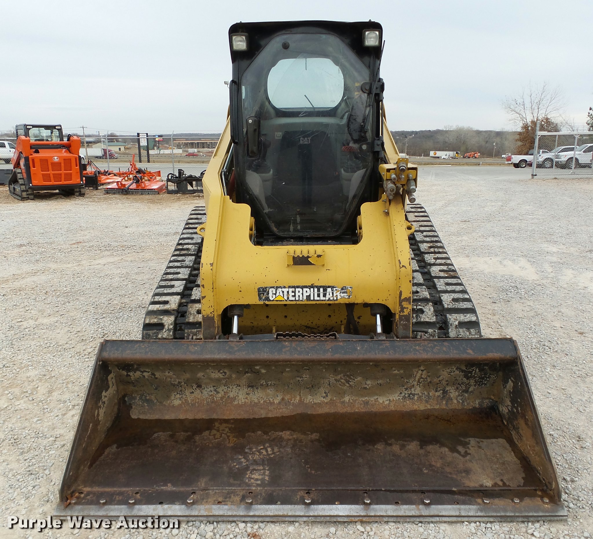 Purple Wave is selling a used Tracked Skid Steer Loader in Oklahoma. This item is a 2010 Caterpillar 279C skid steer with the following: 1,774 hours on meter, Caterpillar C3.4 3.4L four cylinder turbo diesel engine, 84 HP, Two speed hydrostatic transmission, Enclosed cab, AC and heat, Joystick controls, Spring suspension seat, Wipers, Front and rear work lights, Caterpillar 279-5376 80"W bucket, 0.62 cu.yd. capacity, Bolt-on cutting edge, Hydraulic quick coupler, High Flow auxiliary hydraulics, Auxiliary electrical outlet, 3,200 lbs rated operating capacity, Five bottom rollers, 17.5"W tracks, Serial CAT0279CKMBT01541