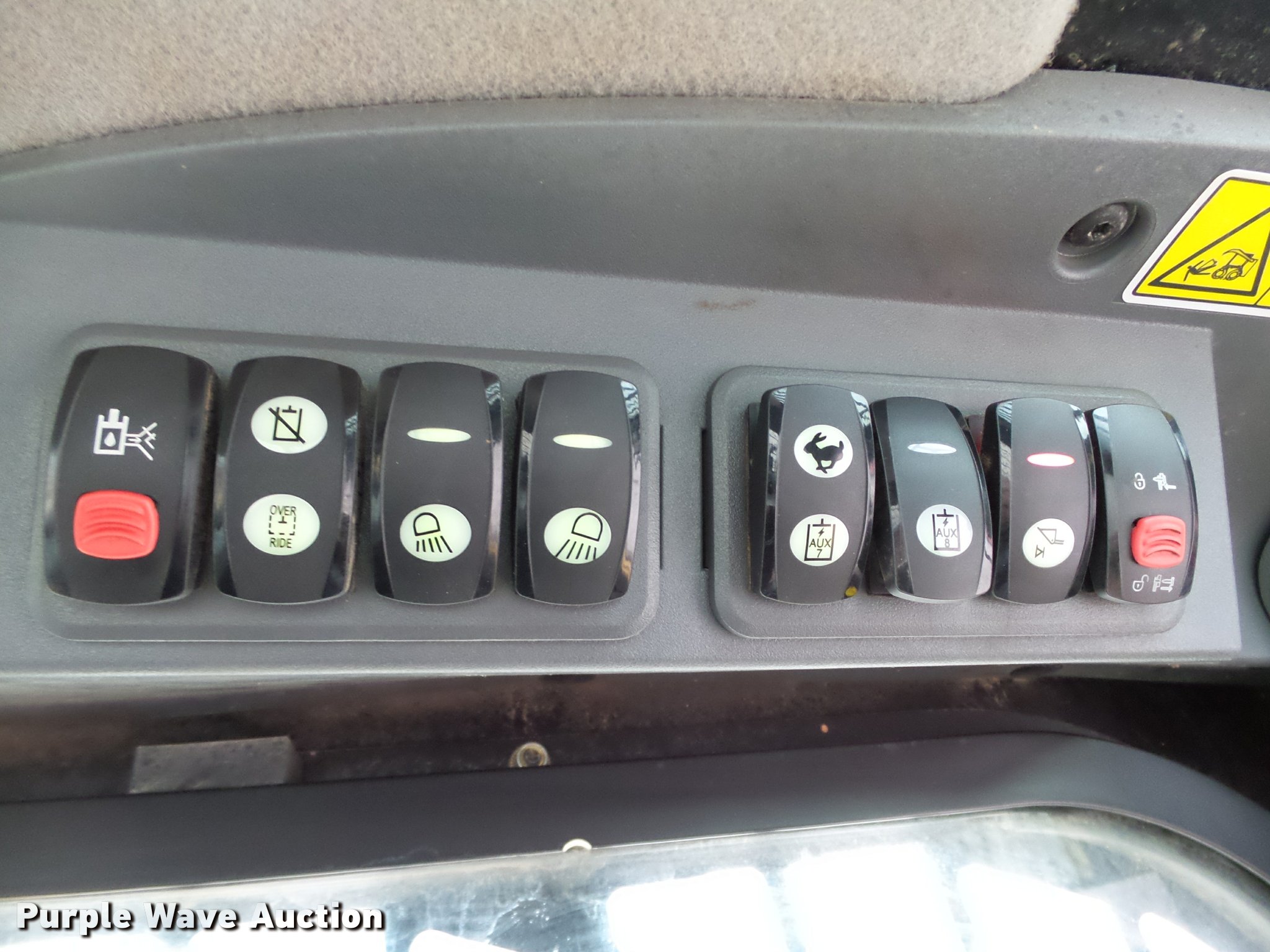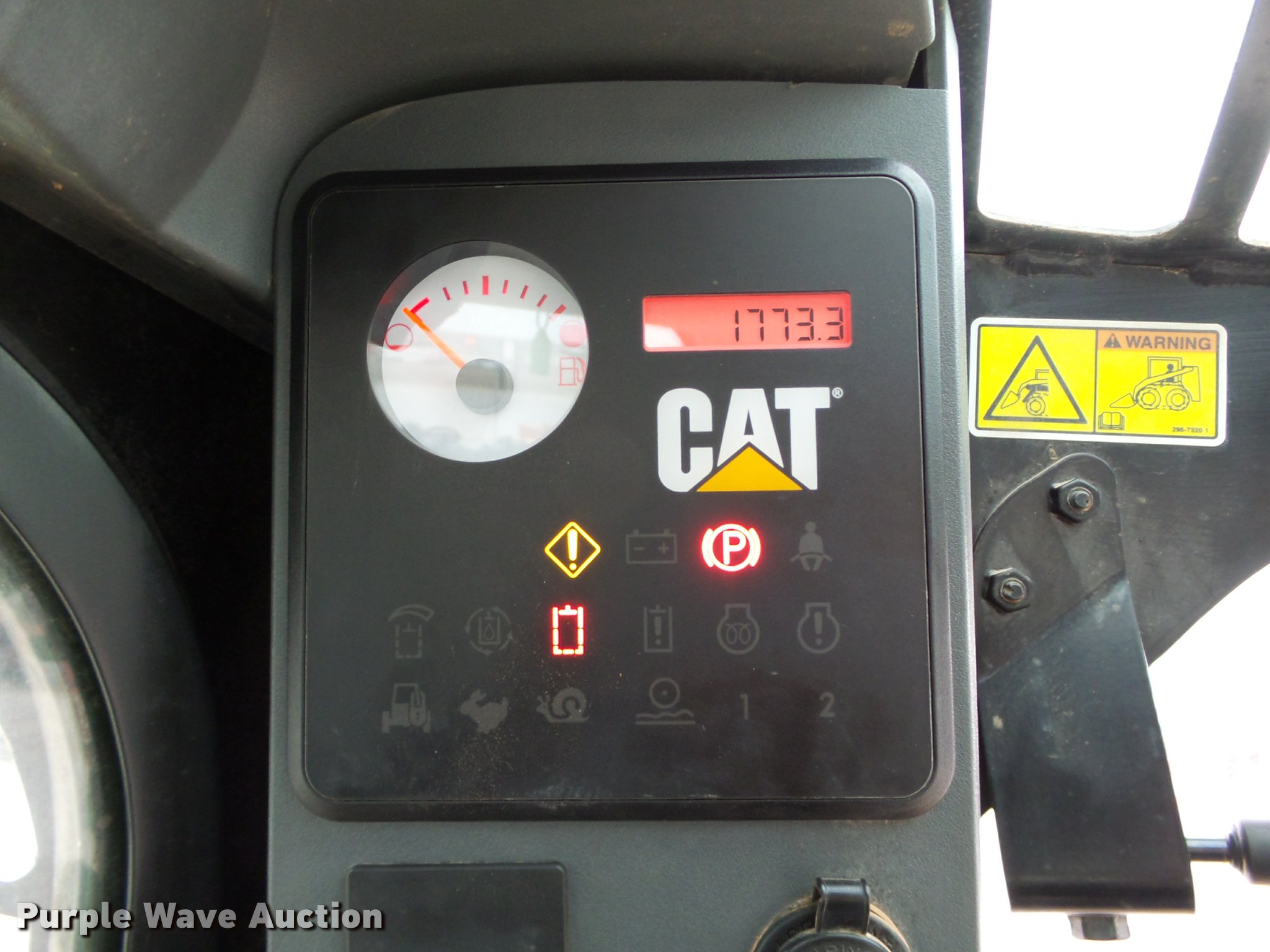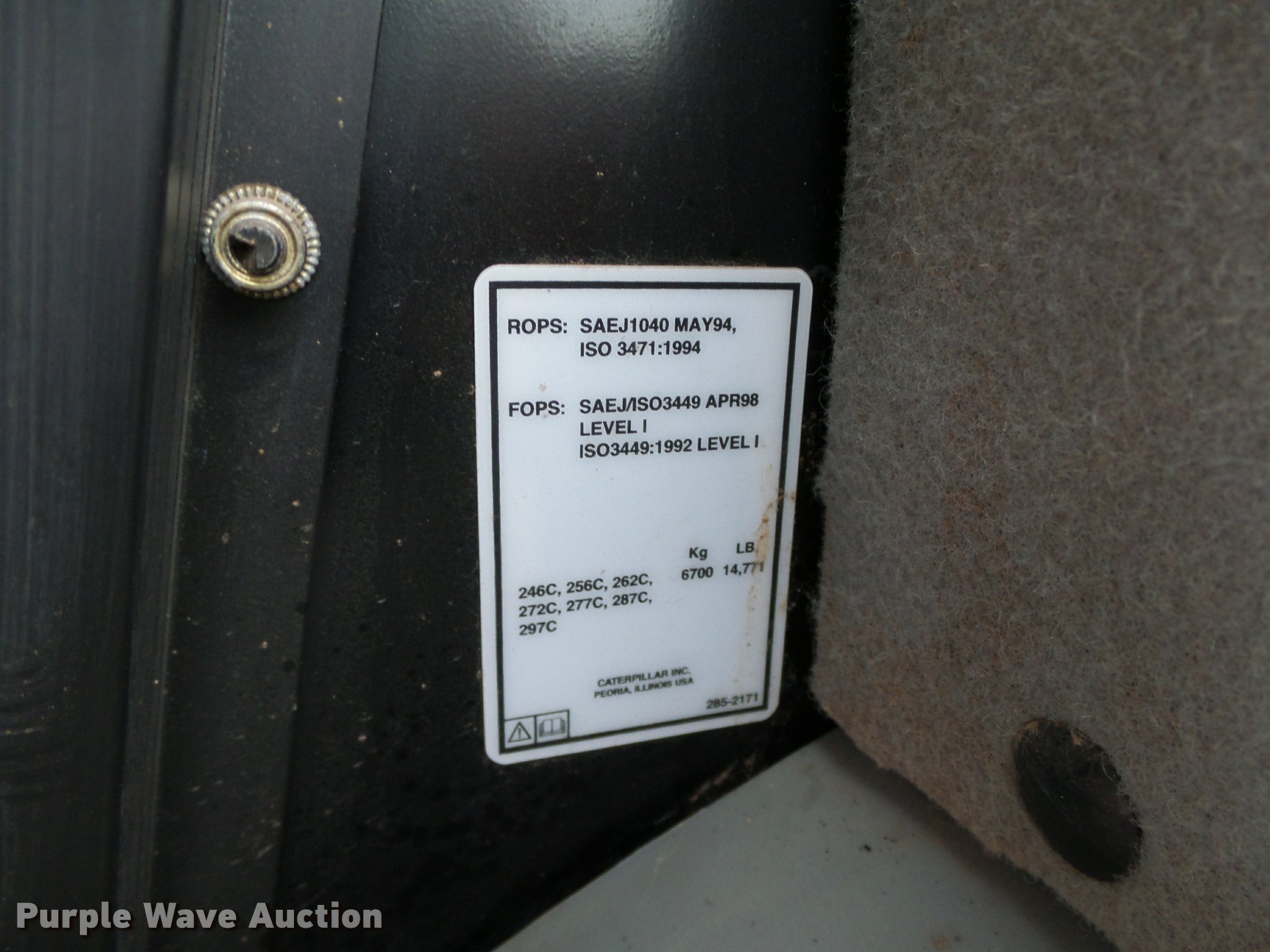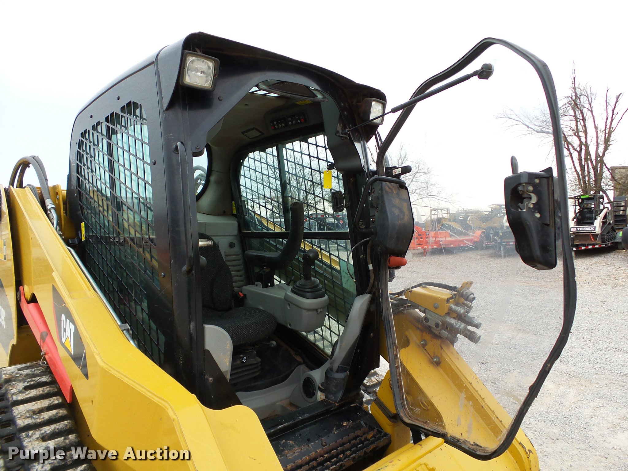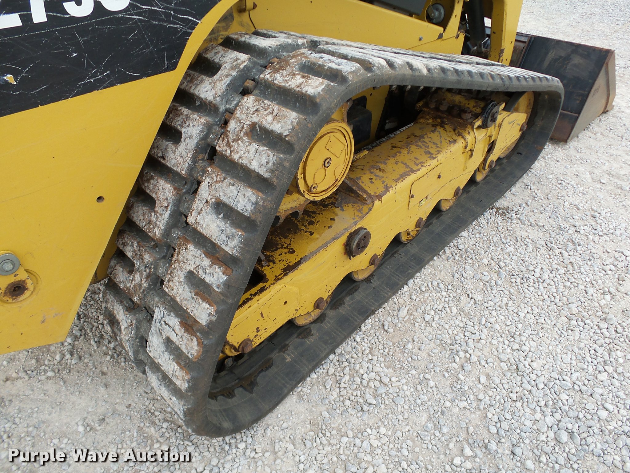 Purple Wave is selling a used Tracked Skid Steer Loader in Oklahoma. This item is a 2010 Caterpillar 279C skid steer with the following: 1,774 hours on meter, Caterpillar C3.4 3.4L four cylinder turbo diesel engine, 84 HP, Two speed hydrostatic transmission, Enclosed cab, AC and heat, Joystick controls, Spring suspension seat, Wipers, Front and rear work lights, Caterpillar 279-5376 80"W bucket, 0.62 cu.yd. capacity, Bolt-on cutting edge, Hydraulic quick coupler, High Flow auxiliary hydraulics, Auxiliary electrical outlet, 3,200 lbs rated operating capacity, Five bottom rollers, 17.5"W tracks, Serial CAT0279CKMBT01541