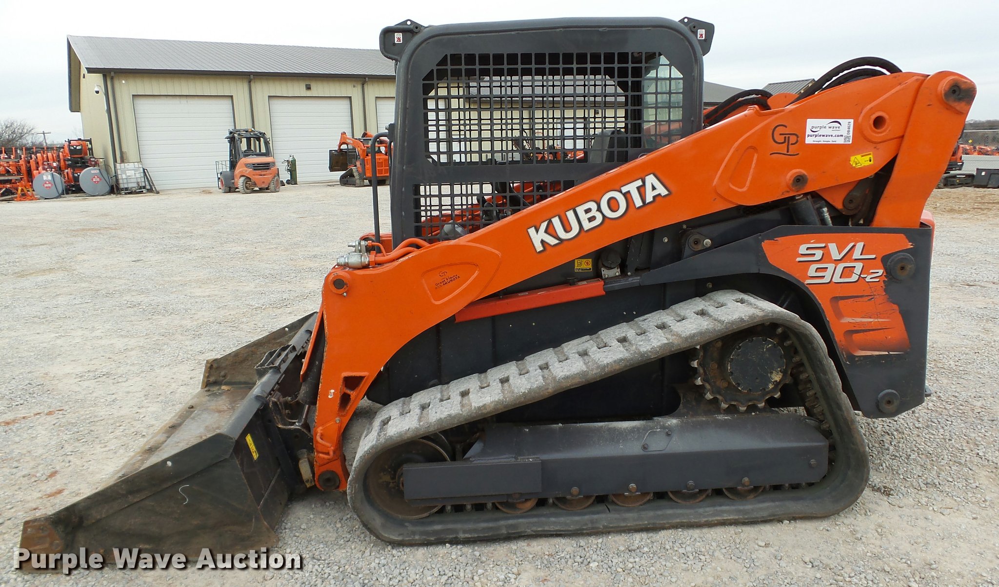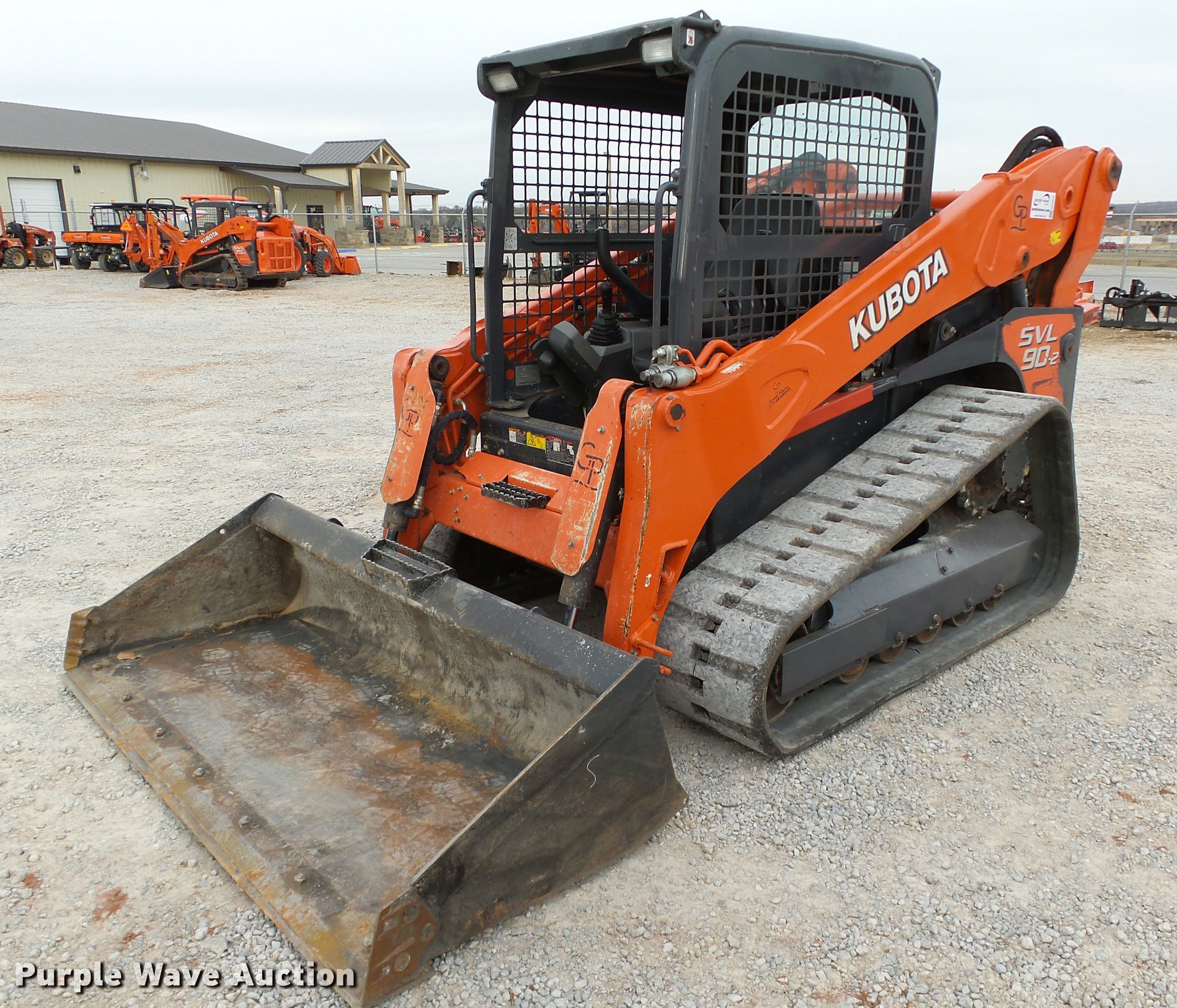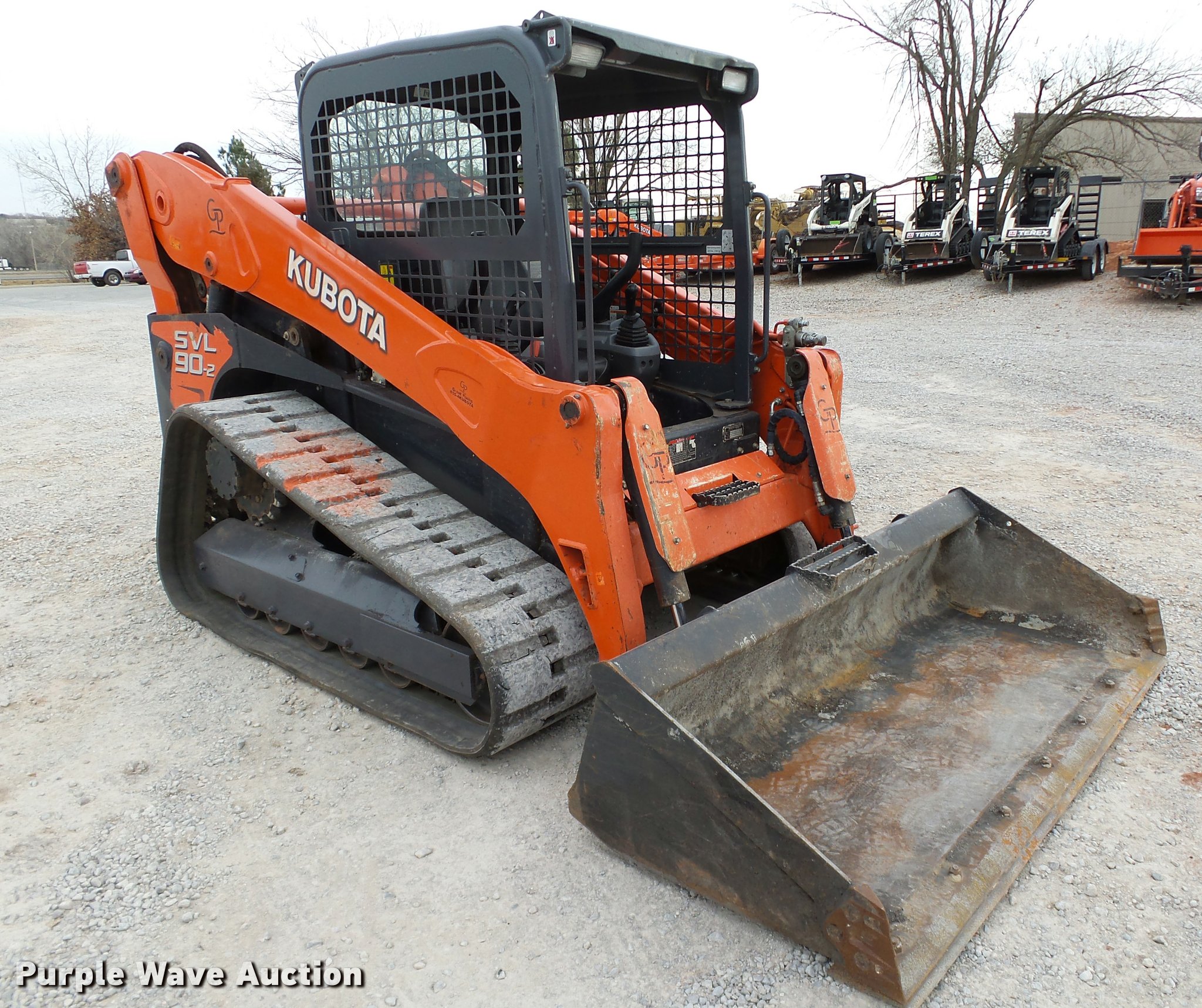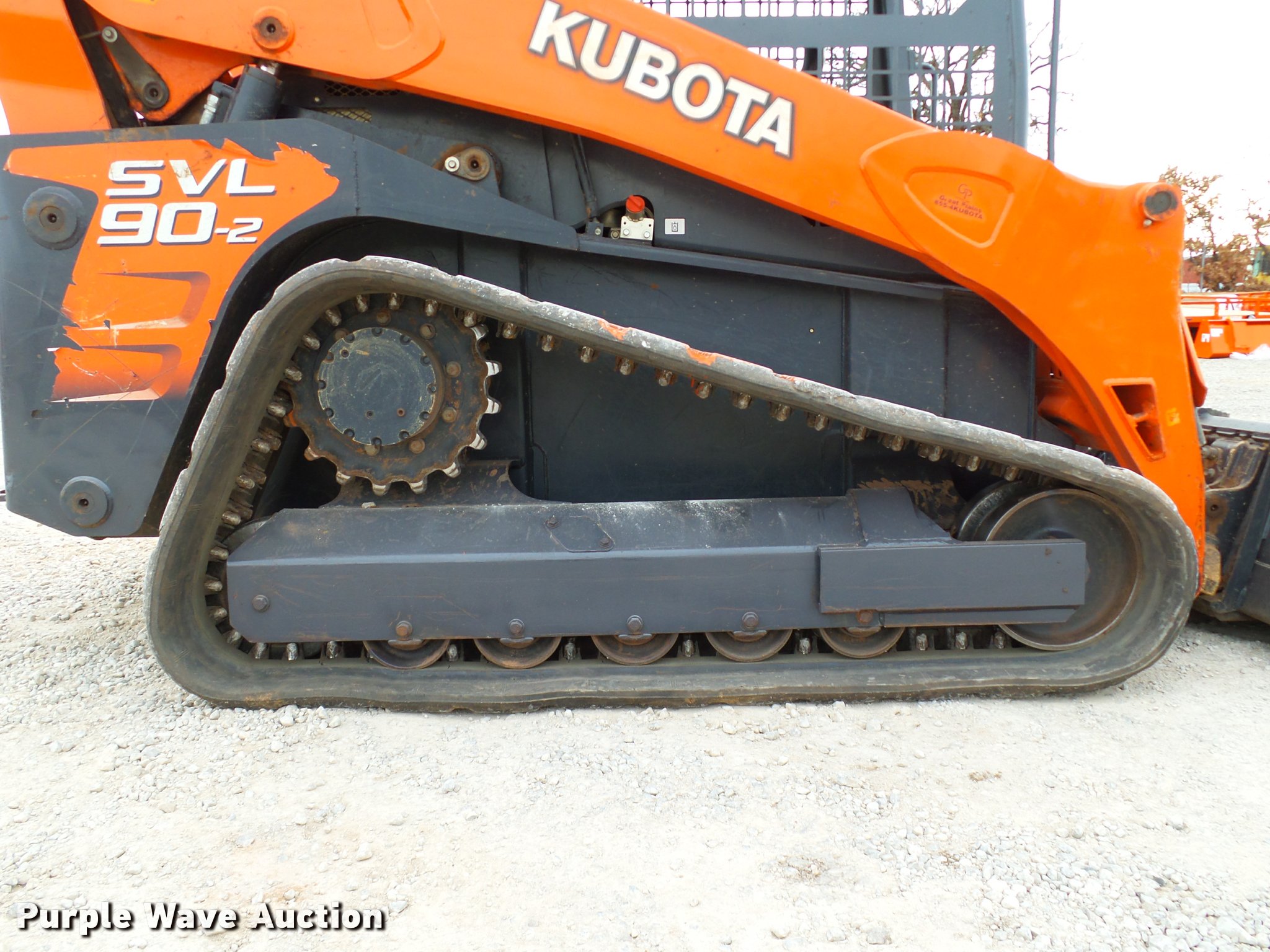 Purple Wave is selling a used Tracked Skid Steer Loader in Oklahoma. This item is a 2014 Kubota SVL90-2 skid steer with the following: 987 hours on meter, Kubota V3800 3.8L four cylinder turbo diesel engine, 90 HP, Two speed hydrostatic transmission, Open station/canopy, Joystick controls, Spring suspension seat, Kubota S6606 80"W bucket, Bolt-on cutting edge, Manual quick coupler, Auxiliary hydraulics, 3,010 rated operating capacity, Five bottom rollers, Bridgestone 18"W tracks, Serial 12668