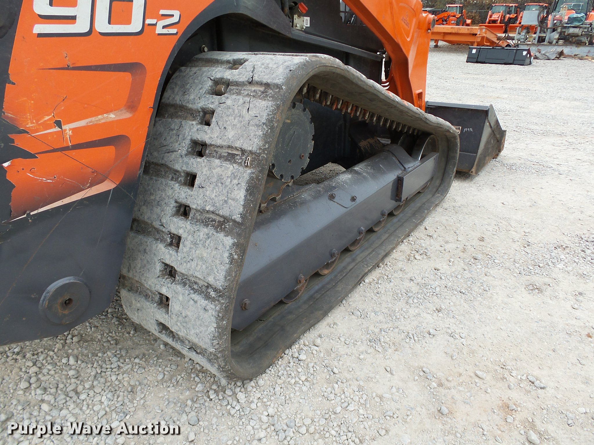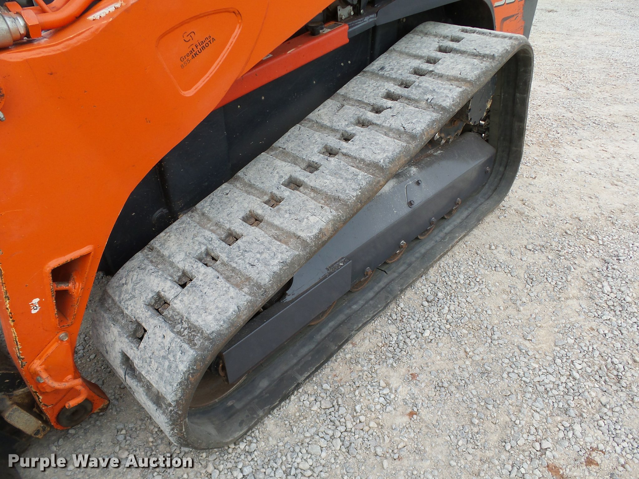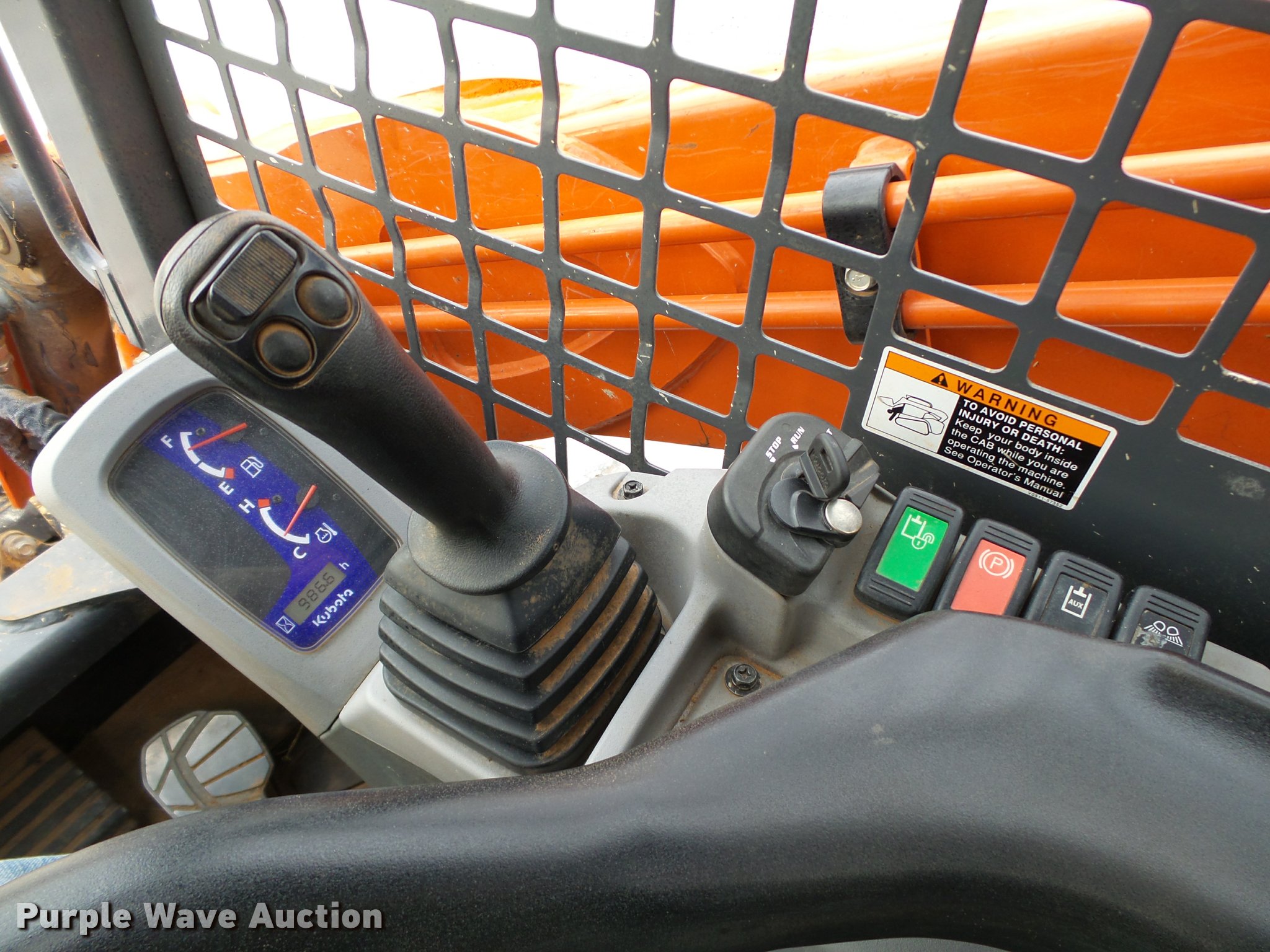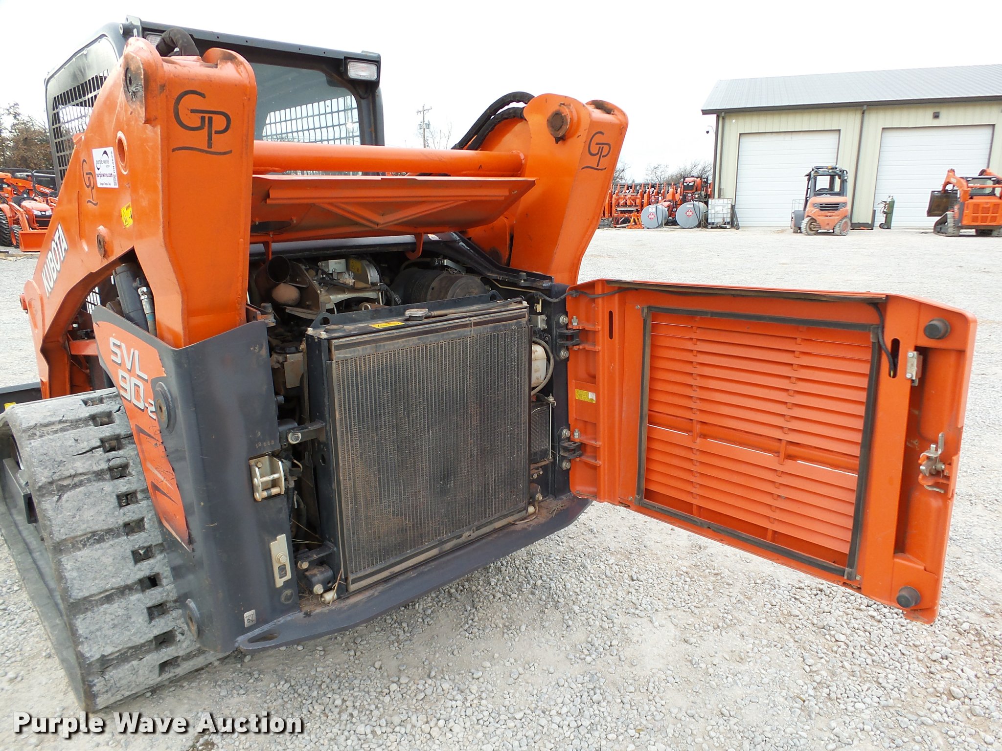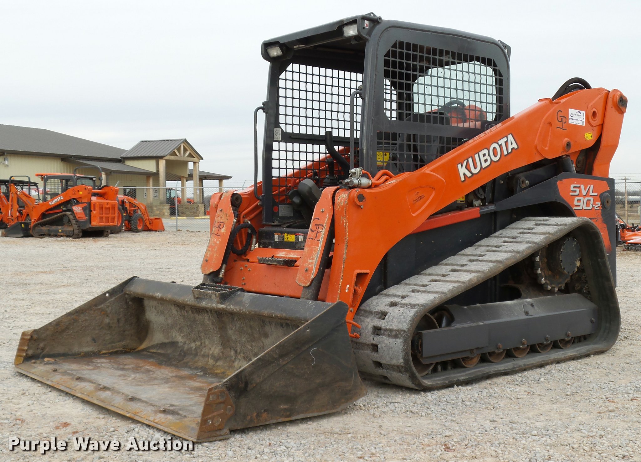 Purple Wave is selling a used Tracked Skid Steer Loader in Oklahoma. This item is a 2014 Kubota SVL90-2 skid steer with the following: 987 hours on meter, Kubota V3800 3.8L four cylinder turbo diesel engine, 90 HP, Two speed hydrostatic transmission, Open station/canopy, Joystick controls, Spring suspension seat, Kubota S6606 80"W bucket, Bolt-on cutting edge, Manual quick coupler, Auxiliary hydraulics, 3,010 rated operating capacity, Five bottom rollers, Bridgestone 18"W tracks, Serial 12668