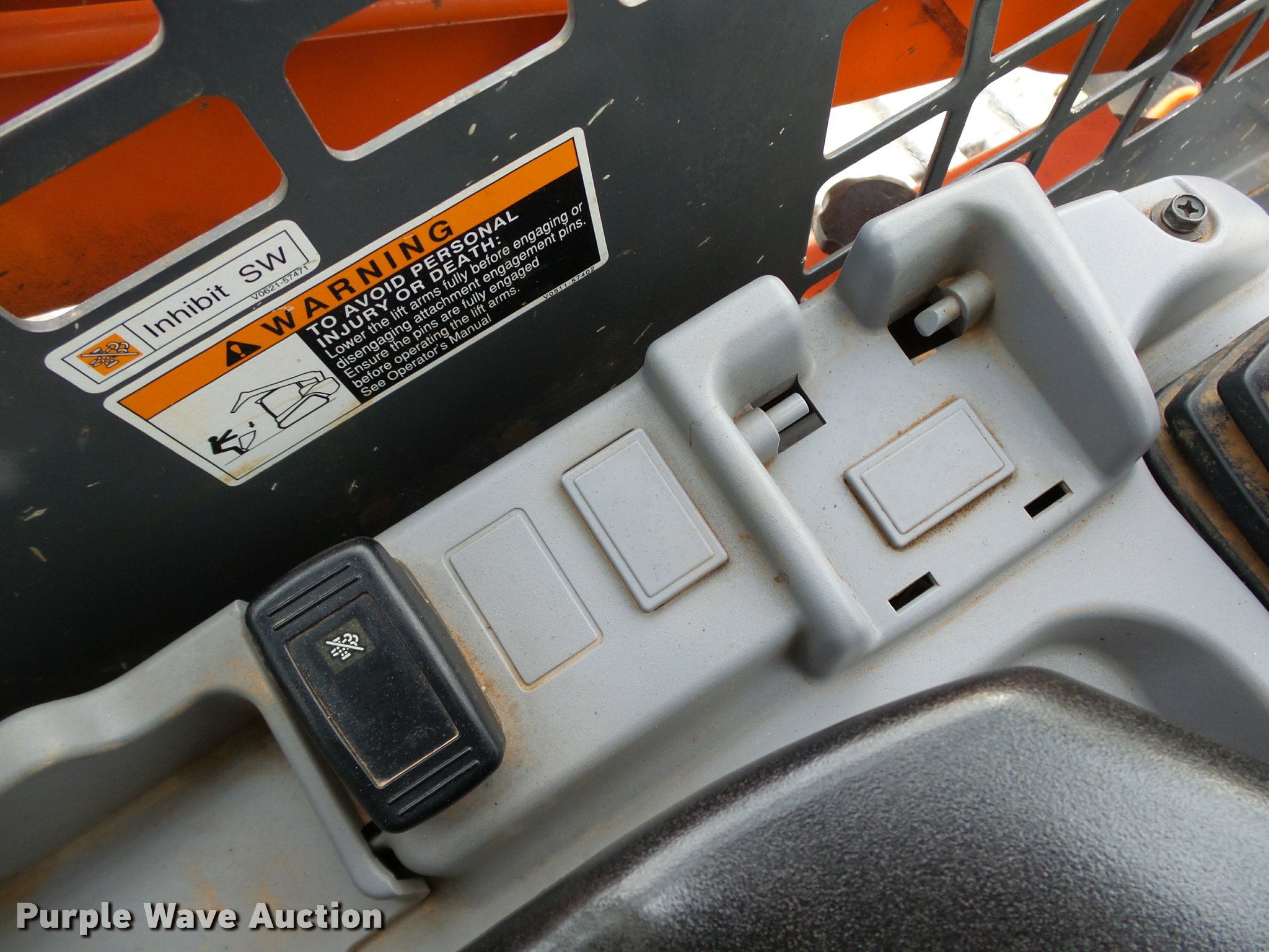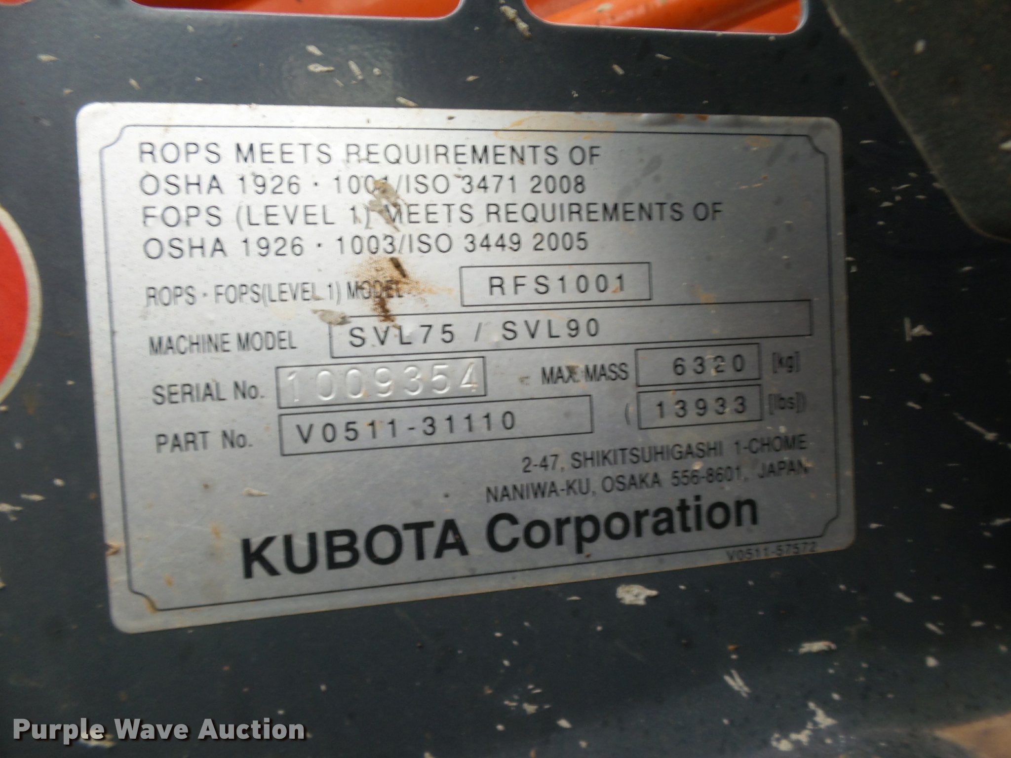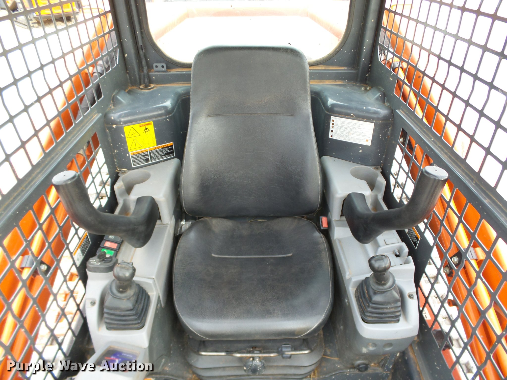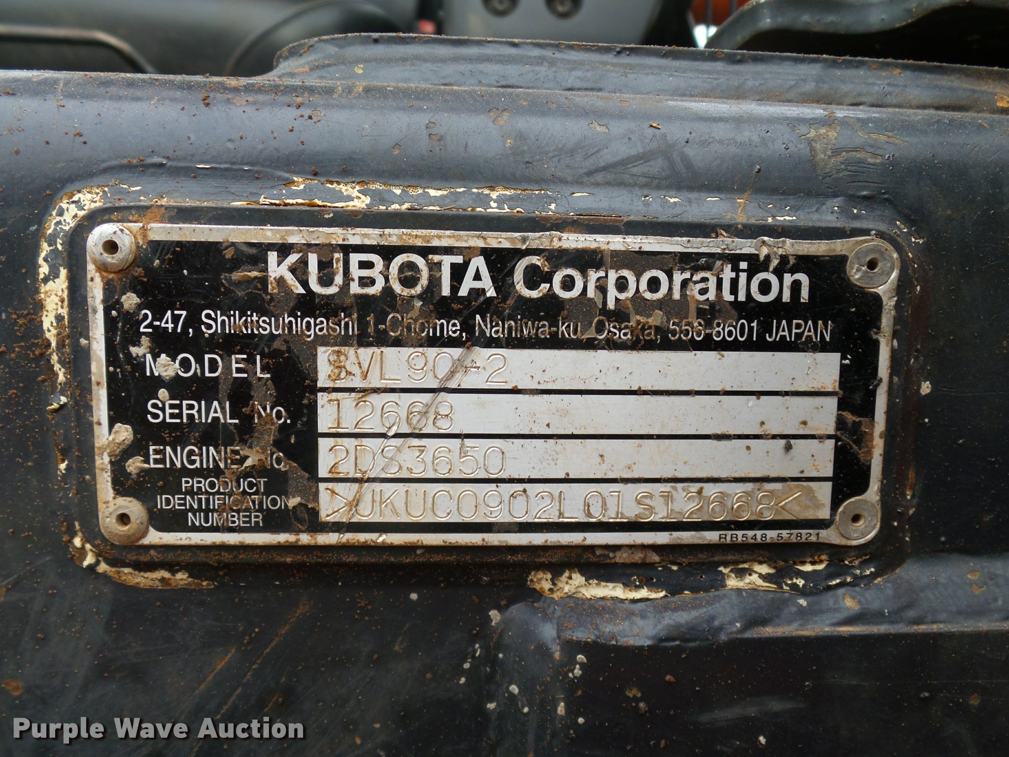 Purple Wave is selling a used Tracked Skid Steer Loader in Oklahoma. This item is a 2014 Kubota SVL90-2 skid steer with the following: 987 hours on meter, Kubota V3800 3.8L four cylinder turbo diesel engine, 90 HP, Two speed hydrostatic transmission, Open station/canopy, Joystick controls, Spring suspension seat, Kubota S6606 80"W bucket, Bolt-on cutting edge, Manual quick coupler, Auxiliary hydraulics, 3,010 rated operating capacity, Five bottom rollers, Bridgestone 18"W tracks, Serial 12668