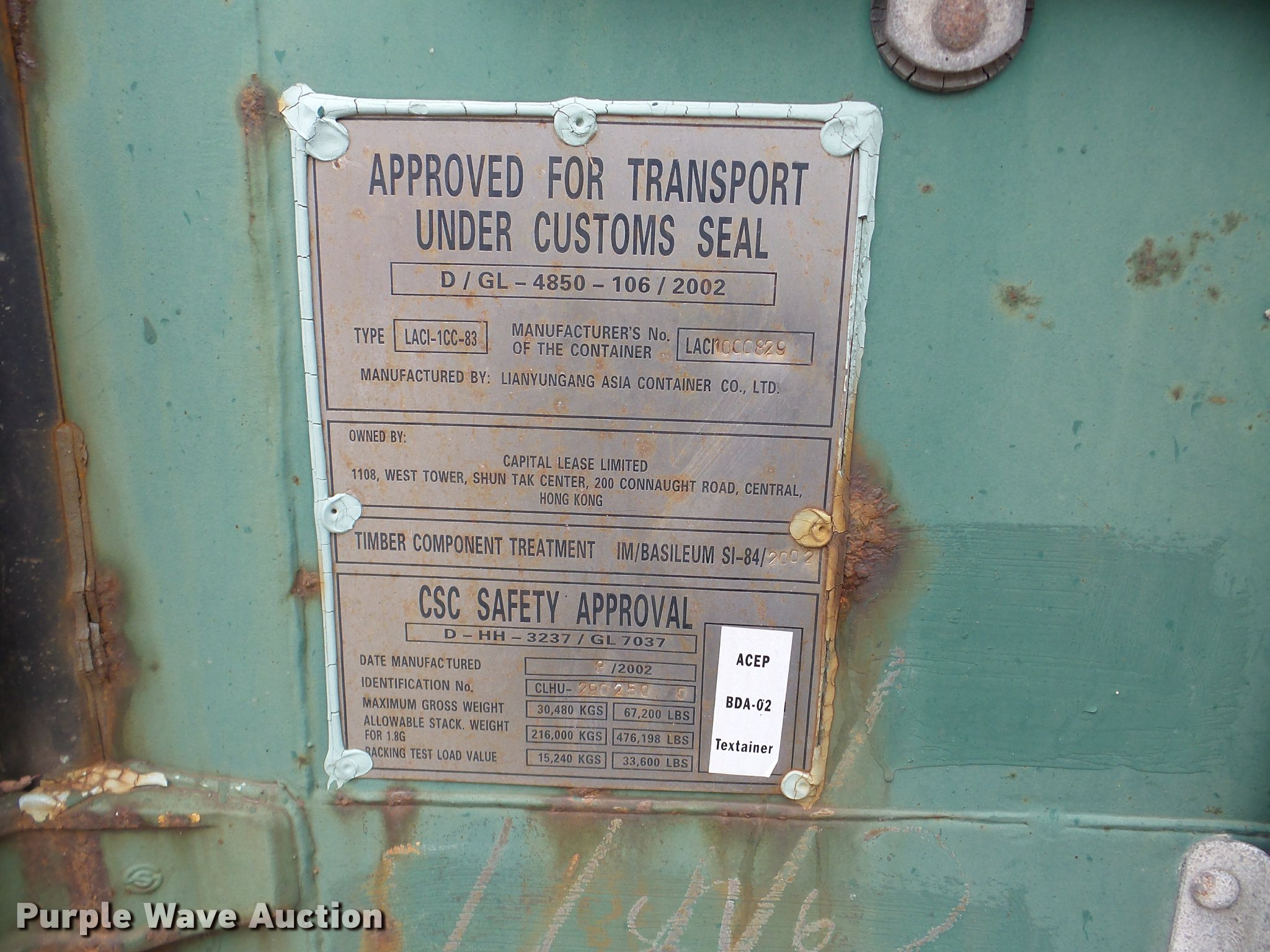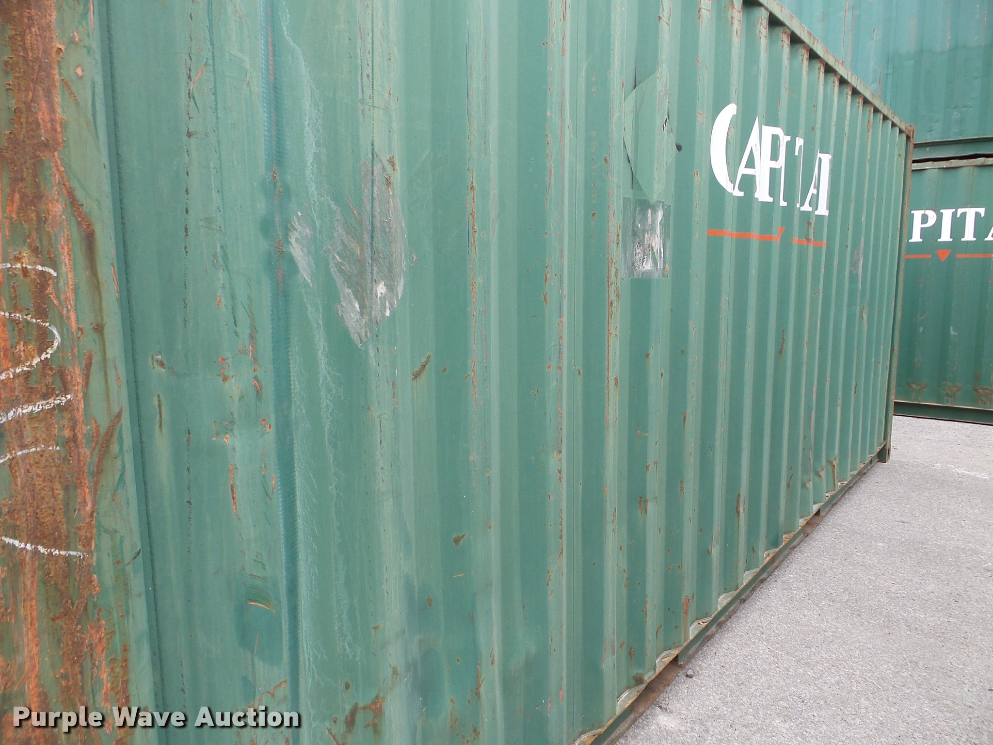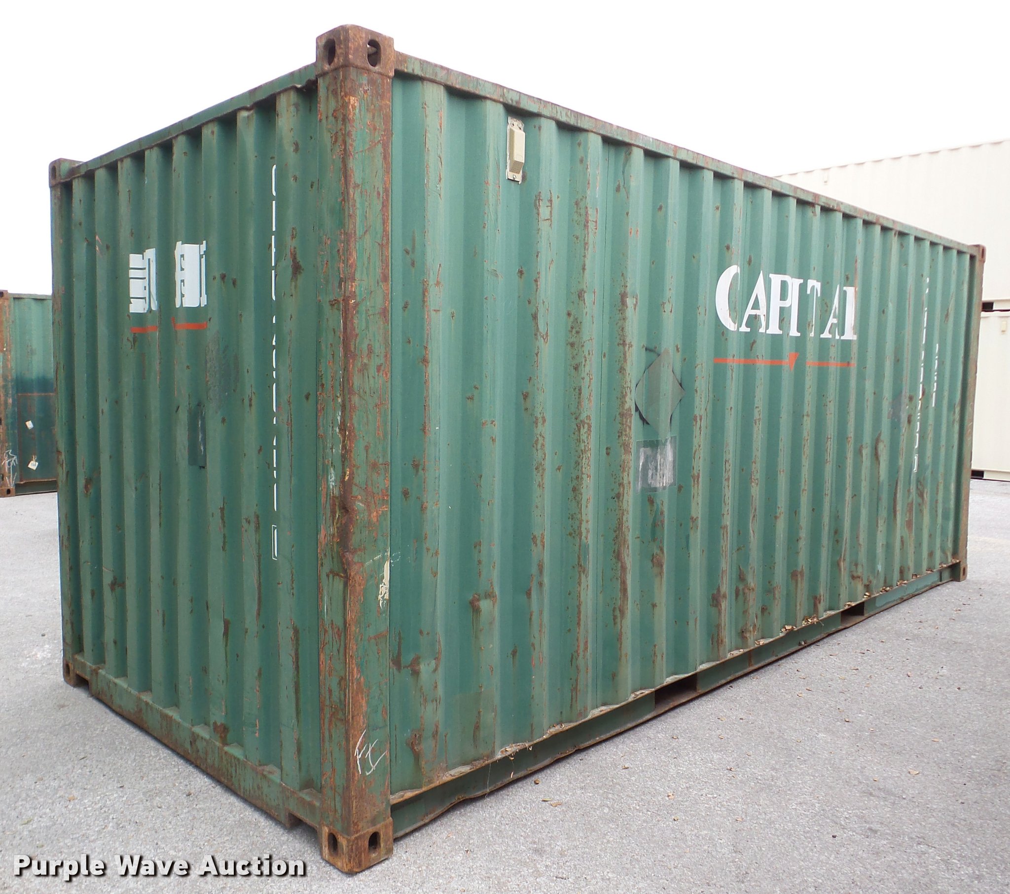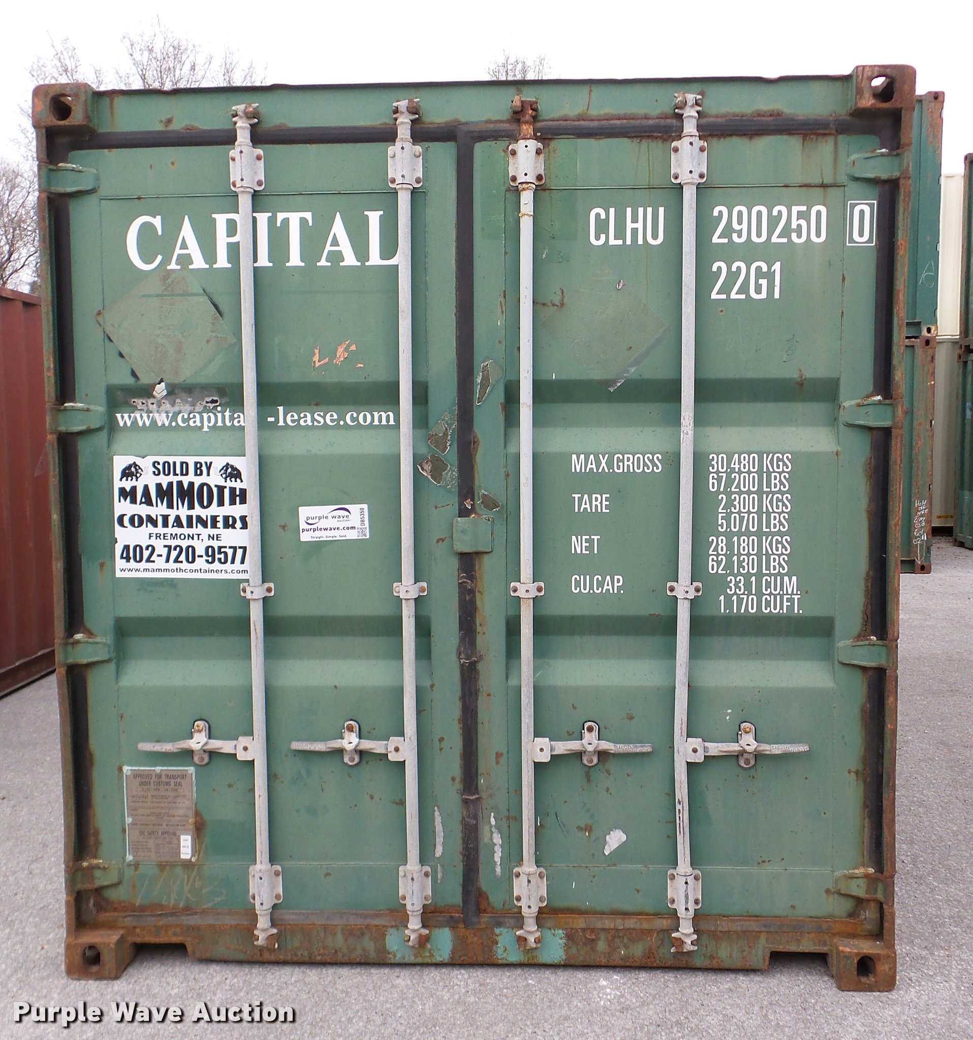 Purple Wave is selling a used Storage or Shipping Container in Nebraska. This item is a Capital storage container with the following: Approximately 20'L x 8'W x 8'H O.D., Approximately 19'4"L x 92.5"W x 95"H I.D., 57,200 lbs maximum gross weight, 4,890 lbs tare weight, 62,394 lbs net capacity, 1,173 cu.ft. capacity, Locking doors, Forklift pockets, Lifting eyes, Serial 290250