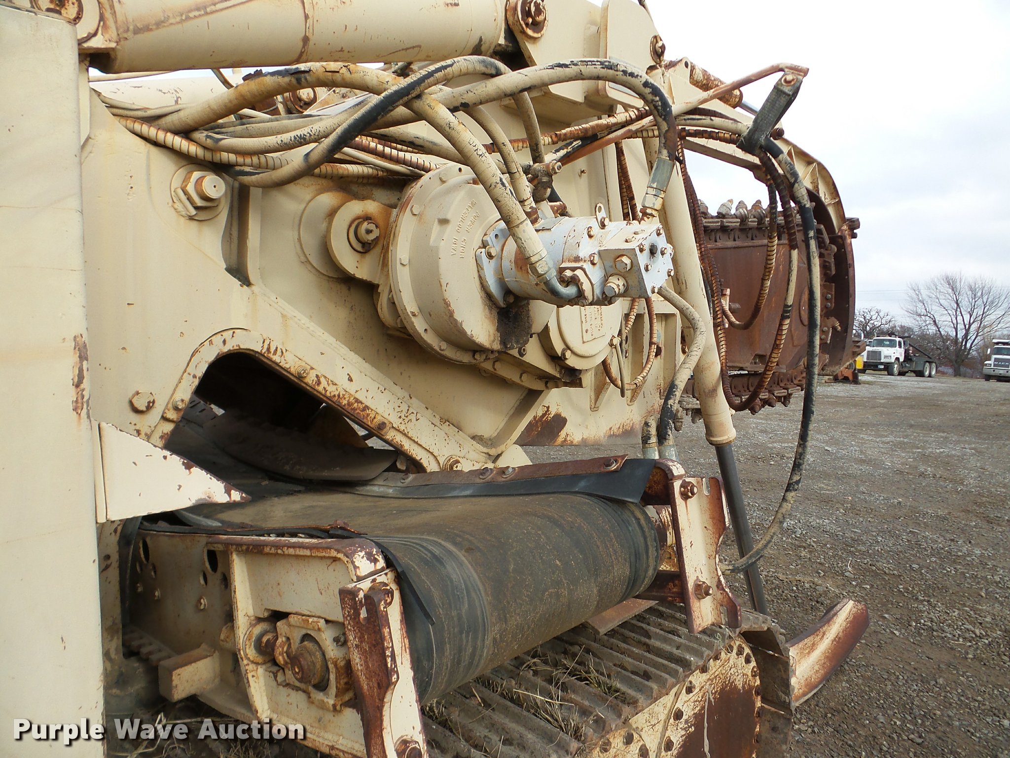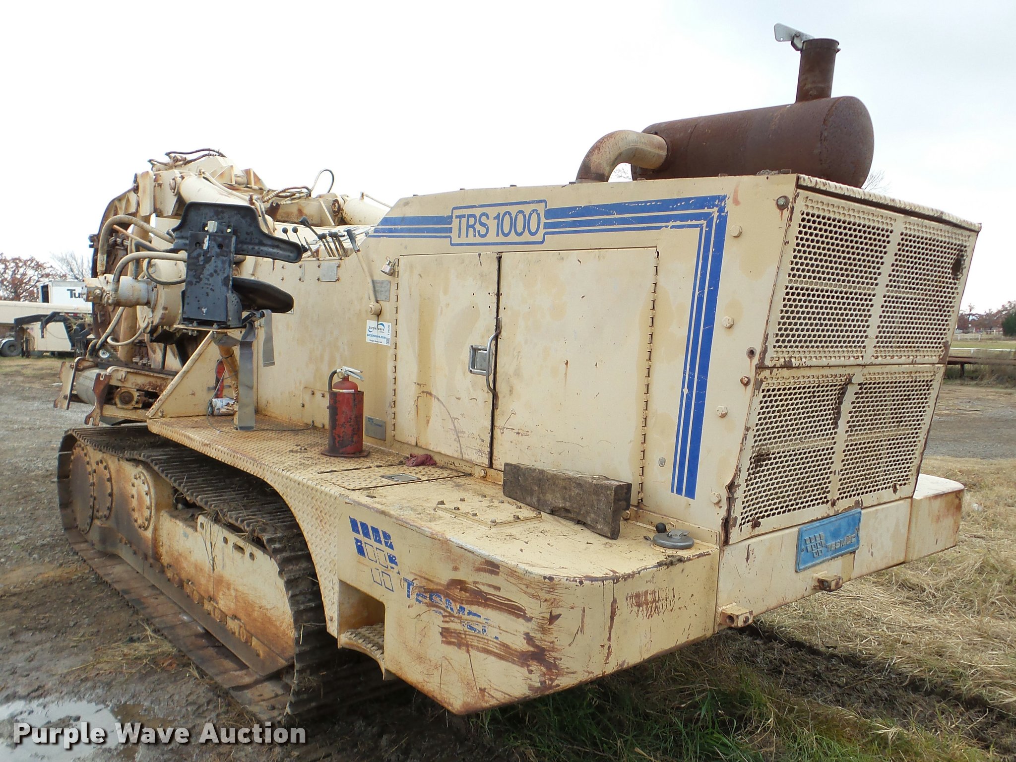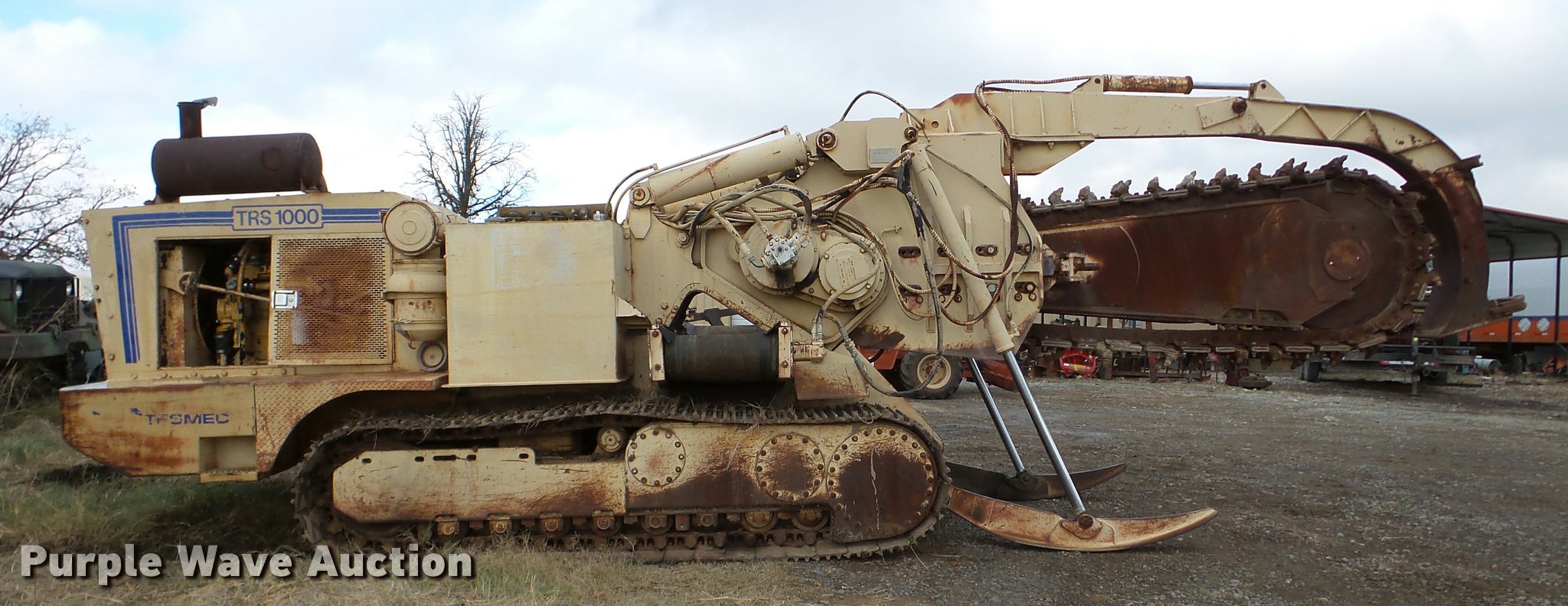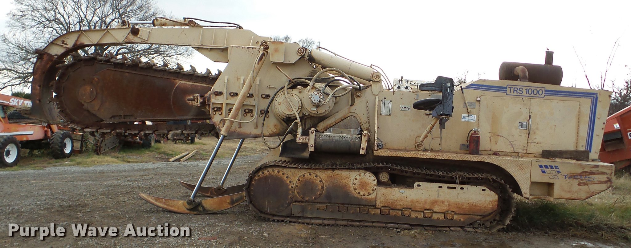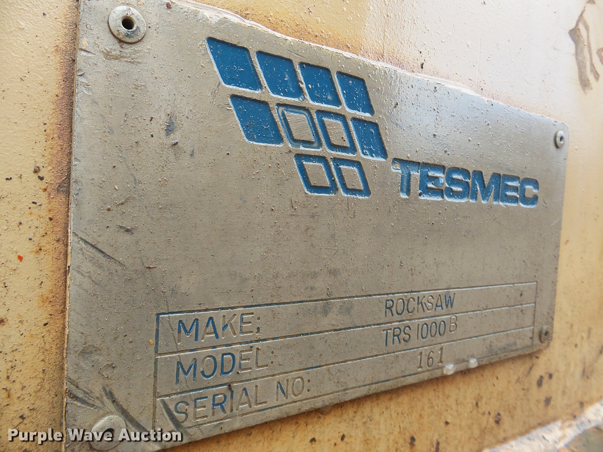 Purple Wave is selling a used Trencher or Rock Saw in Oklahoma. This item is a 1990 Tesmec TRS1000B trencher with the following: 590 hours on meter, Six cylinder diesel engine, Four speed manual transmission, Main clutch control, 13' maximum trenching depth, 13" cutting width, 24" side conveyor, Side shift, PEMSRF41 primary hydraulic motor, 24"W triple grouser track pads, 68,000 lbs. base operating weight, Engine door missing, Serial 161