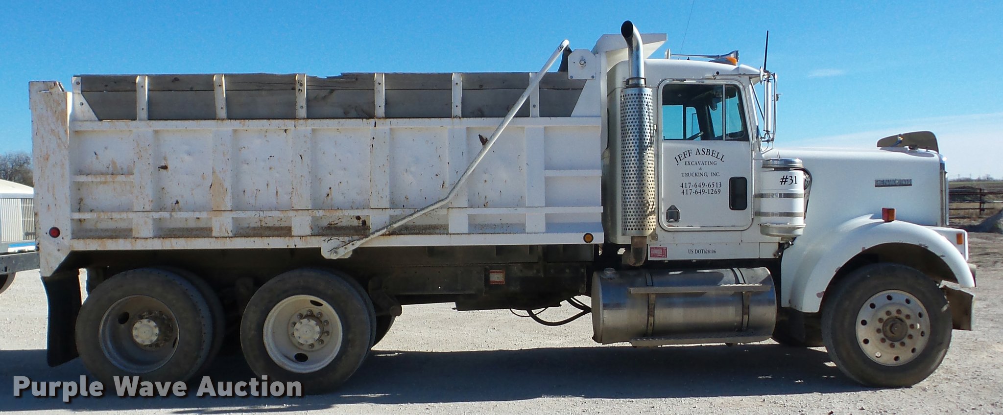 1985 Kenworth W900L dump truck. 369,721 miles on odometer, Caterpillar 3406 six cylinder turbo diesel engine, Eaton Fuller 13 speed manual transmission, Tandem axle, Inter-axle differential lock, Heat, AM/FM/cassette, Air suspension seat, PTO, 15'L x 8'W steel dump bed 36" side height, 15" side board height, Single ram hoist, Air operated end gate, Electric roll tarp, Single fuel tank, Spring suspension, Air brakes, Engine brake, 11R24.5 front tires, 285/75R24.5 rear tires, Unit# 31. Missouri title. 1XKWDB9X9FK326715. 9400 State Highway 171. Carl Junction, MO 64834