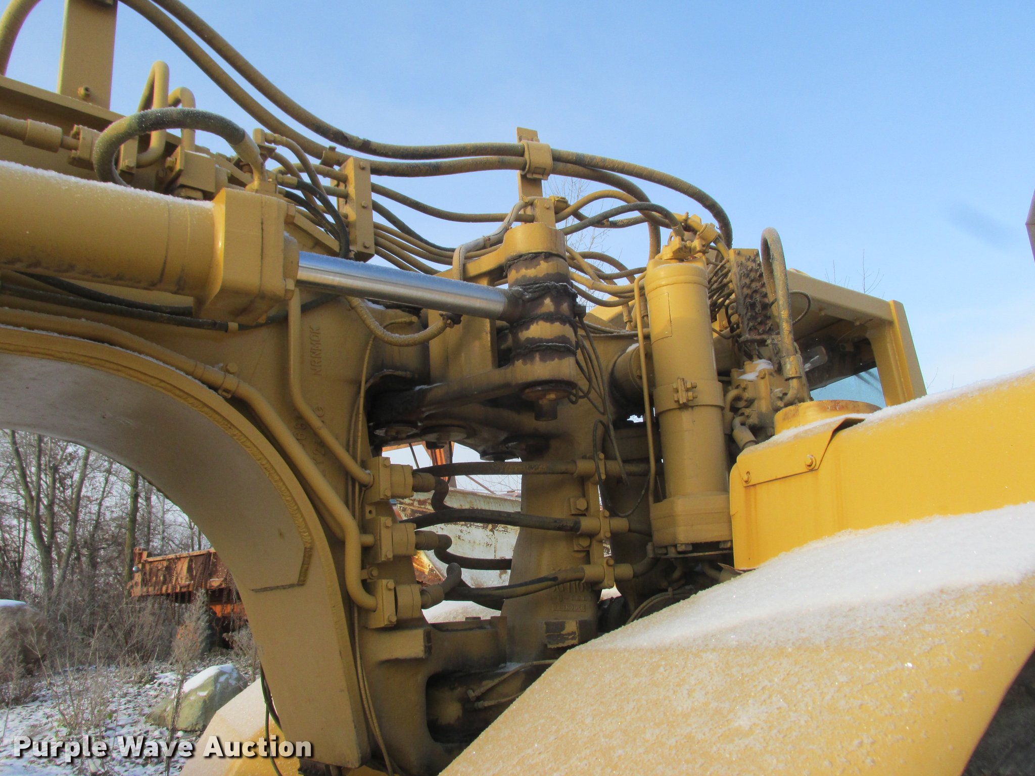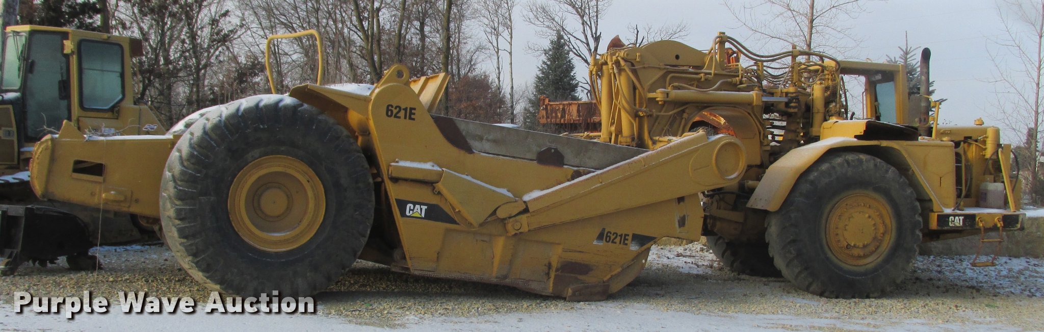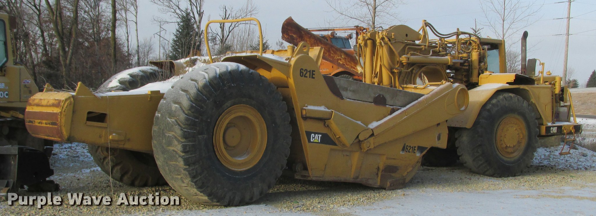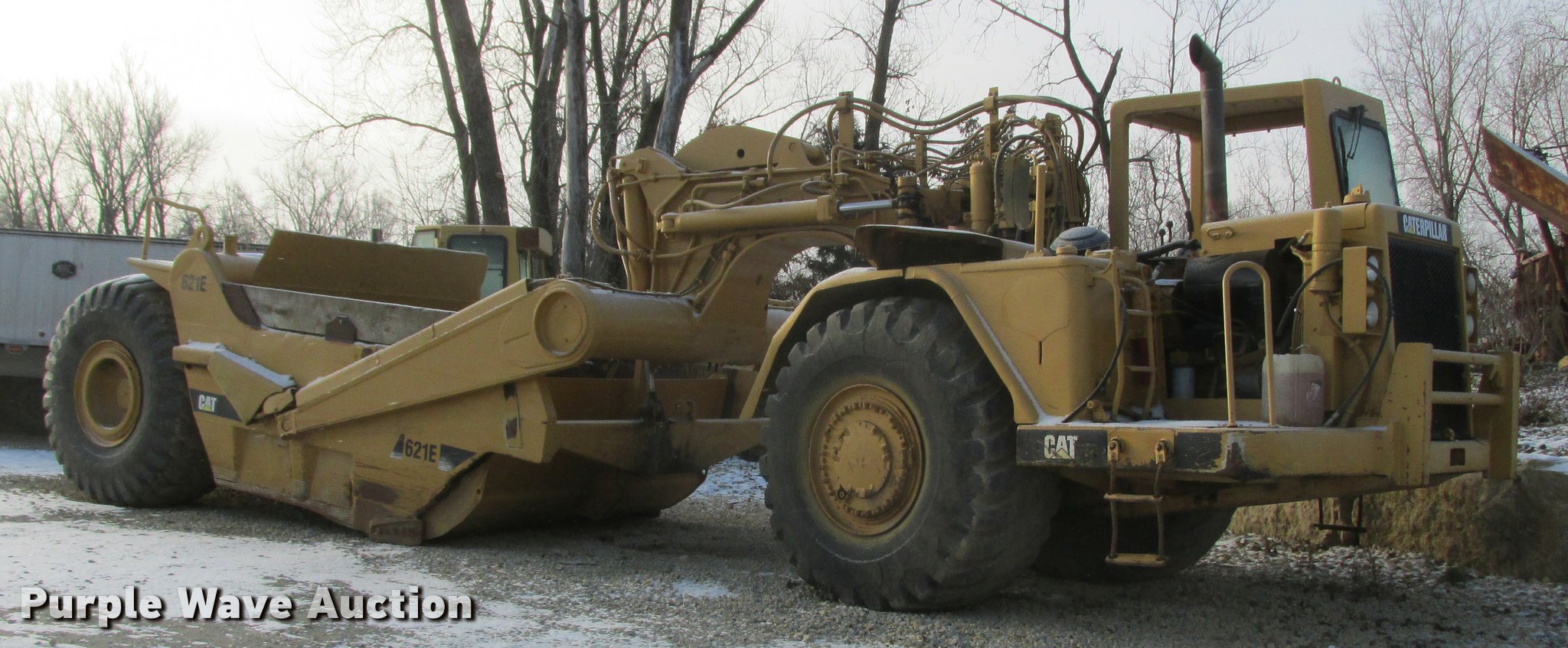 Purple Wave is selling a used Conventional Scraper in Minnesota. This item is a 1988 Caterpillar 621E conventional scraper with the following: 5,788 hours on meter, Caterpillar 3406 six cylinder turbo diesel engine, Serial 70V25772, Powershift transmission, 8F-1R gears, OROPS, Suspension seat, Tilt steering, Hydraulic lift, Three scraper controls, Rear push block, Air brakes, 33.25-29 E3 tires, Serial 6AB00922