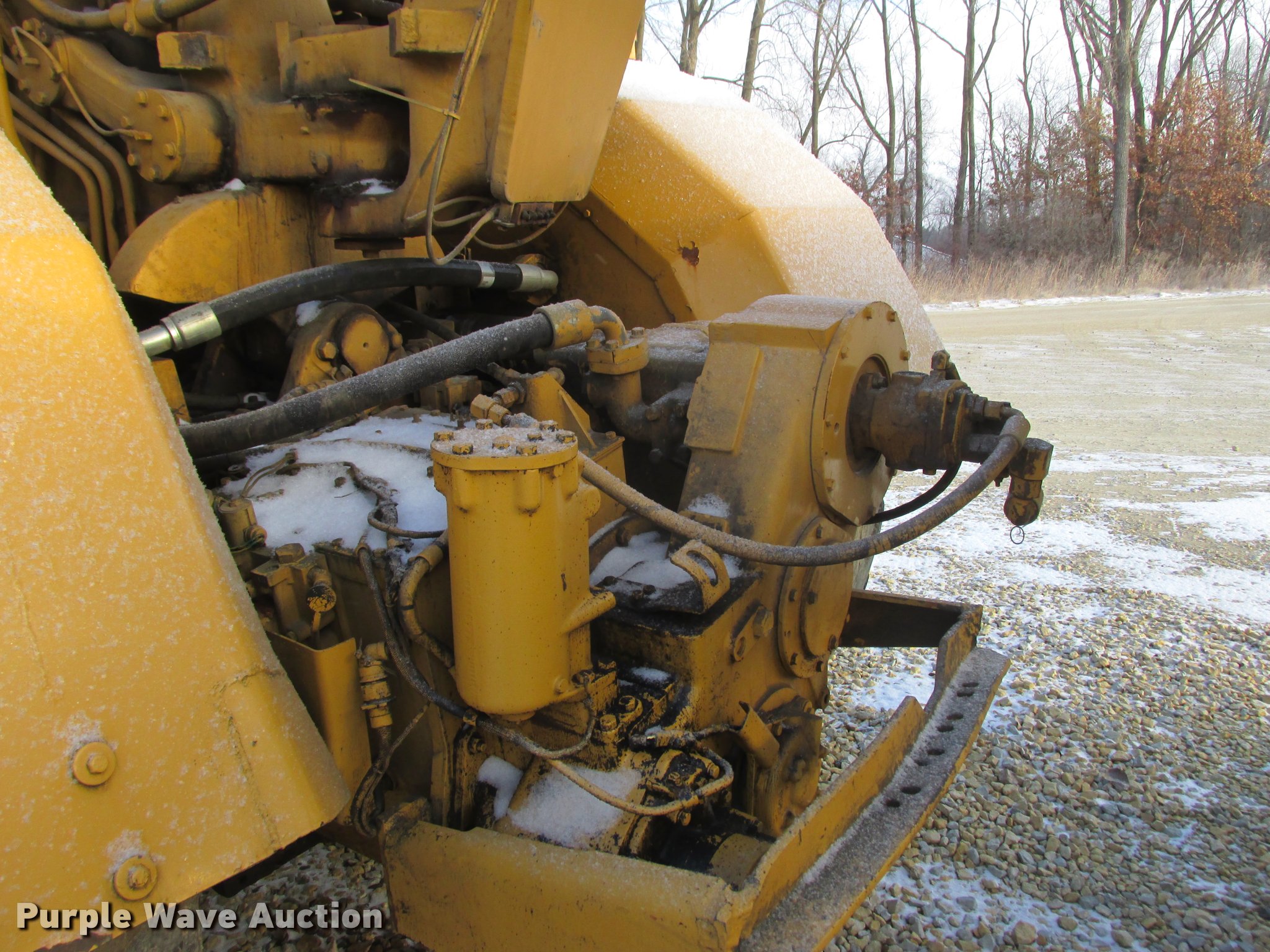 1988 Caterpillar 621E conventional scraper. 5,788 hours on meter, Caterpillar 3406 six cylinder turbo diesel engine Serial 70V25772, Powershift transmission 8F-1R gears, OROPS, Suspension seat, Tilt steering, Hydraulic lift, Three scraper controls, Rear push block, Air brakes, 33.25-29 E3 tires, Serial 6AB00922. Fitzgerald Excavating & Trucking. 21432. Goodhue, MN 55027