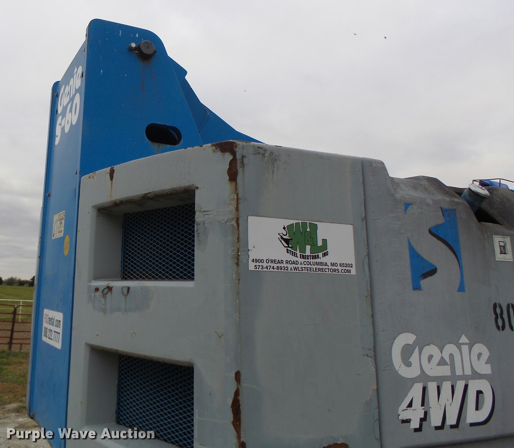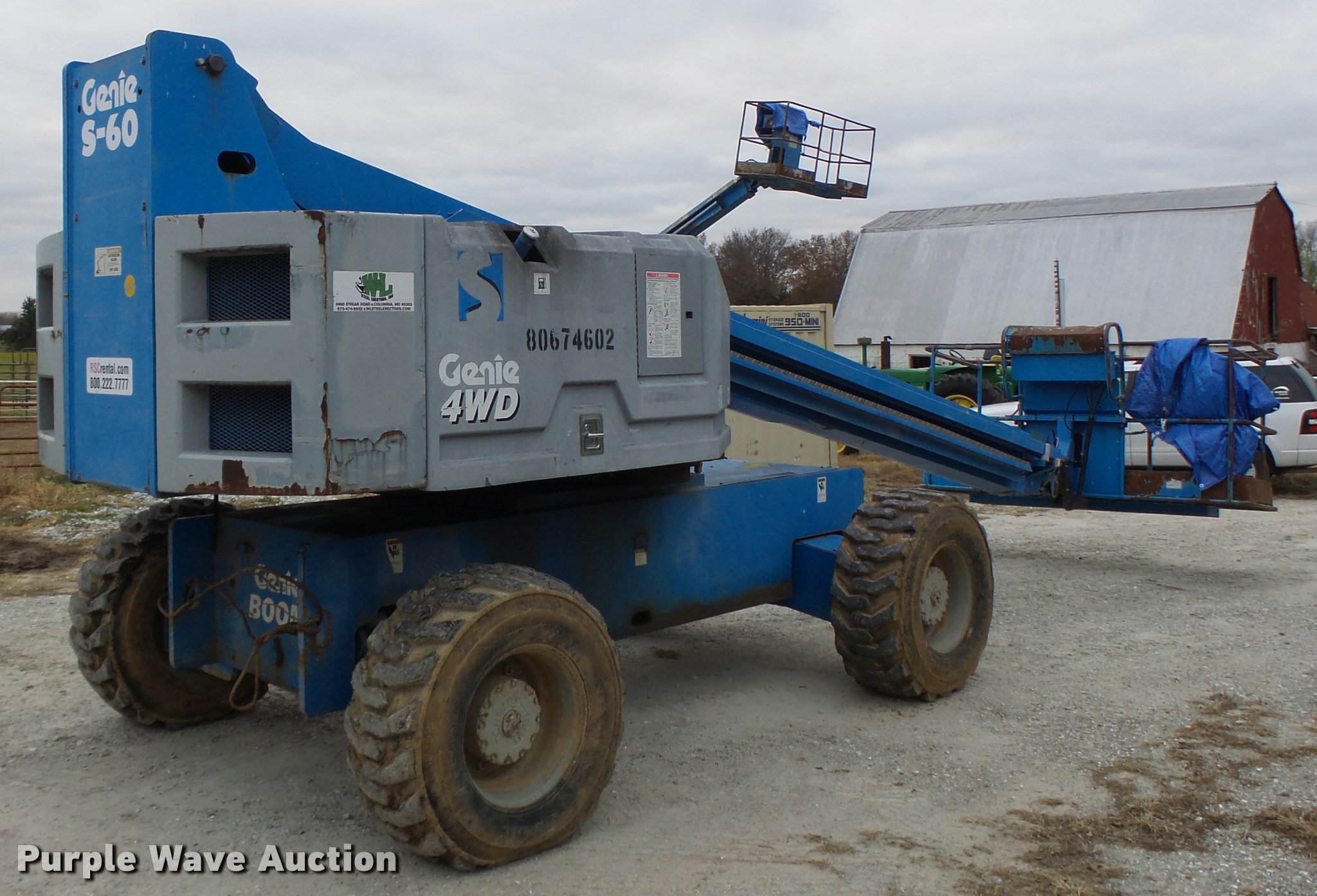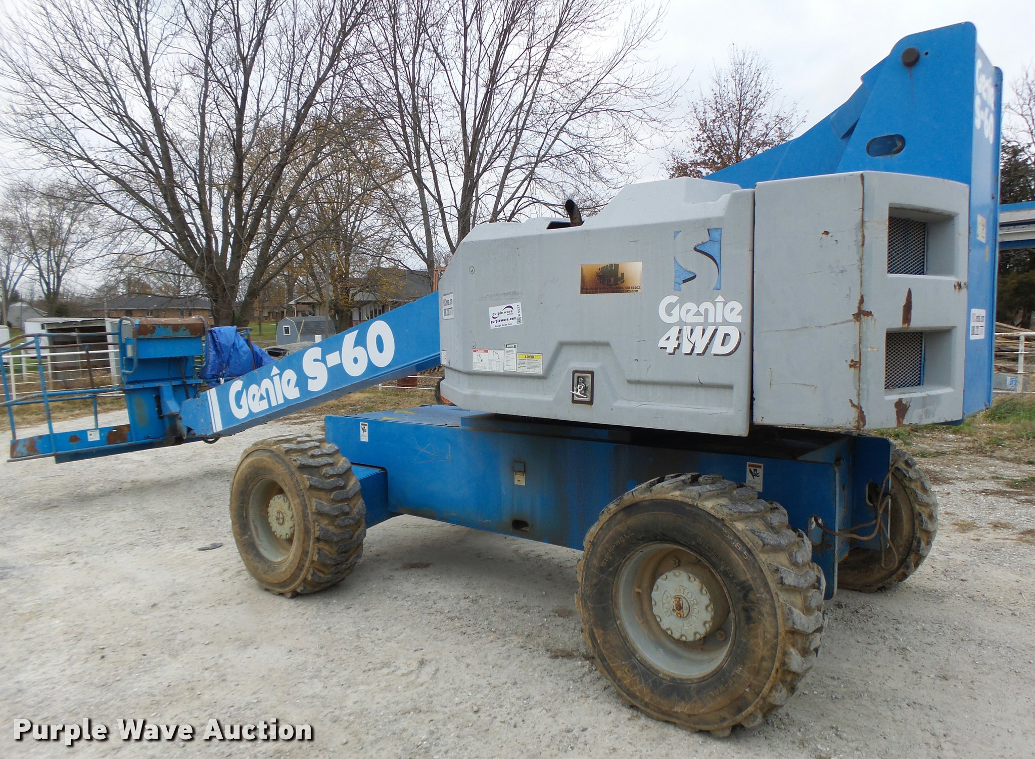Purple Wave is selling a used Boom Lift in Missouri. This item is a 1997 Genie S60 boom lift with the following: 7,342 hours on meter, Ford four cylinder dual fuel engine, Four wheel drive, 500 lbs maximum lift capacity, 60' maximum lift height, 3'L x 5'W platform, Platform and ground controls, AC power outlet, 15-19.5 tires, Serial 1533