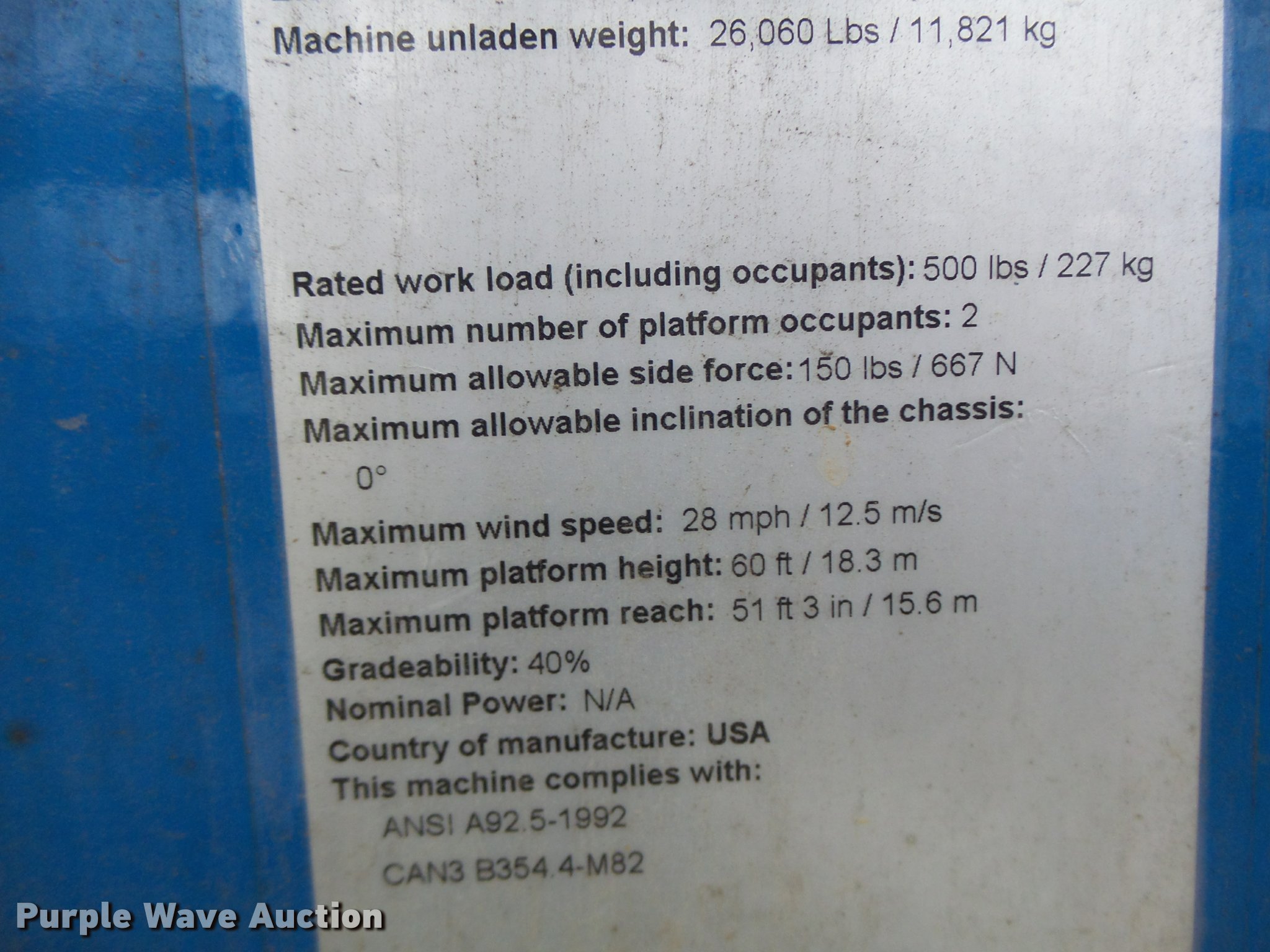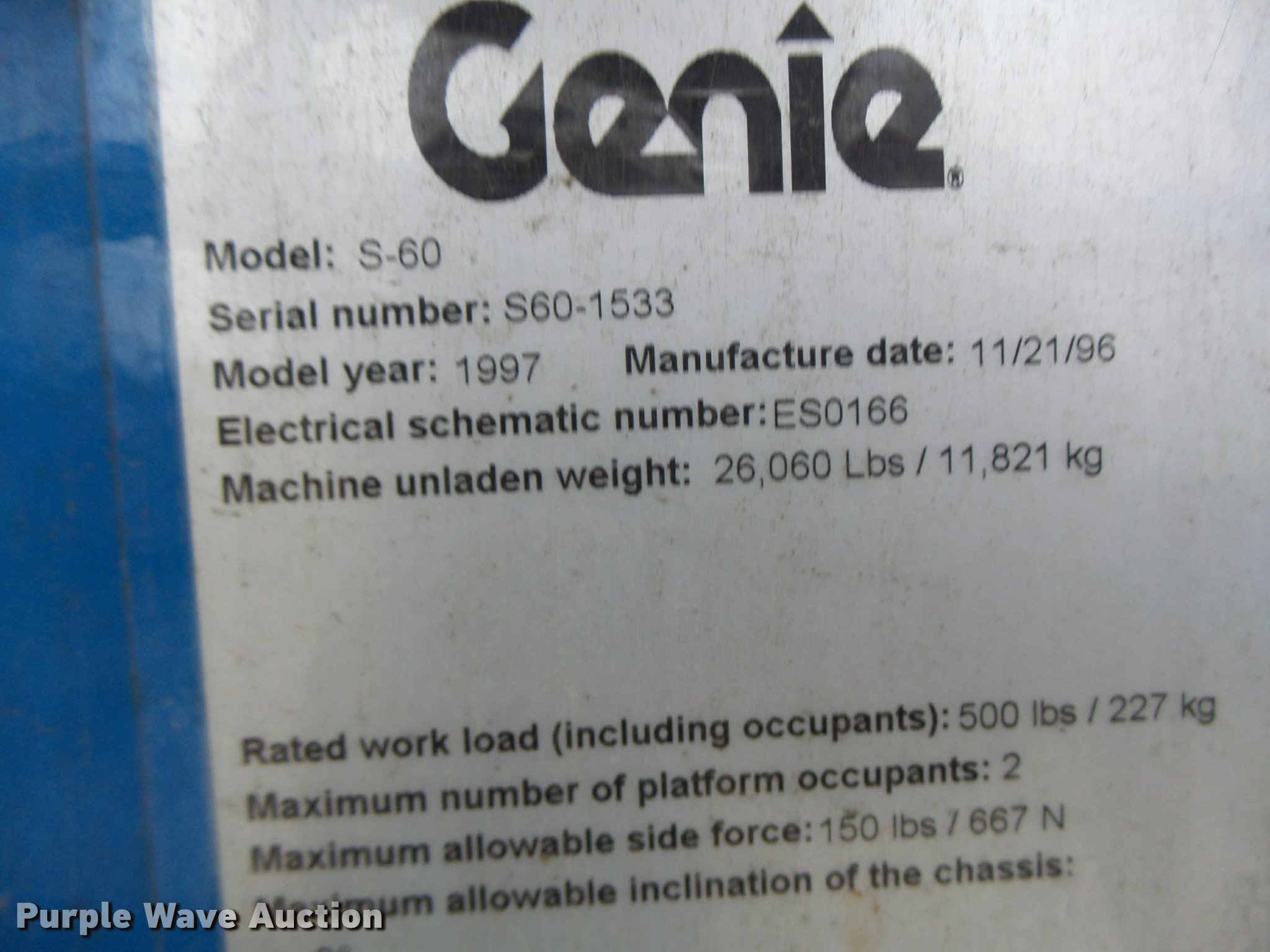 1997 Genie S60 boom lift has sold in Columbia, Missouri for $9350. Item K5527 sold on December 29th, 2016.