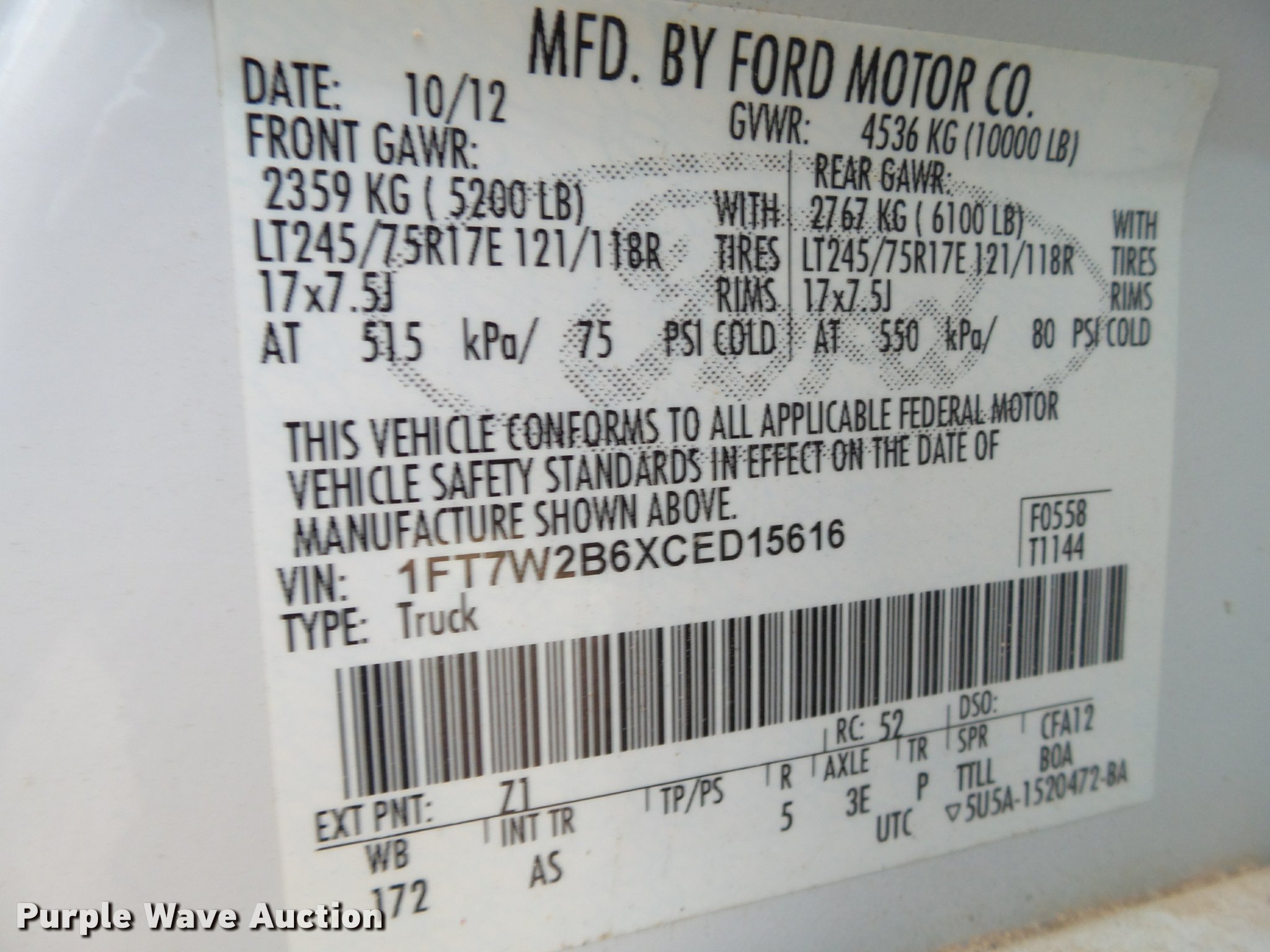 2012 Ford F250 Super Duty CrewCab pickup truck. 86,296 miles on odometer, 6.2L V8 OHV 16V gas engine, Automatic transmission, Four wheel drive, AC and heat, Tilt, Cruise, AM/FM/CD, Power windows, locks, and mirrors, Vinyl interior, Grill guard, Running boards, Long bed, Receiver hitch, Trailer wiring, 245/75R17 tires. Texas title. Seller is a Texas licensed motor vehicle dealer. The buyer may be required to pay sales tax and/or registration fees to the dealer prior to taking possession. Title will be assigned and distributed by the dealer to Texas buyers. Title will be assigned and distributed by Purple Wave Inc to all other buyers. Please contact the seller for distribution questions. Title distribution may be delayed up to 30 days from verification of funds. 1FT7W2B6XCED15616. Texas Performance. 918 N Avenue U. Lubbock, TX 79415