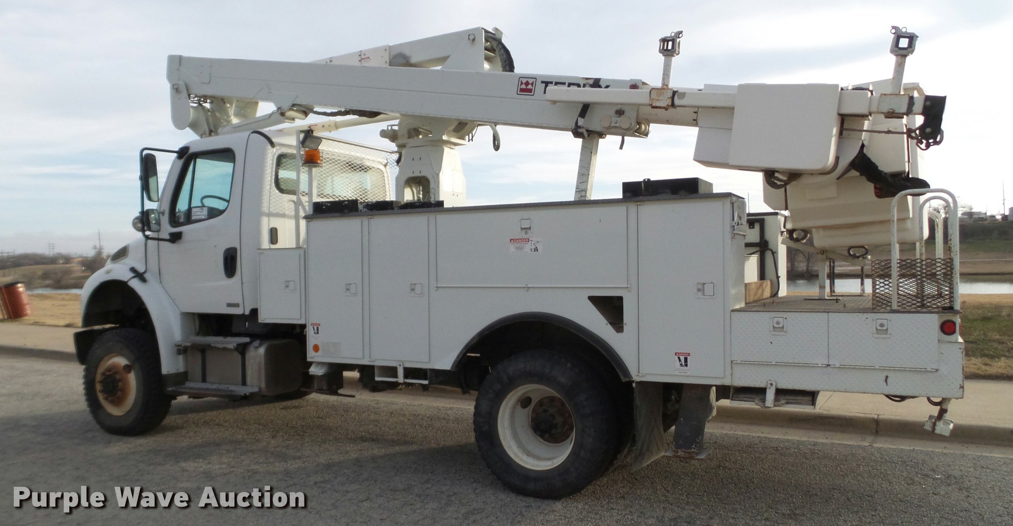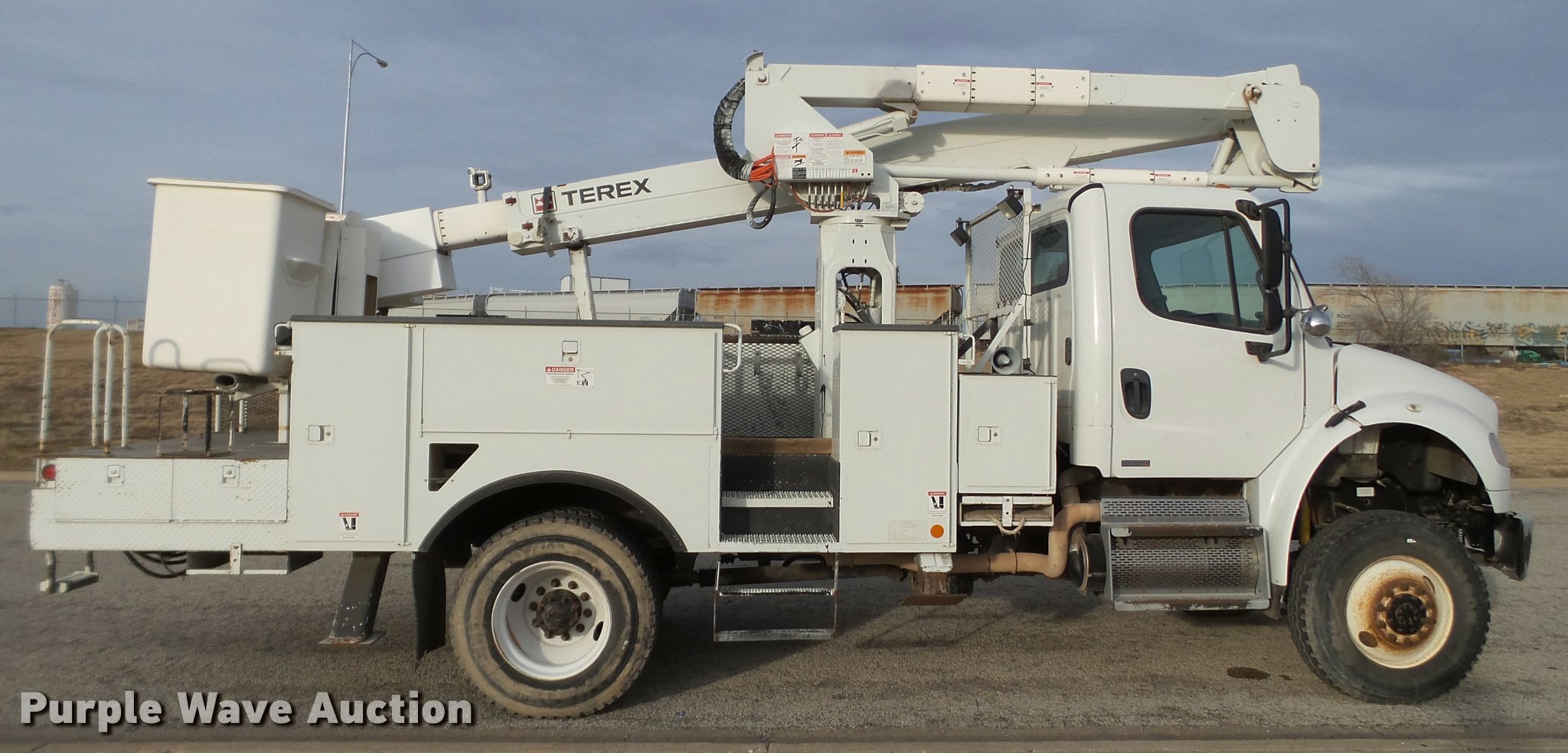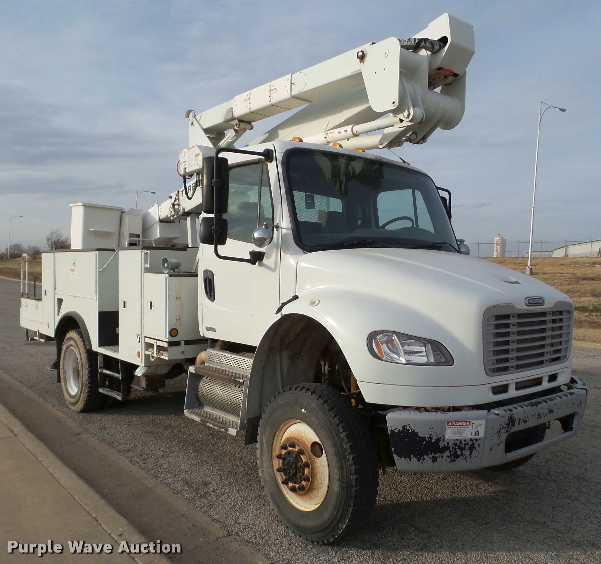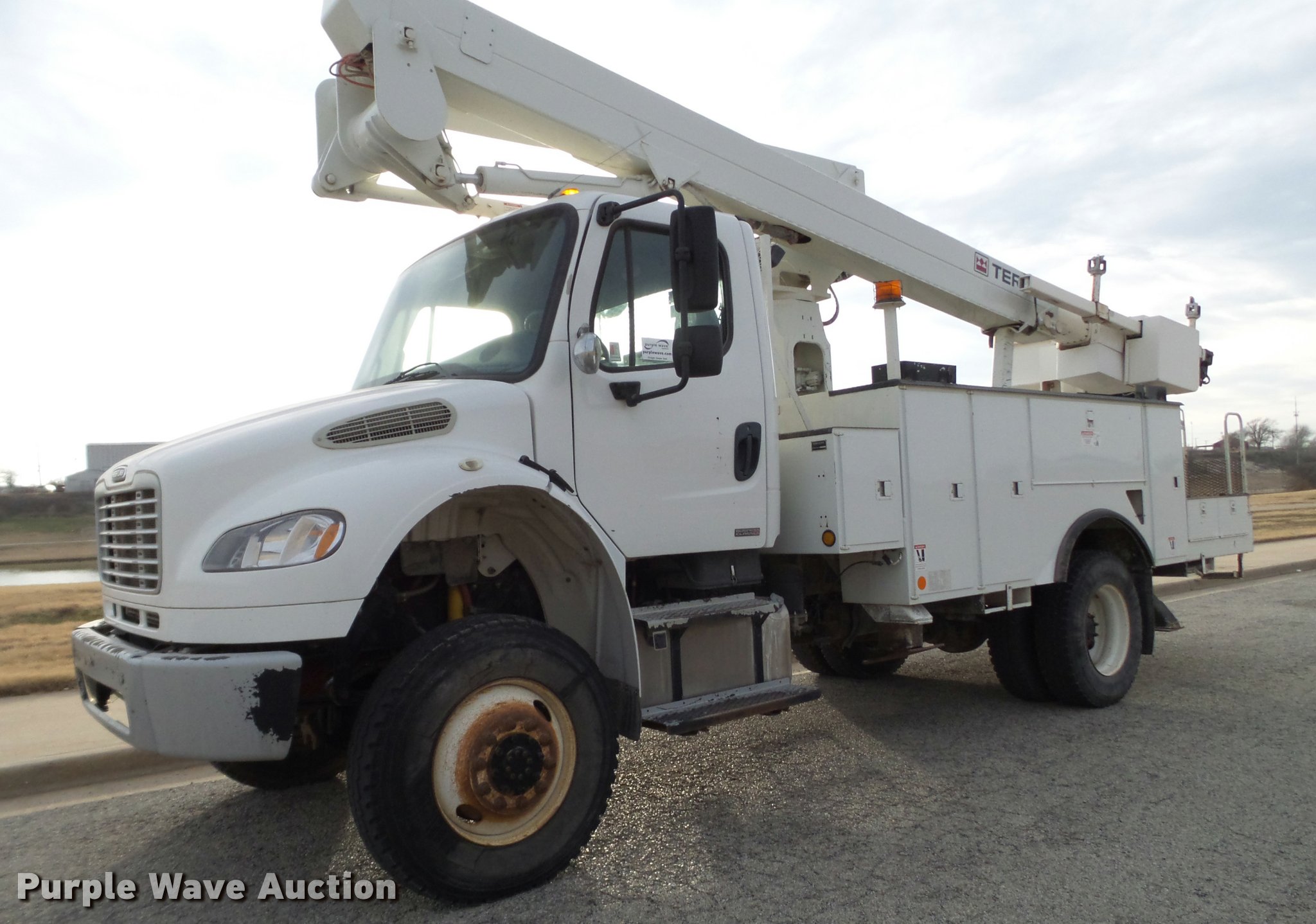 Purple Wave is selling a used Bucket Truck in Texas. This item is a 2009 Freightliner Business Class M2 bucket truck with the following: 186,644 miles on odometer, Cummins ISC 8.3L L6 turbo diesel engine, Automatic transmission, All wheel drive, Single axle, AC and heat, AM/FM, Spring suspension seat, Utility bed, Model IN16138, Receiver hitch, 2008 Terex boom, Serial 2080938259, 50' boom length, 600 lbs maximum lift capacity, Man basket, Platform controls, Material handler, Articulating insulated boom, Hotline kit, Single fuel tank, Spring suspension, 11R22.5 tires, GVWR 35,000 lbs