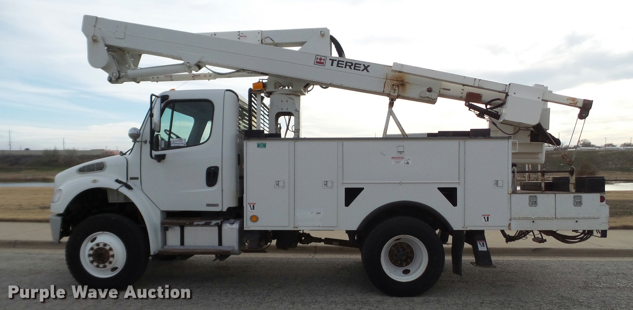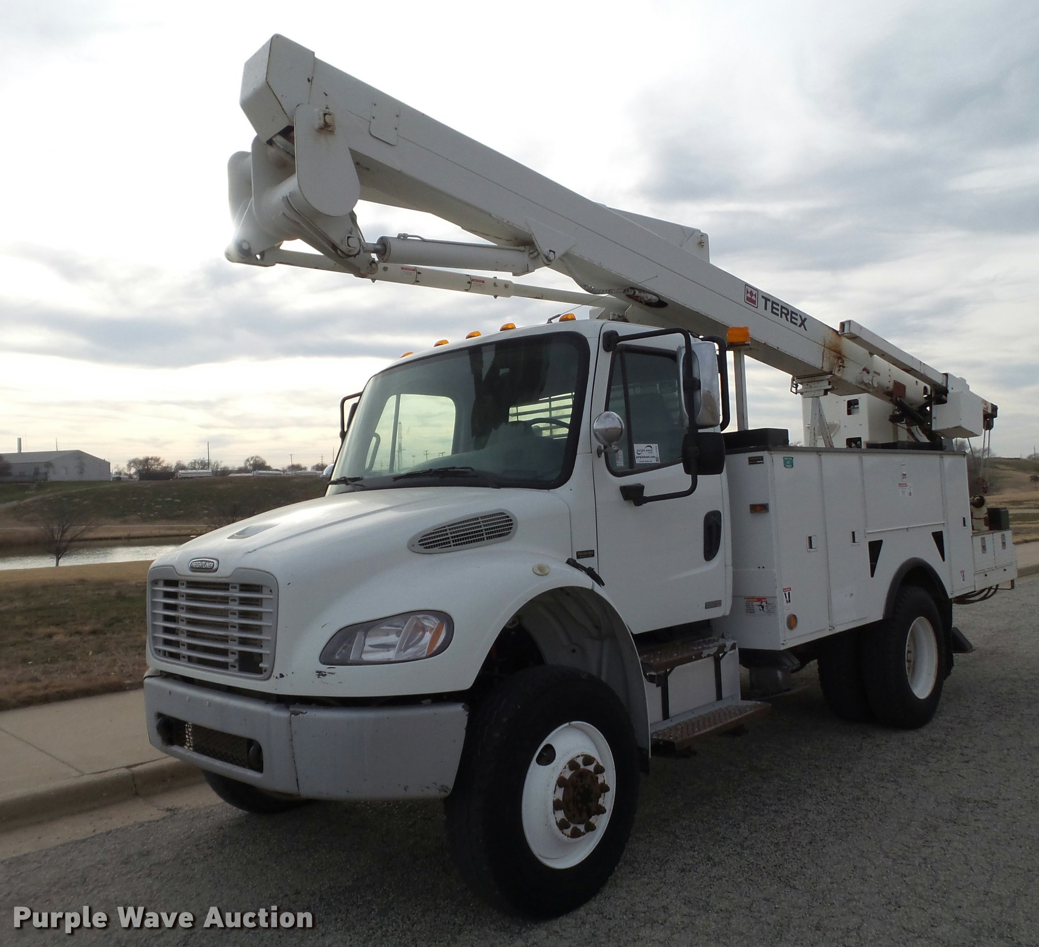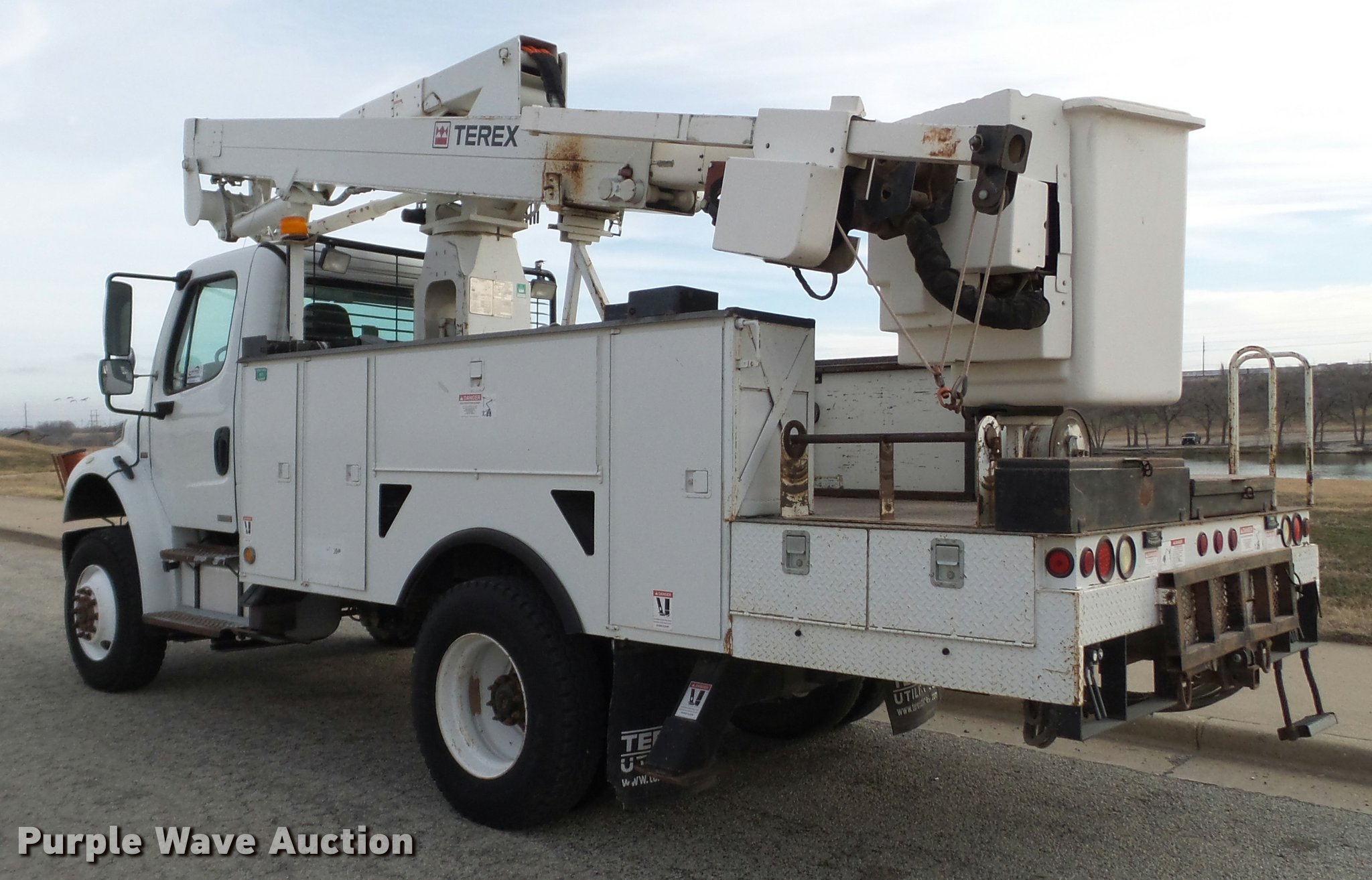 Purple Wave is selling a used Bucket Truck in Texas. This item is a 2007 Freightliner Business Class M2 bucket truck with the following: 204,095 miles on odometer, Mercedes Benz MBE900 6.4L L6 turbo diesel engine, Automatic transmission, All wheel drive, Single axle, AC and heat, AM/FM, Spring suspension seat, Beacon light, Backup alarm, Front tow hooks, Utility bed, Shelving, Slide-out drawers, Utility rack, 2007 Terex TL50M boom, Serial 2070332767, 50' boom length, 600 lbs maximum lift capacity, 50' maximum lift height, Man basket, Platform controls, Material handler, Articulating insulated boom, Single fuel tank, Spring suspension, Air brakes, 11R22.5 tires, GVWR 33,000 lbs