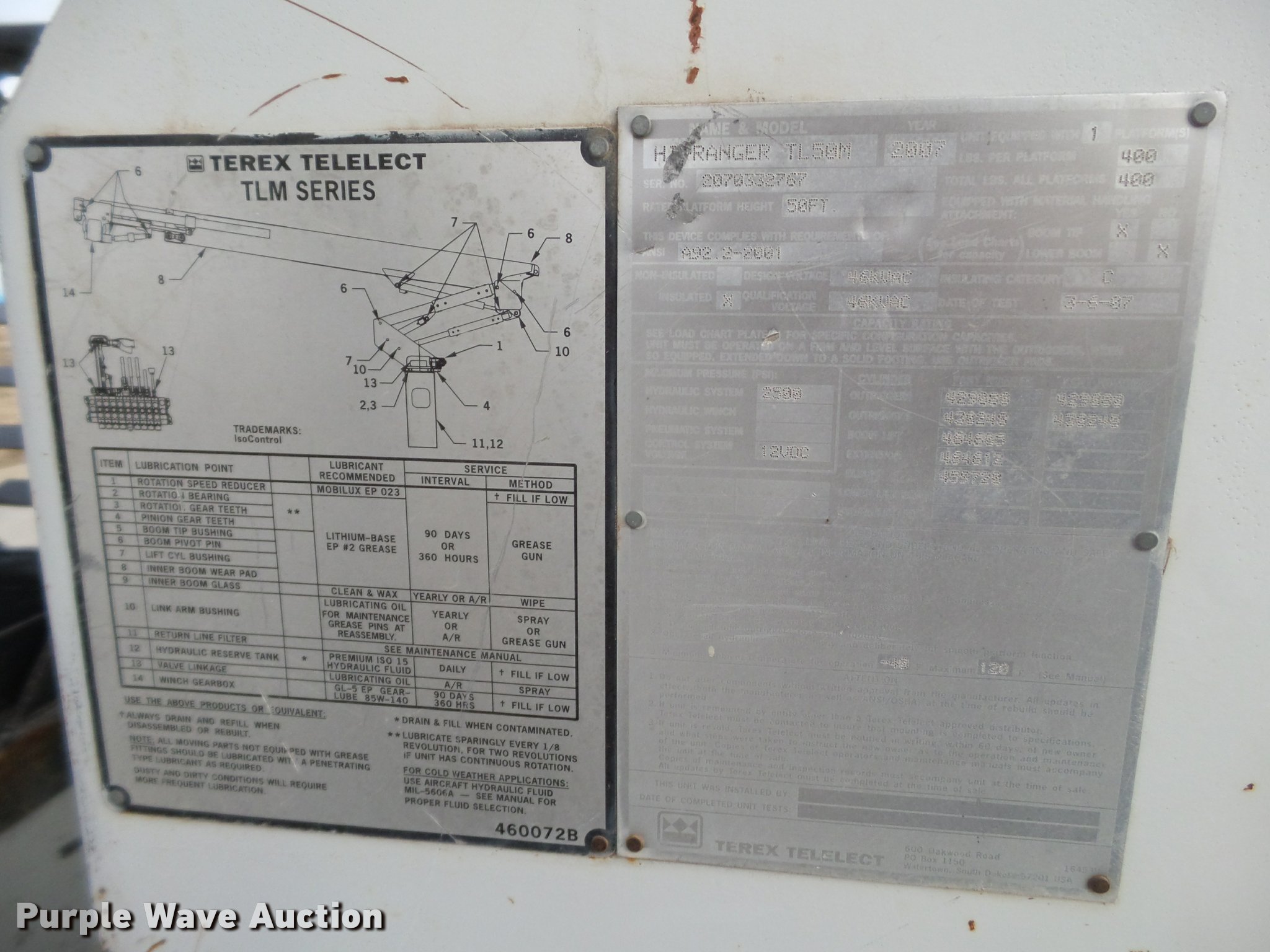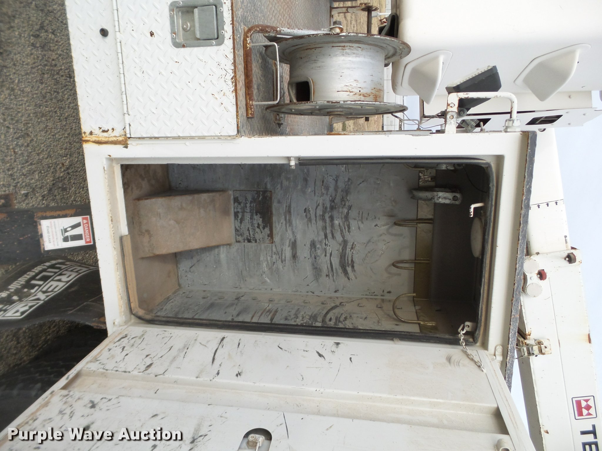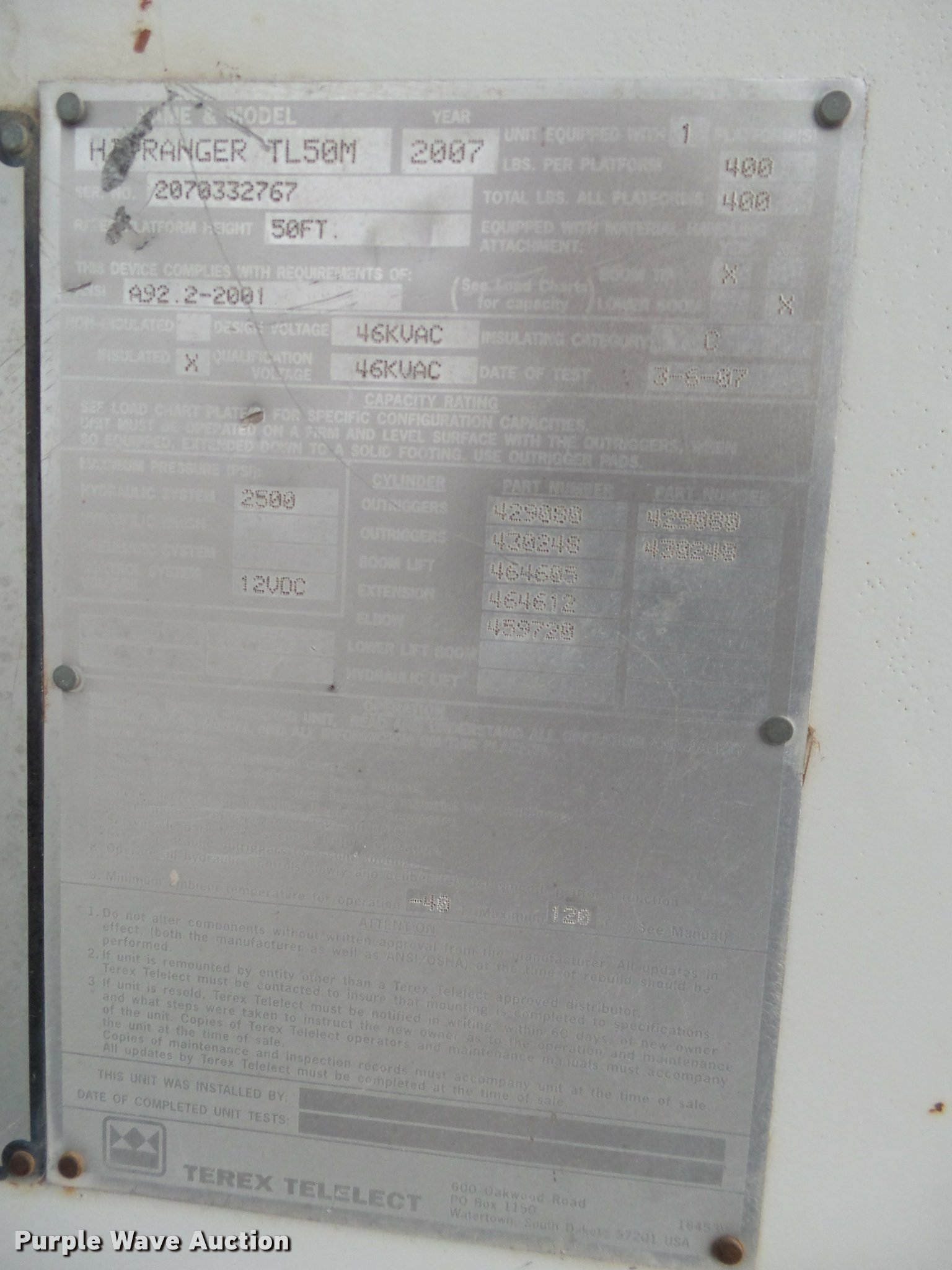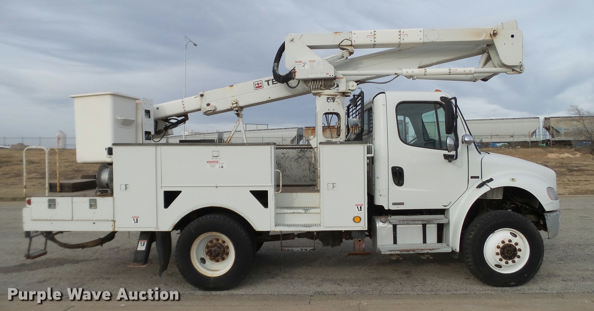 Purple Wave is selling a used Bucket Truck in Texas. This item is a 2007 Freightliner Business Class M2 bucket truck with the following: 204,095 miles on odometer, Mercedes Benz MBE900 6.4L L6 turbo diesel engine, Automatic transmission, All wheel drive, Single axle, AC and heat, AM/FM, Spring suspension seat, Beacon light, Backup alarm, Front tow hooks, Utility bed, Shelving, Slide-out drawers, Utility rack, 2007 Terex TL50M boom, Serial 2070332767, 50' boom length, 600 lbs maximum lift capacity, 50' maximum lift height, Man basket, Platform controls, Material handler, Articulating insulated boom, Single fuel tank, Spring suspension, Air brakes, 11R22.5 tires, GVWR 33,000 lbs