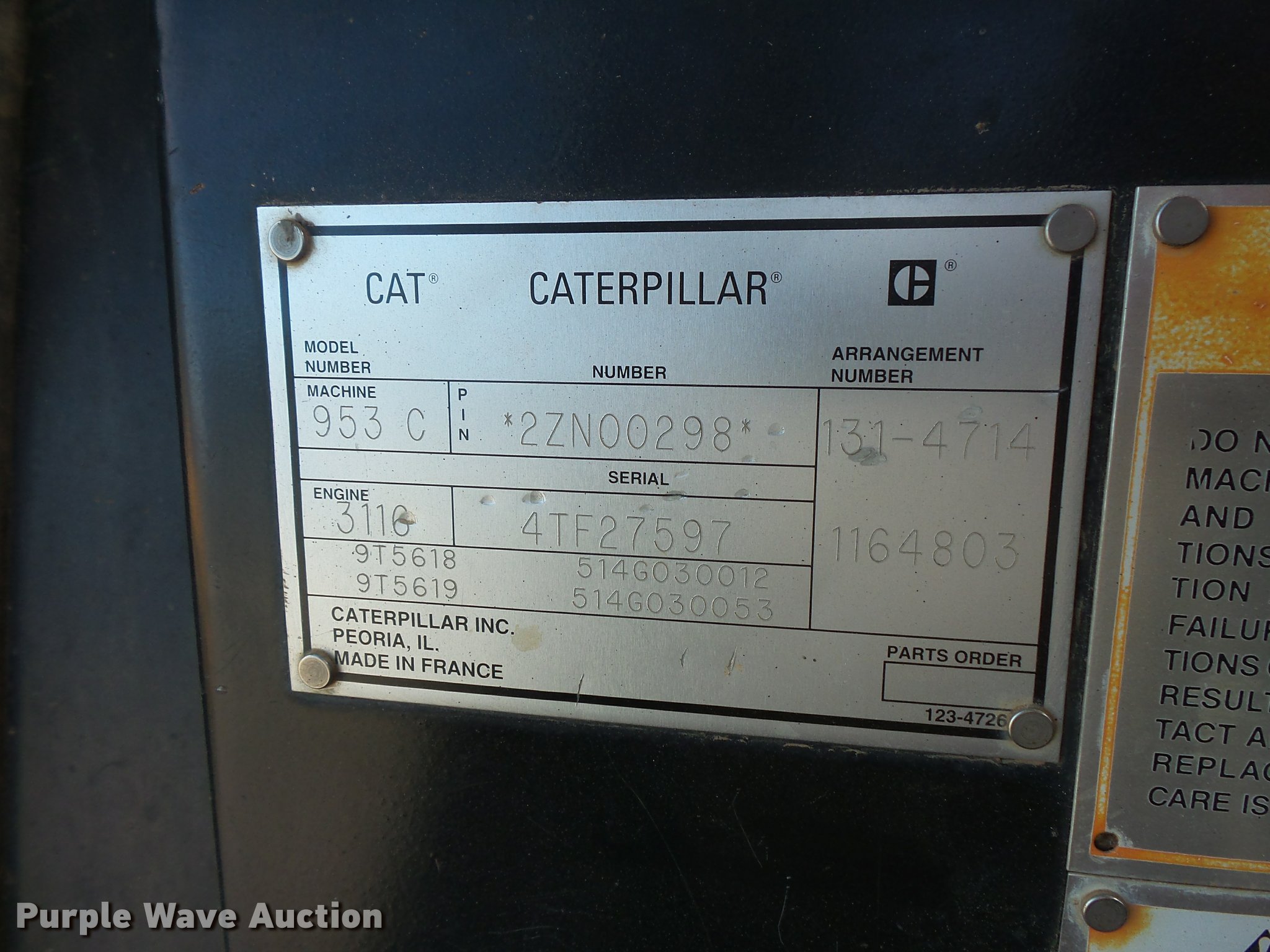 Purple Wave is selling a used Crawler Loader in Missouri. This item is a 1996 Caterpillar 953C track loader with the following: Caterpillar 3116 turbo diesel engine, Hydrostatic transmission, EROPS, AC and heat, Suspension seat, Two-lever bucket controls, Wipers, Front work lights, General purpose bucket, Bolt-on cutting edge, (8) teeth, 20"W double grouser tracks, Rear glass cracked, Passenger door removed for new glass installation, Door will be reattached prior to auction, Serial 2ZN00298