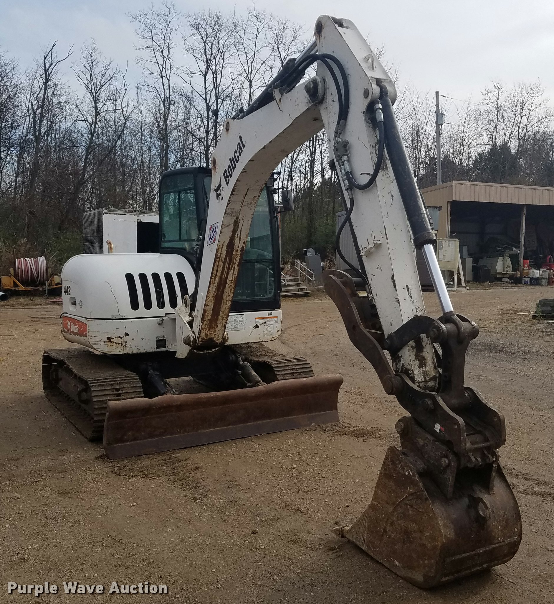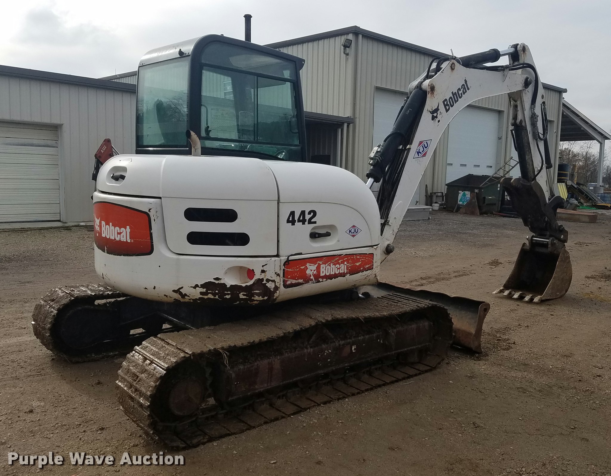 2008 Bobcat 442 compact excavator. 3,032 hours on meter, Hours may vary, unit is still in use, Duetz TD2011L04W diesel engine 72 HP, Serial 10625783, Two speed hydrostatic transmission, EROPS, AC and heat, Suspension seat, Wipers, Front work lights, Standard boom, 24"W bucket Bolt-on teeth, Hydraulic thumb, Hydraulic quick coupler, Two way auxiliary hydraulics, 92"W backfill blade, 18"W steel triple grouser track pads, Serial ABDS11045. KJ Unnerstall Construction Company. 4923 South Point Road. Washington, MO 63090
