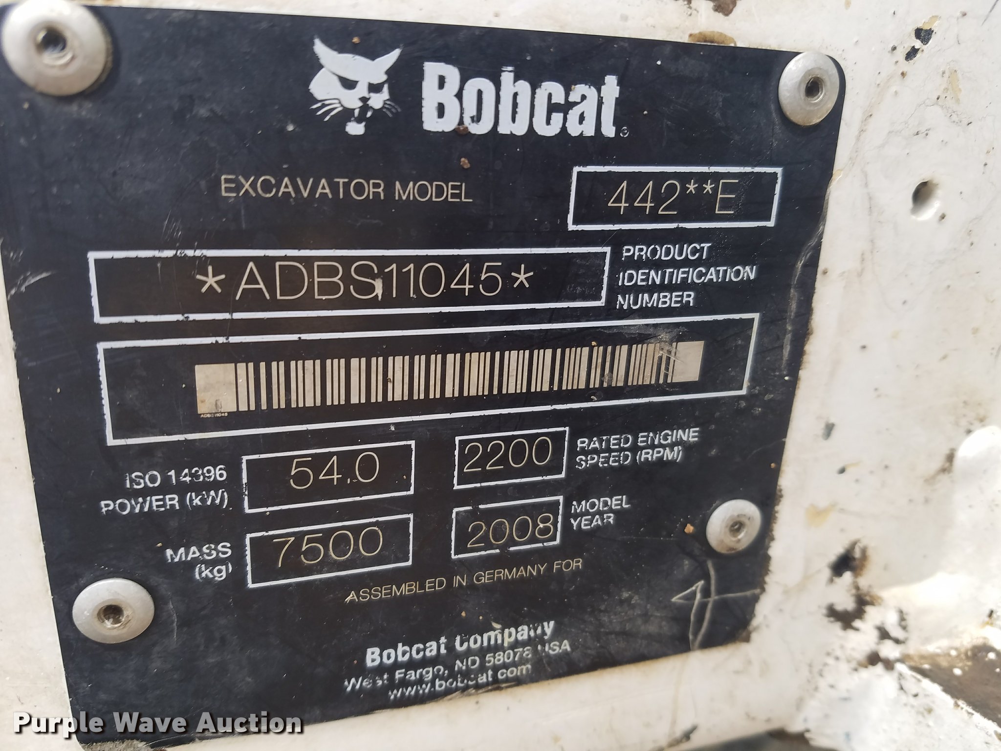 Purple Wave is selling a used Mini Excavator in Missouri. This item is a 2008 Bobcat 442 compact excavator with the following: 3,032 hours on meter, Hours may vary, unit is still in use, Duetz TD2011L04W diesel engine, 72 HP, Serial 10625783, Two speed hydrostatic transmission, EROPS, AC and heat, Suspension seat, Wipers, Front work lights, Standard boom, 24"W bucket, Bolt-on teeth, Hydraulic thumb, Hydraulic quick coupler, Two way auxiliary hydraulics, 92"W backfill blade, 18"W steel triple grouser track pads, Serial ABDS11045
