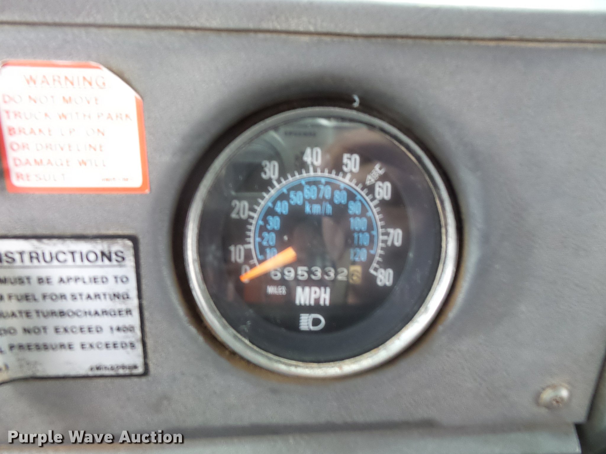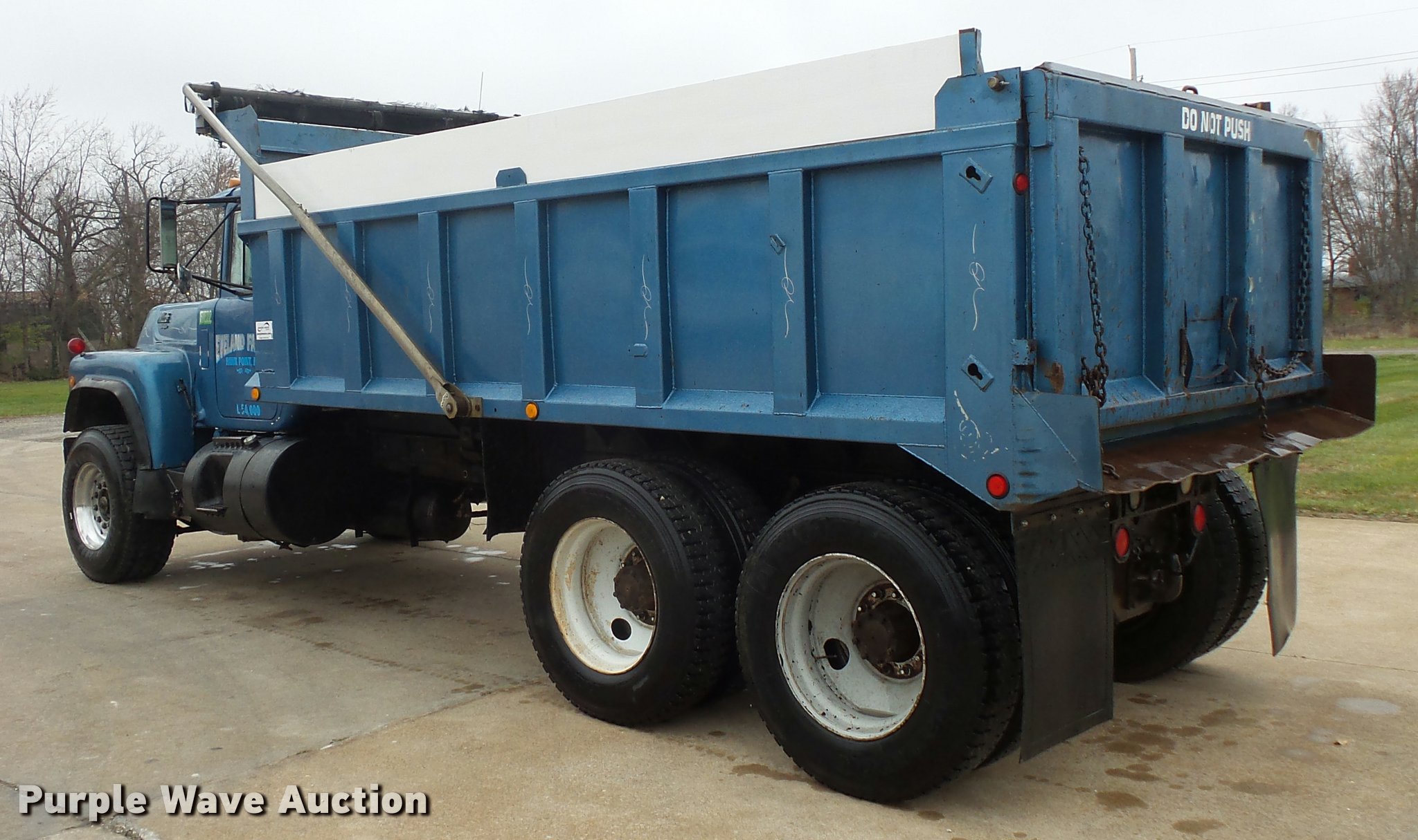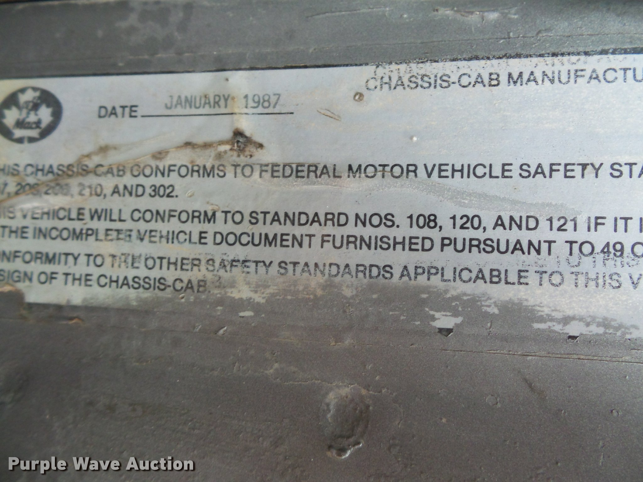 Purple Wave is selling a used Construction Dump Truck in Missouri. This item is a 1987 Mack R686ST dump truck with the following: 695,332 miles on odometer, Mack E6 11.0L L6 turbo diesel engine, Six speed manual transmission, Tandem axle, AC and heat, AM/FM, Air suspension seat, Legacy silver driver's seat, Exterior visor, Chrome bumper, PTO, 16'L steel dump bed, 48" side height, Air operated end gate, Rollrite electric rollover tarp, Single ram hoist, Dual fuel tanks, Camelback suspension, Air brakes, 385/65R22.5 front tires, 11R22.5 rear tires