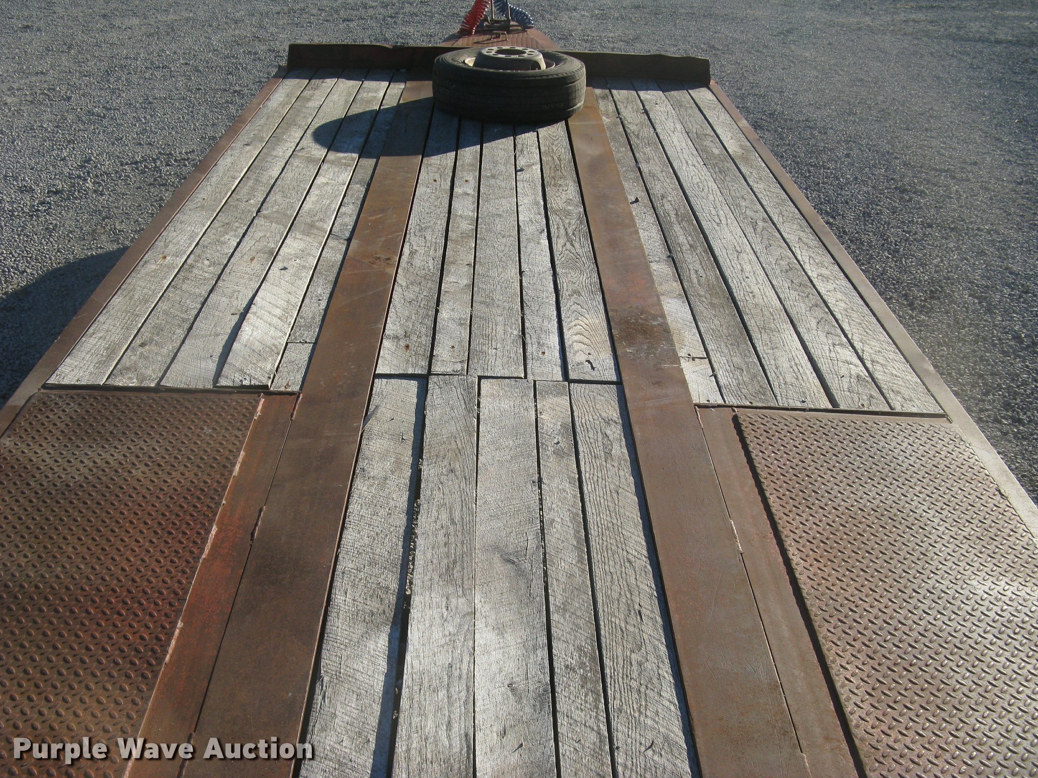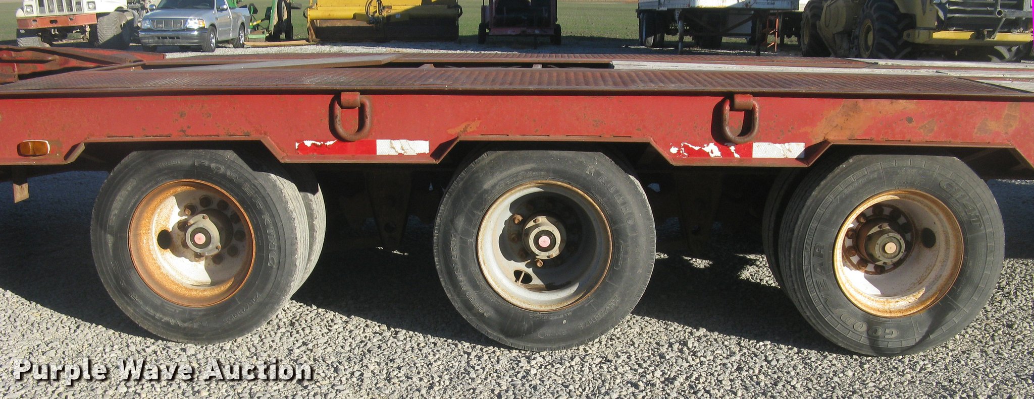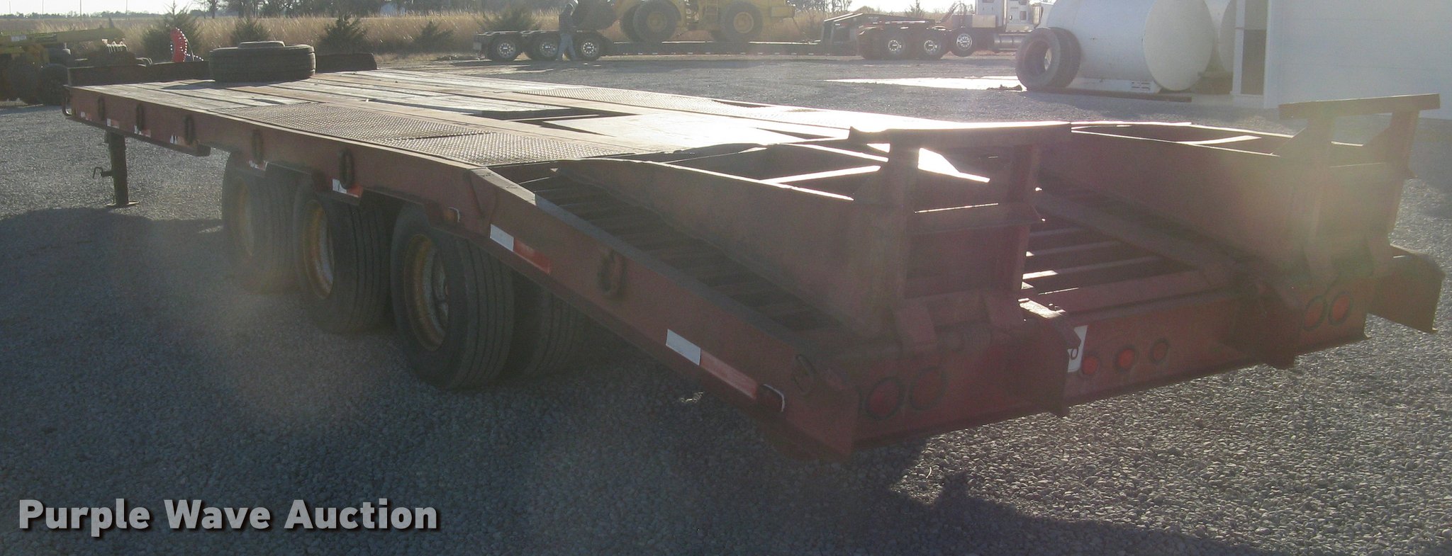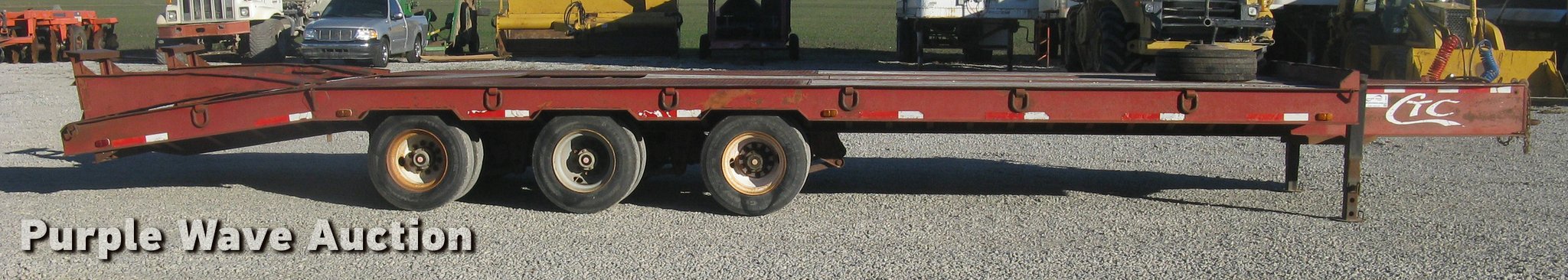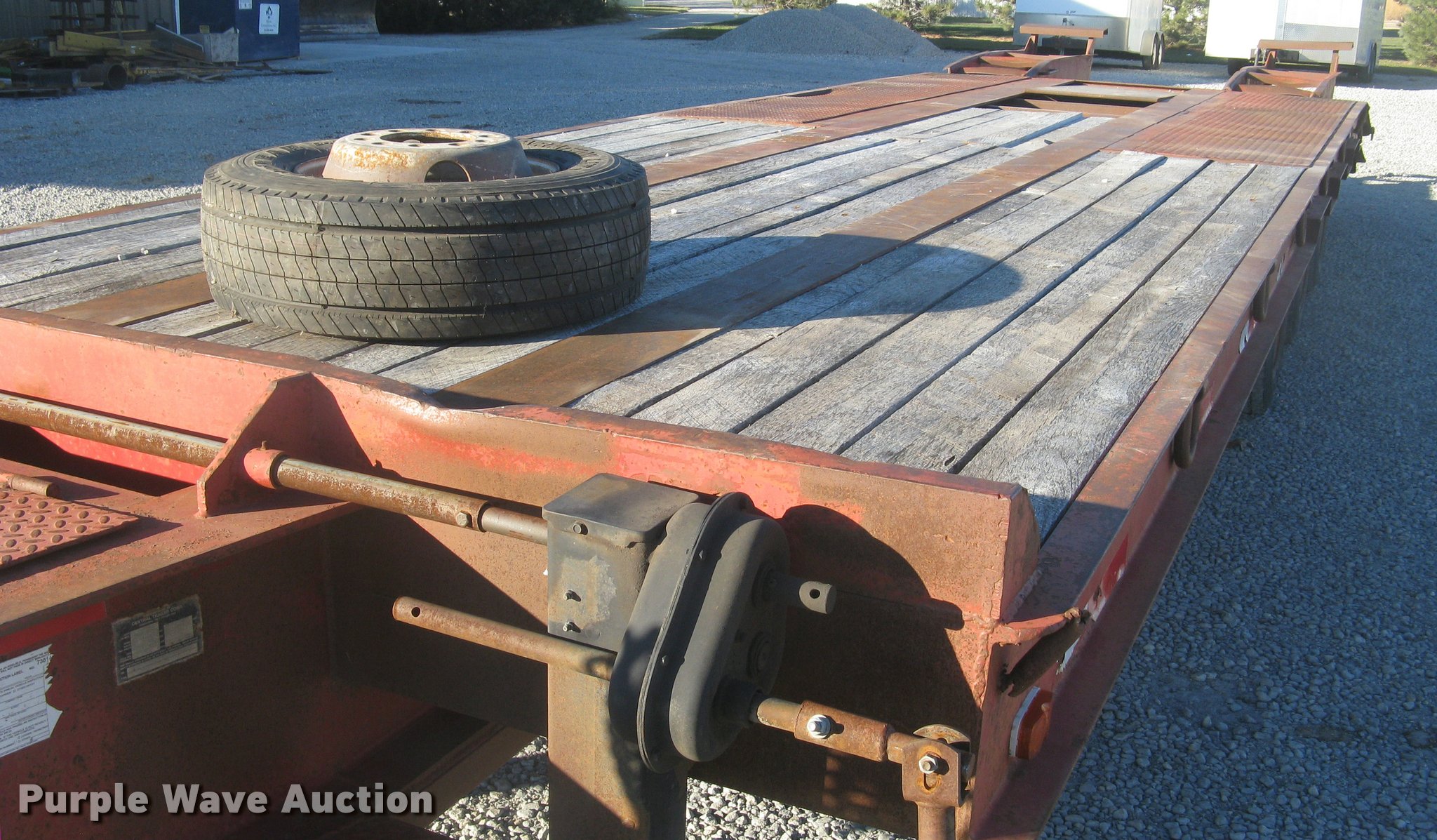 Purple Wave is selling a used Equip. Trailer in Kansas. This item is a 2001 Central equipment trailer with the following: 25'L x 102"W wood deck, 80"L dovetail, 72"L x 21"W ramps, D-ring tie downs, Tongue mounted storage, Dual leg landing gear, Adjustable height pintle hitch, Triple axle, Oil bath hubs, Spring suspension, Air brakes, 235/75R17.5 tires, GVWR 90,000 lbs