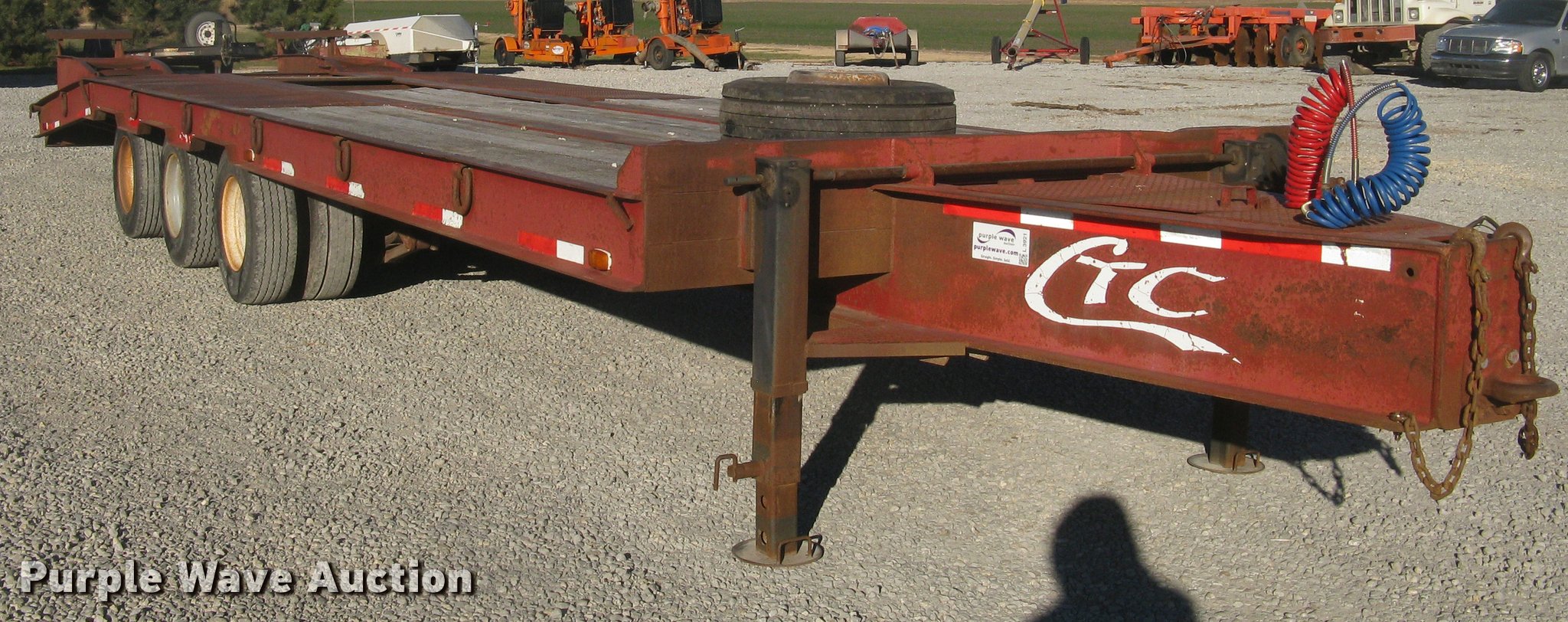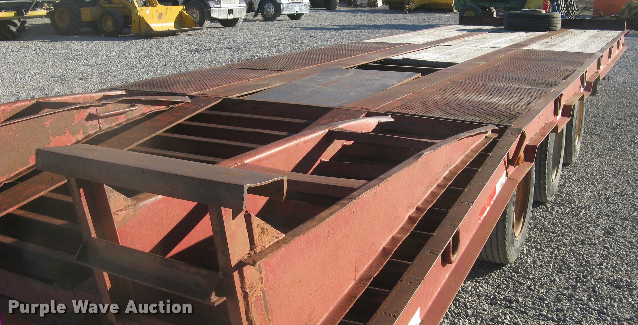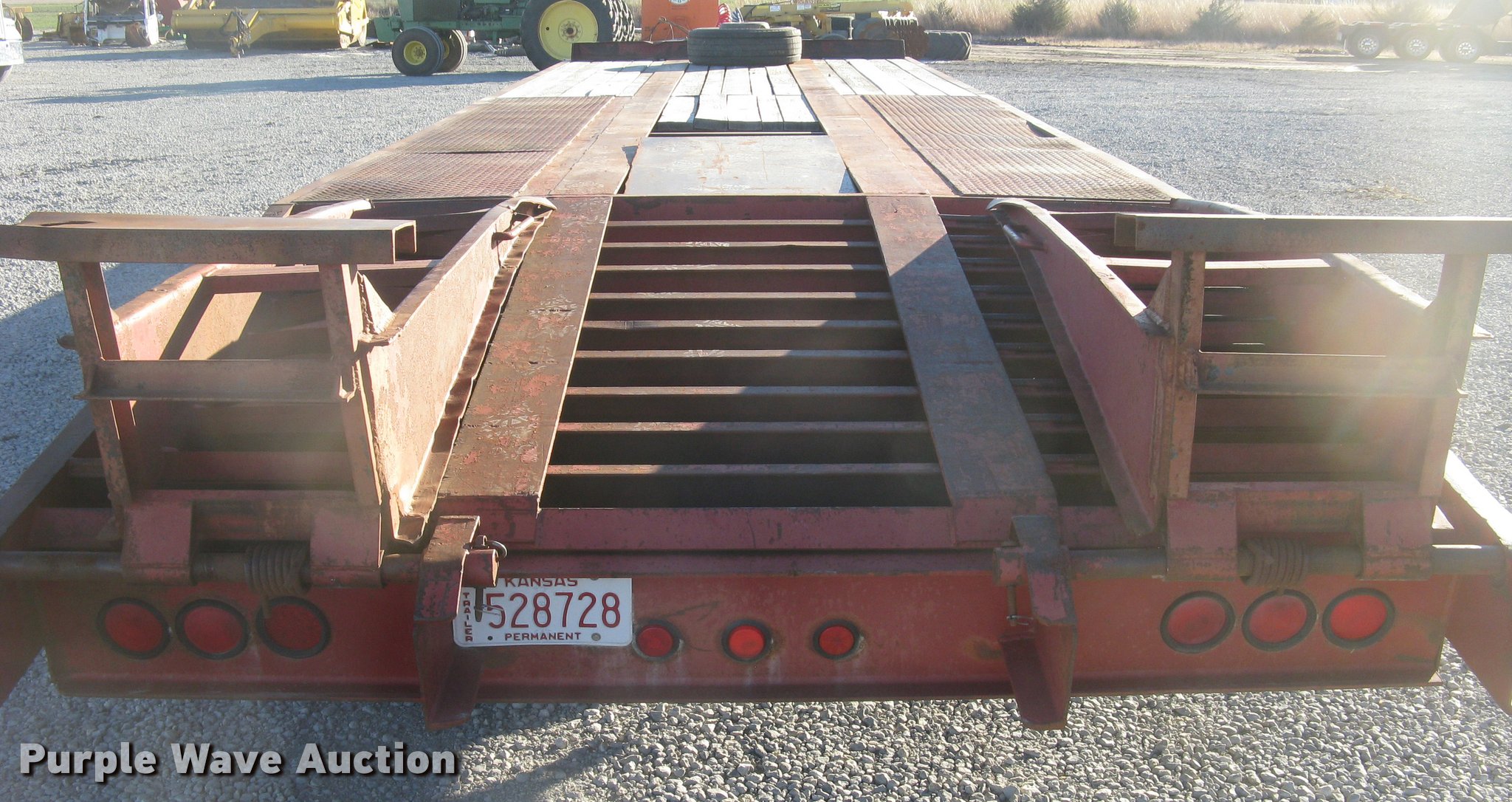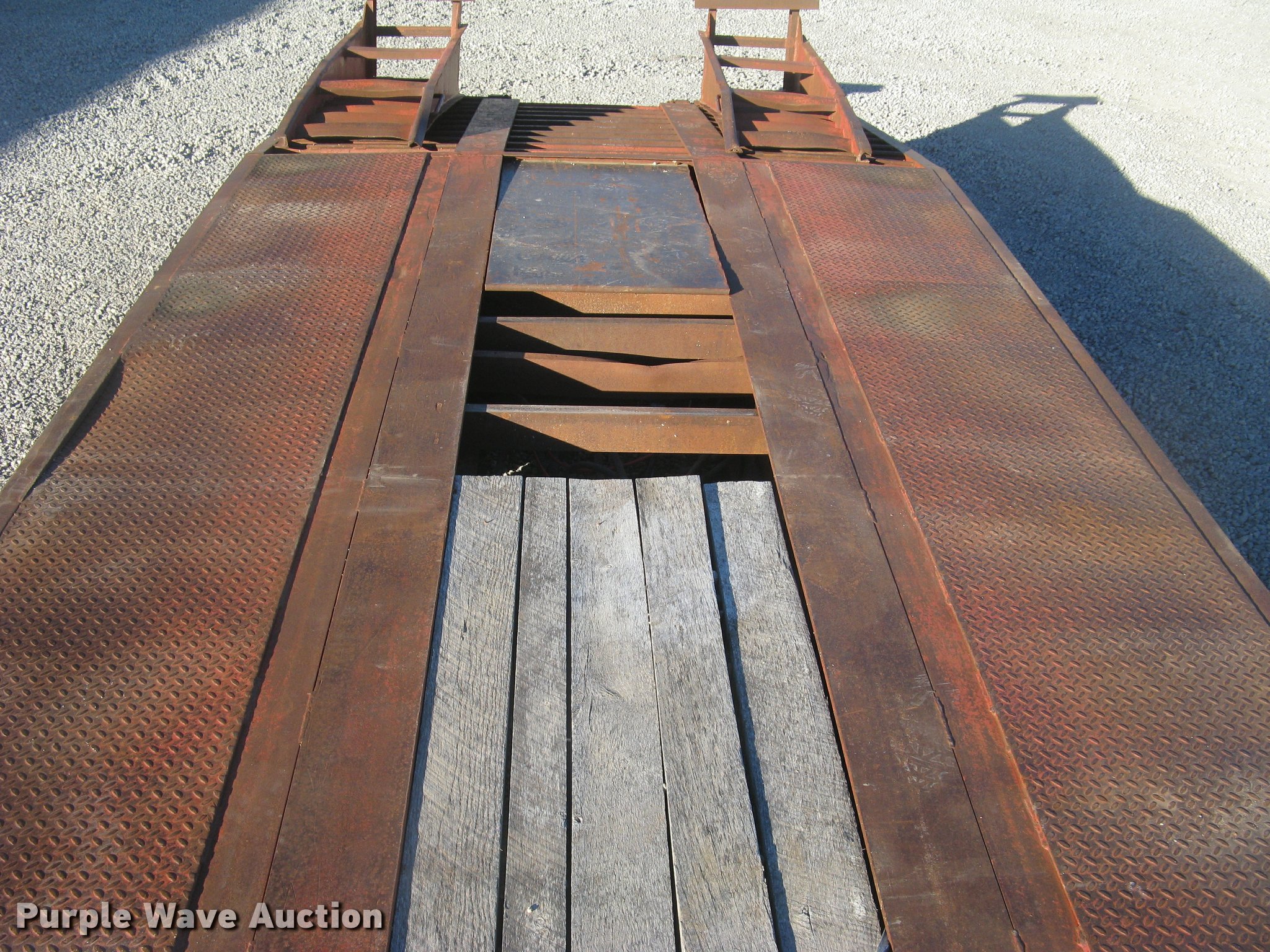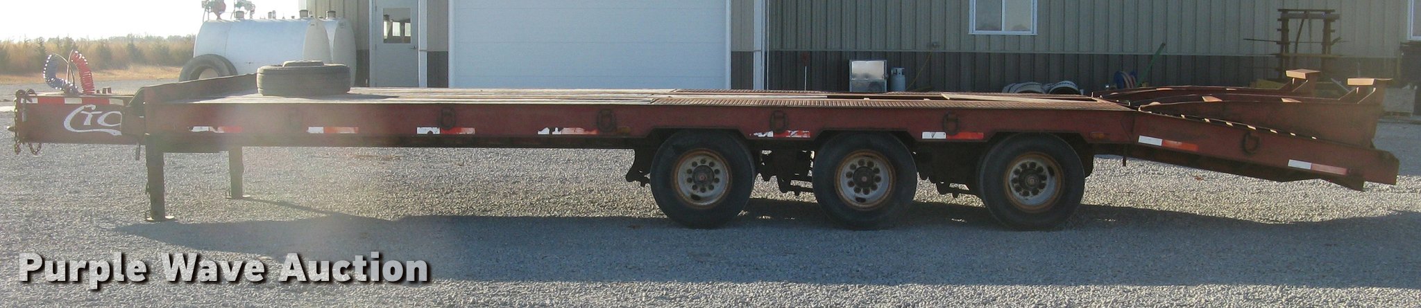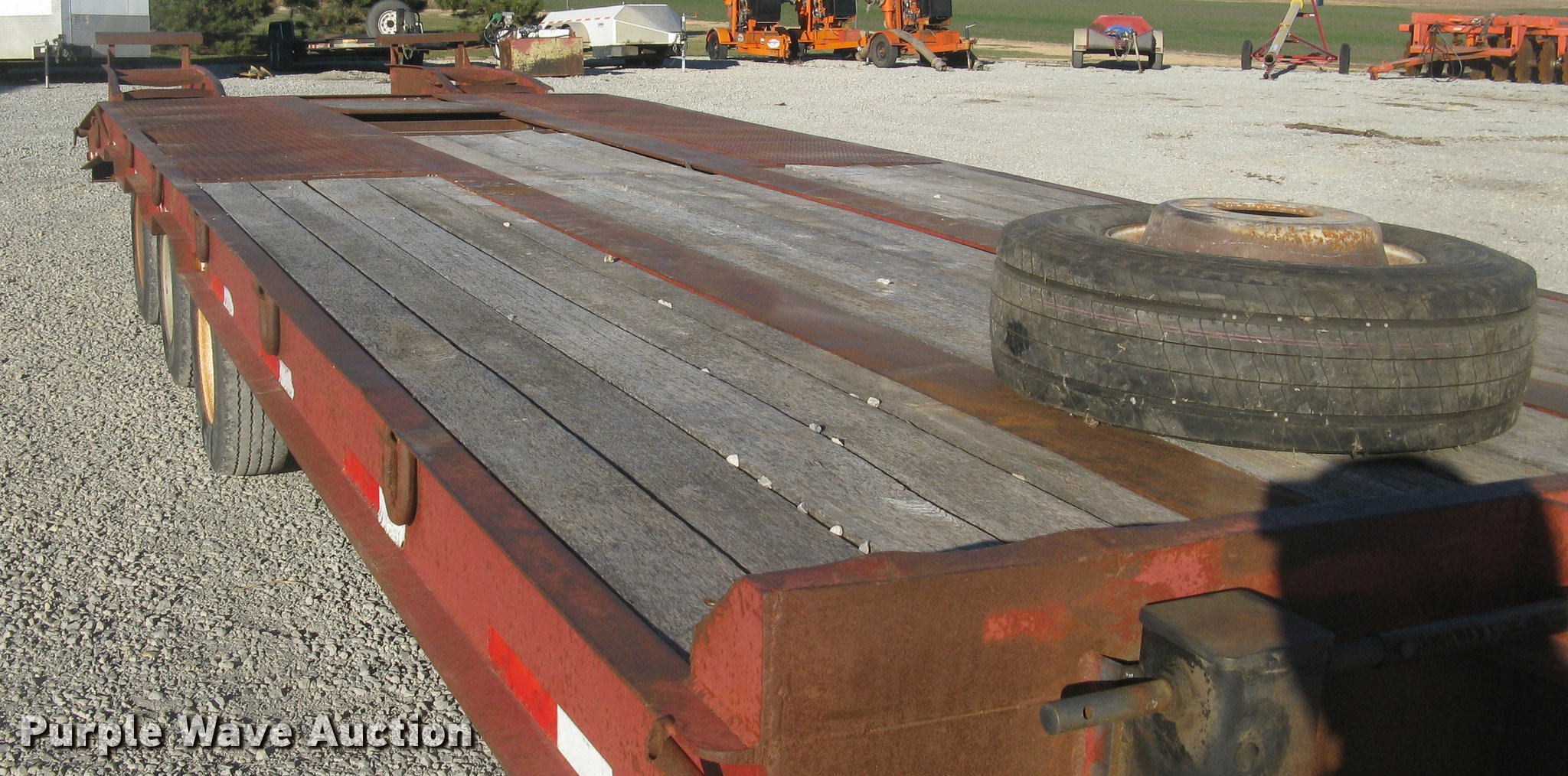 Purple Wave is selling a used Equip. Trailer in Kansas. This item is a 2001 Central equipment trailer with the following: 25'L x 102"W wood deck, 80"L dovetail, 72"L x 21"W ramps, D-ring tie downs, Tongue mounted storage, Dual leg landing gear, Adjustable height pintle hitch, Triple axle, Oil bath hubs, Spring suspension, Air brakes, 235/75R17.5 tires, GVWR 90,000 lbs