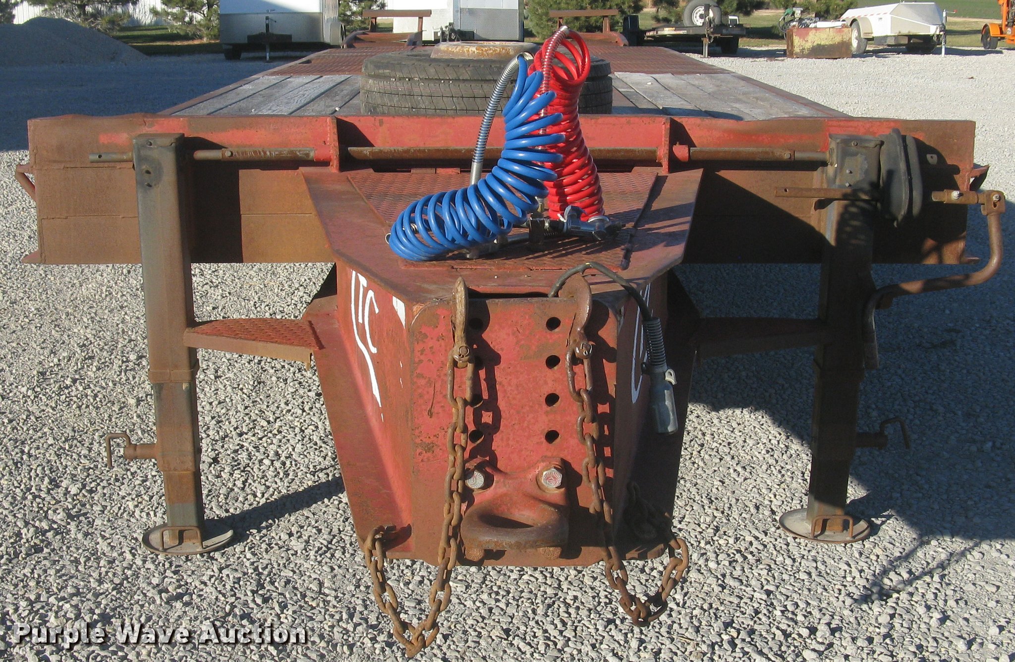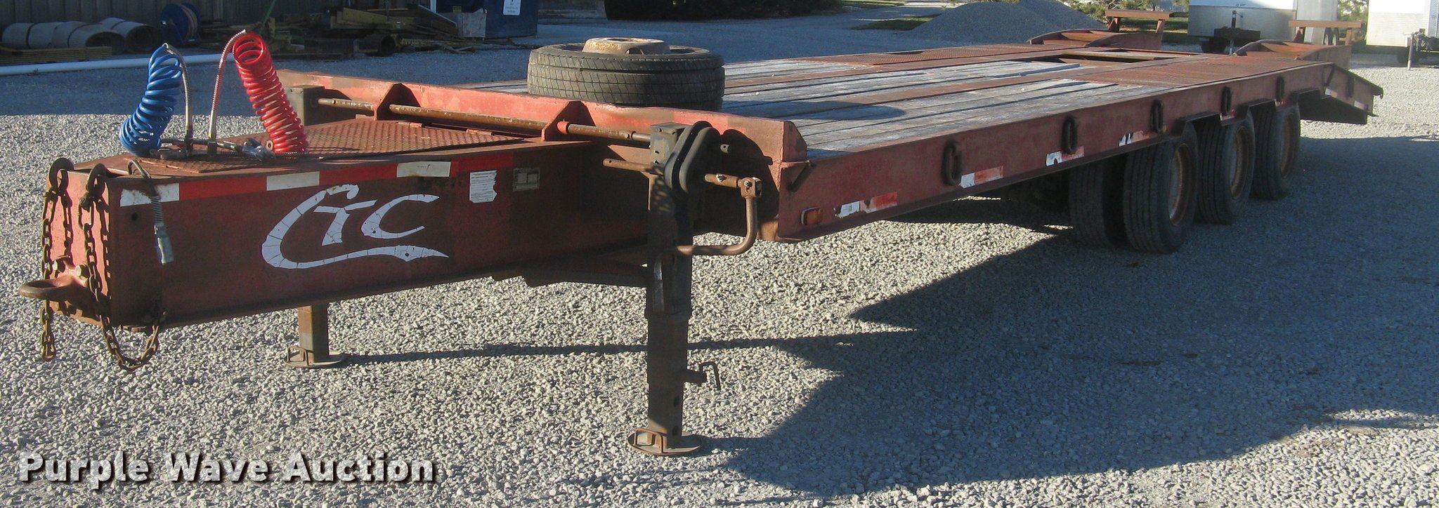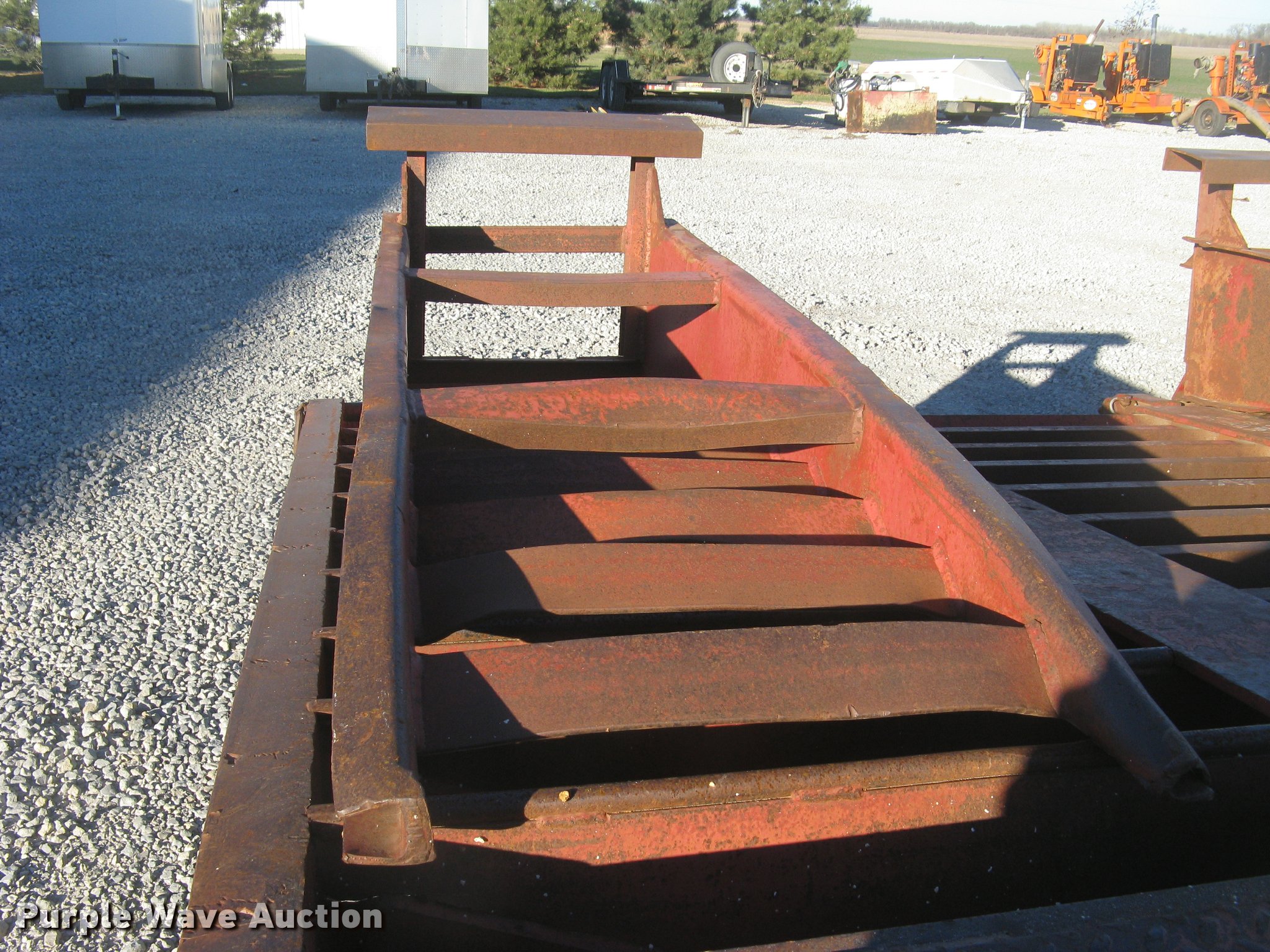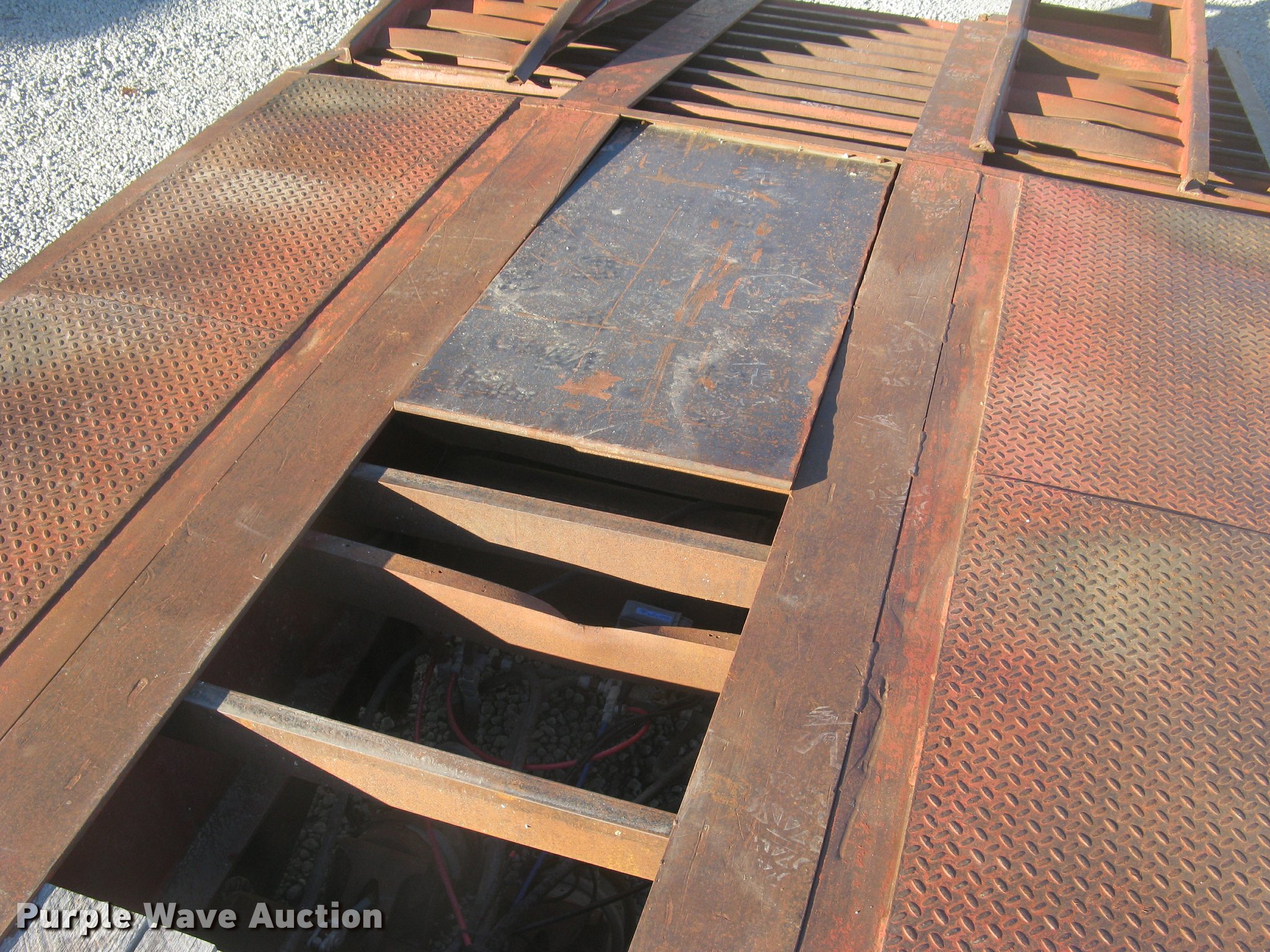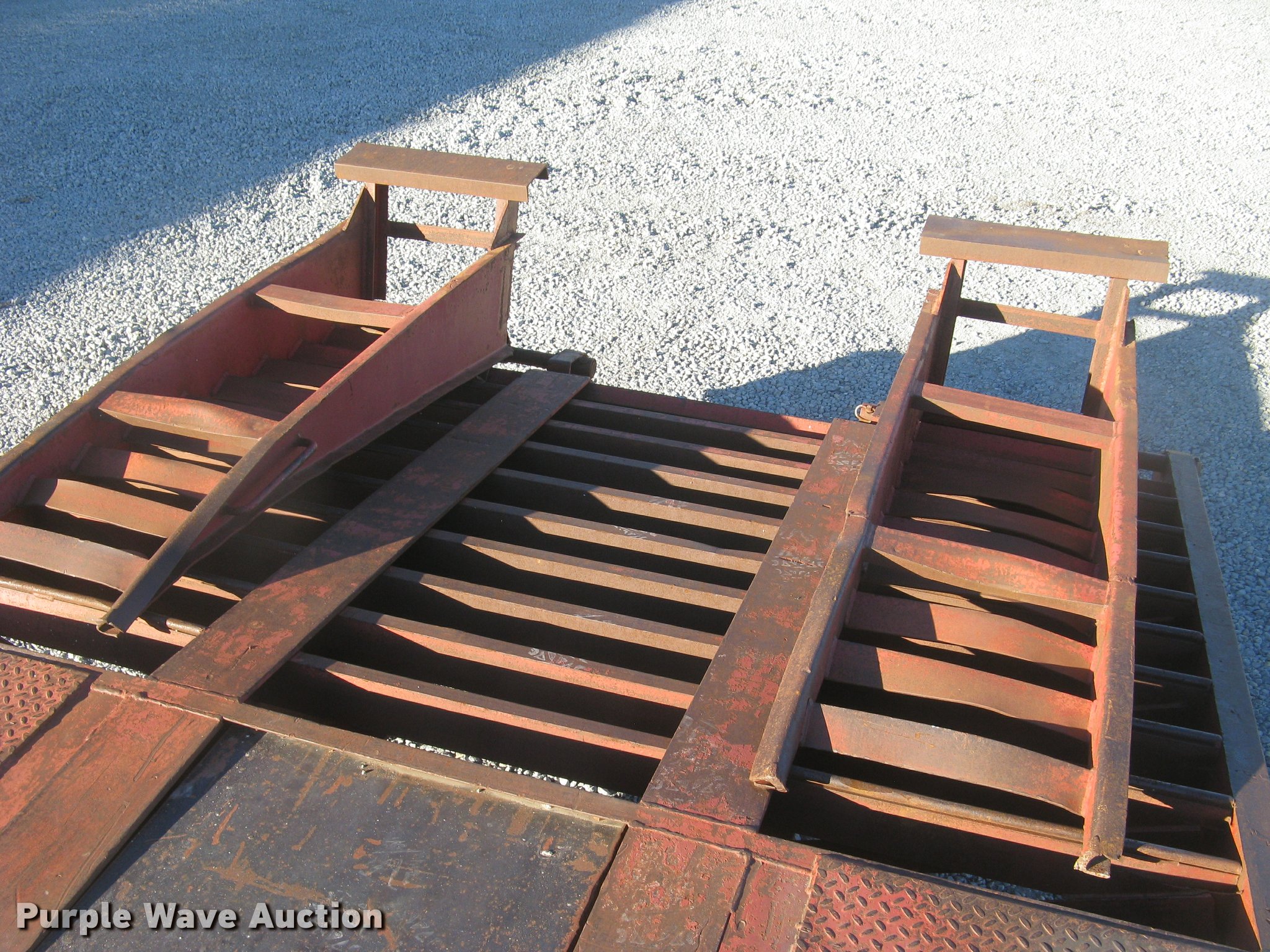 Purple Wave is selling a used Equip. Trailer in Kansas. This item is a 2001 Central equipment trailer with the following: 25'L x 102"W wood deck, 80"L dovetail, 72"L x 21"W ramps, D-ring tie downs, Tongue mounted storage, Dual leg landing gear, Adjustable height pintle hitch, Triple axle, Oil bath hubs, Spring suspension, Air brakes, 235/75R17.5 tires, GVWR 90,000 lbs