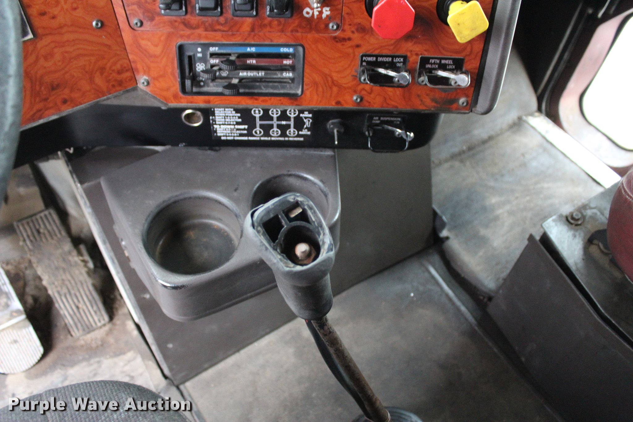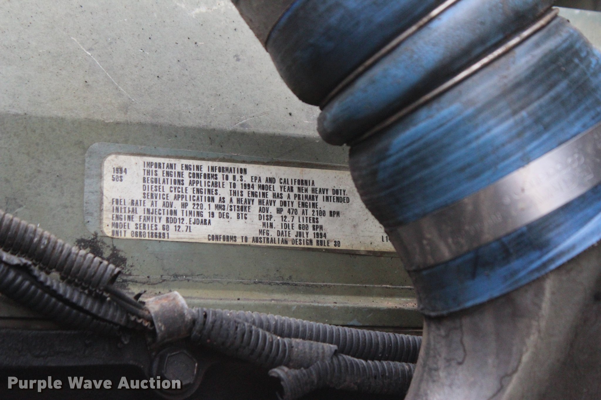 Purple Wave is selling a used Construction Dump Truck in Oklahoma. This item is a 1995 International 9200 dump truck with the following: 493,511 miles on odometer, Detroit Diesel Series 60 12.7L L6 turbo diesel engine, Eaton Fuller nine speed manual transmission, Tandem axle, AC and heat, Tilt, Cruise, AM/FM, Air suspension seat, PTO, 16'L x 96"W steel dump bed, Single ram hoist, Air operated end gate, Roll tarp, Dual fuel tanks, Air suspension, Air brakes, Engine brake, 11R24.5 tires, FAWR 12,000 lbs, IAWR 20,000 lbs, RAWR 20,000 lbs, Unit# 99