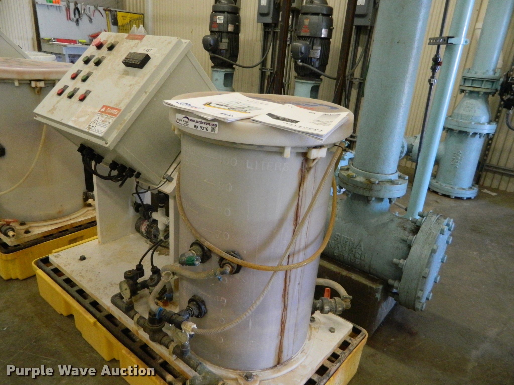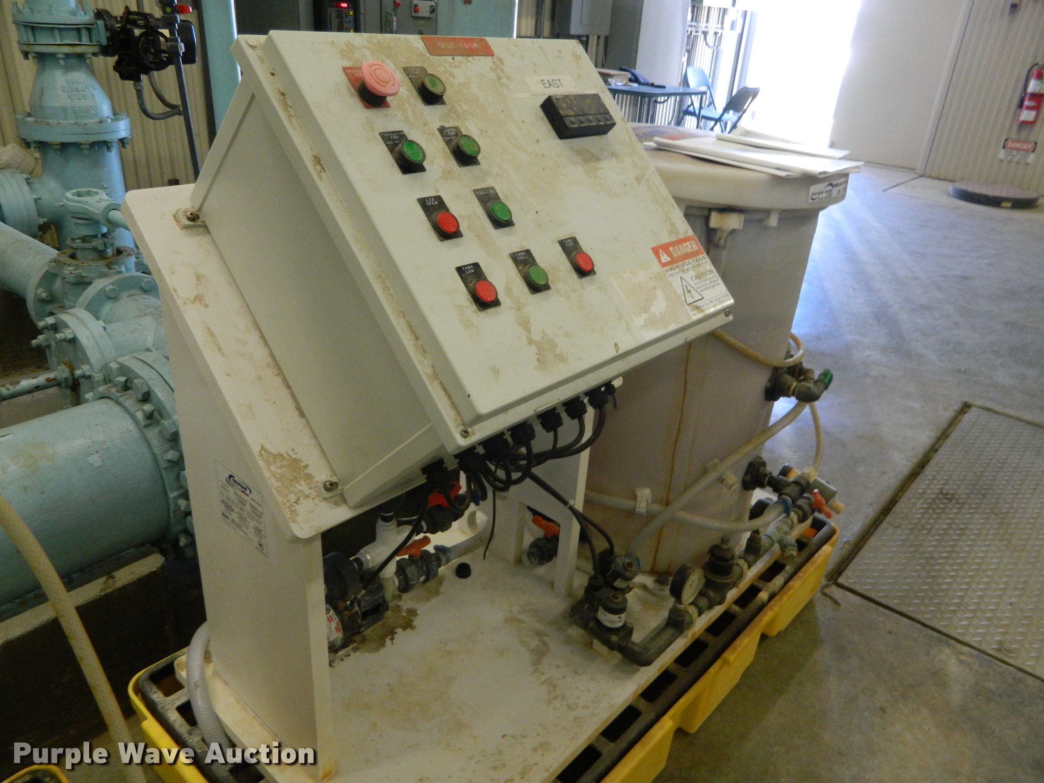 Constant Chlor Plus chemical injection discharge unit. 50 to 150 psi pressure range, 62 lbs dry chemical capacity, 0 to 25 gph pump discharge, 120V. Water Plant. 1000 Vine St. Hays, KS 67601