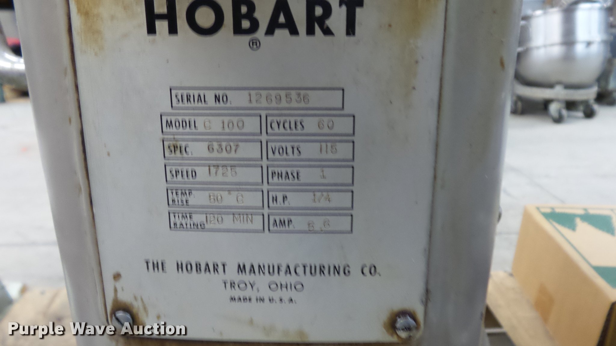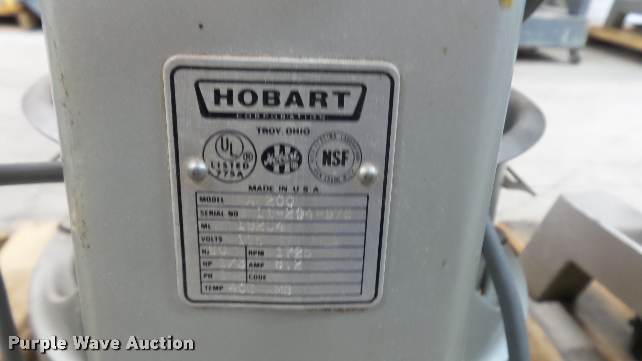 Purple Wave is selling a used Restaurant Equip. in Kansas. This item is a (2) Hobart mixers with the following: Model 200, 1/3 HP, Bowl, Whip, Paddle, Meat grinder, Serial 11-294-976, Model C100, 1/4 HP, Single phase, Bowl, Whip, (2) paddles, (2) dough paddles, Serial 1269536