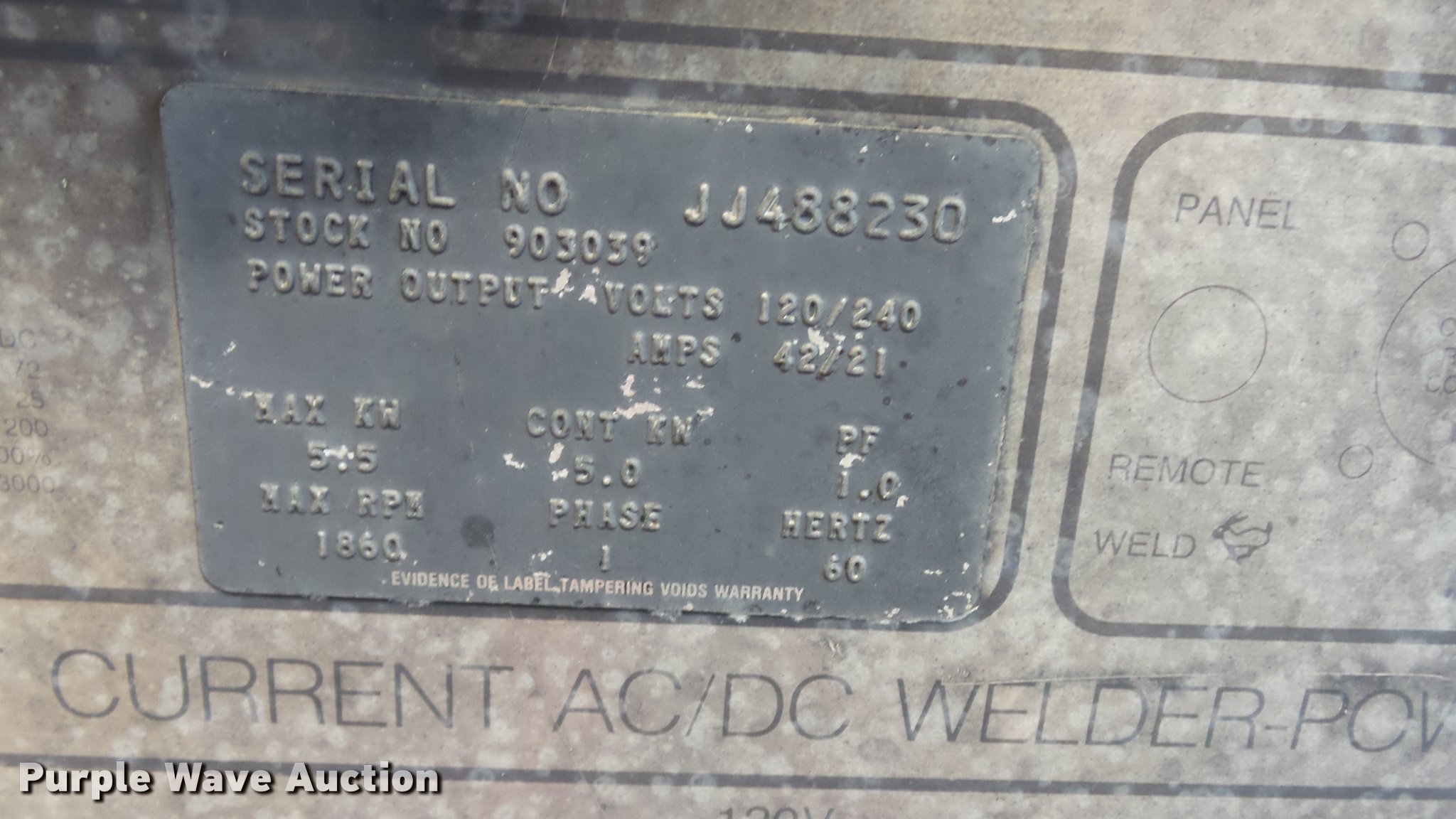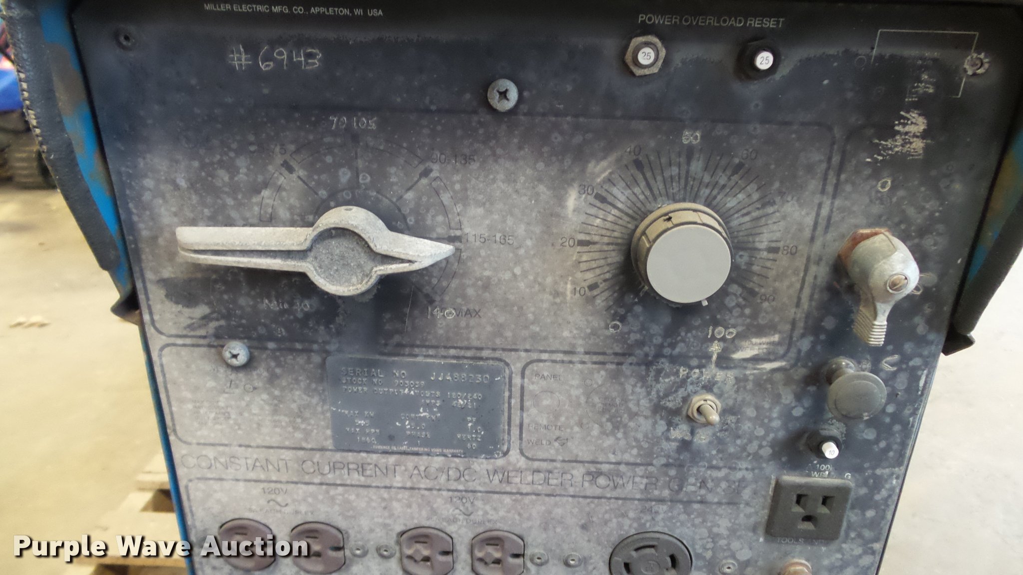Purple Wave is selling a used Welder (Manual) in Kansas. This item is a Miller AC/DC welder generator with the following: Single phase, Battery needs replaced, Serial JJ488230