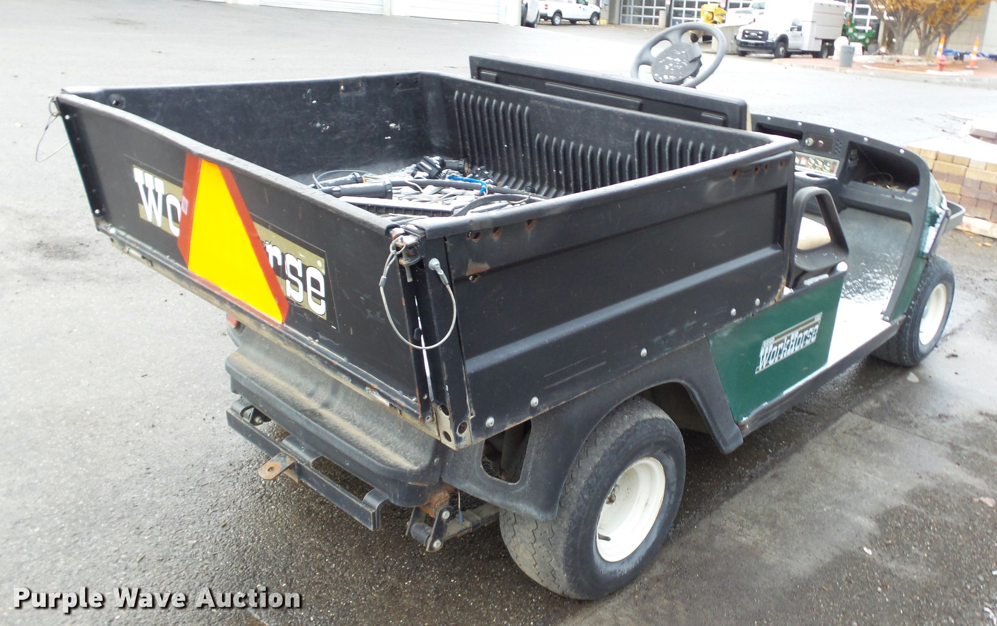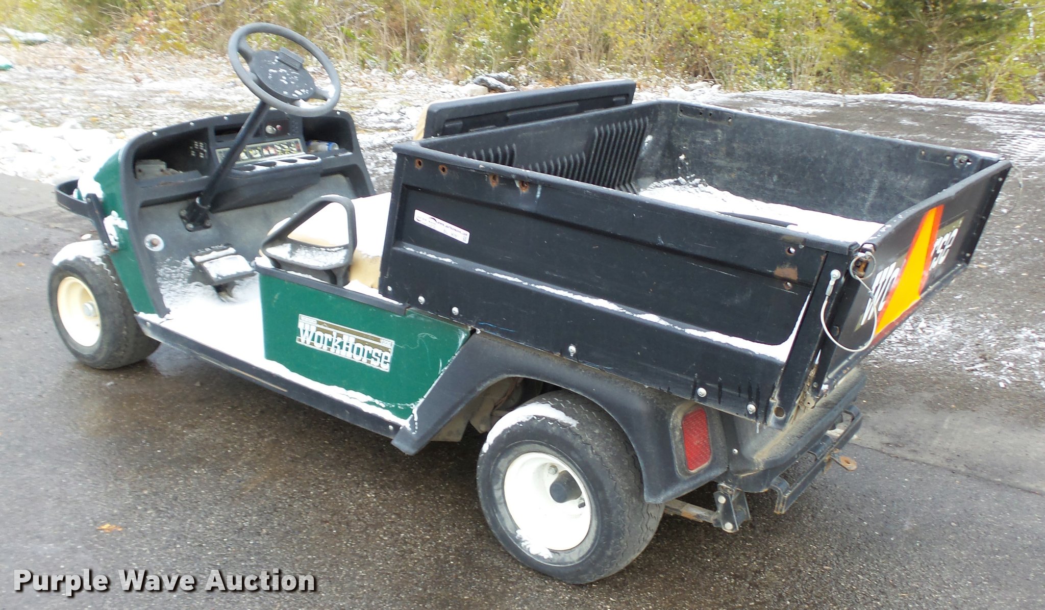 Purple Wave is selling a used Golf Cart in Kansas. This item is a EZ GO Workhorse 1200 golf cart with the following: Gas engine, Vinyl seat, 4' x 41" x 12" dump bed, 18 x 8.50-8 tires, Serial 1546068