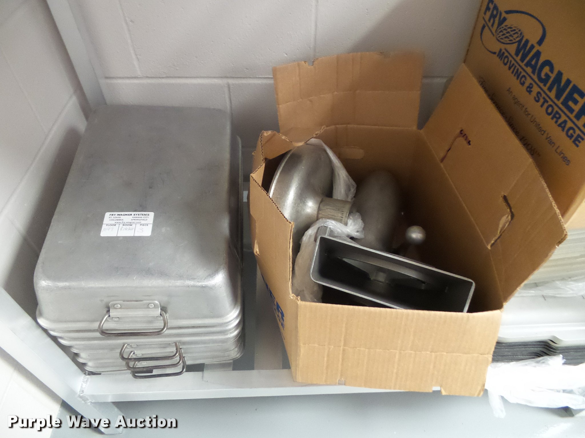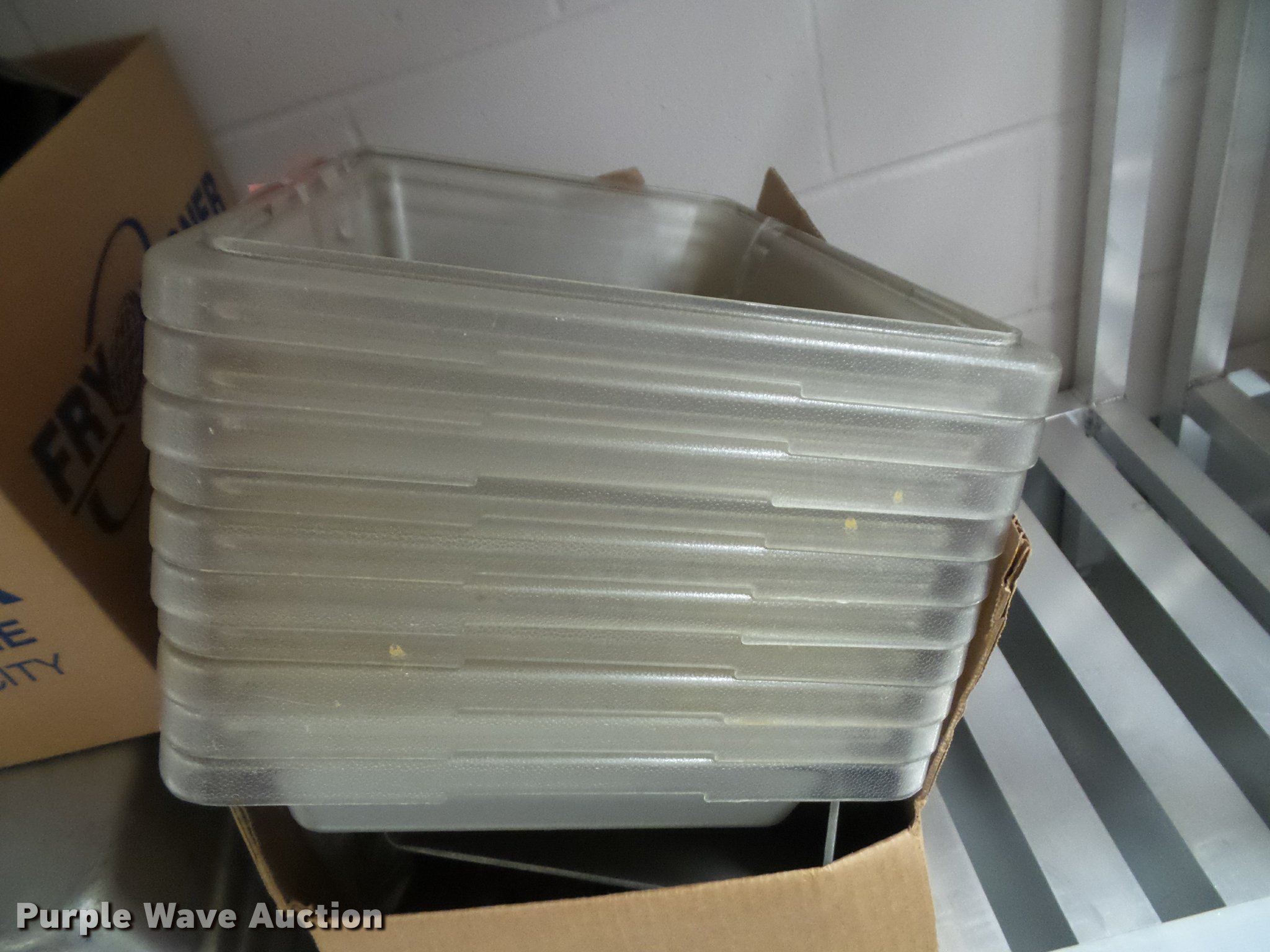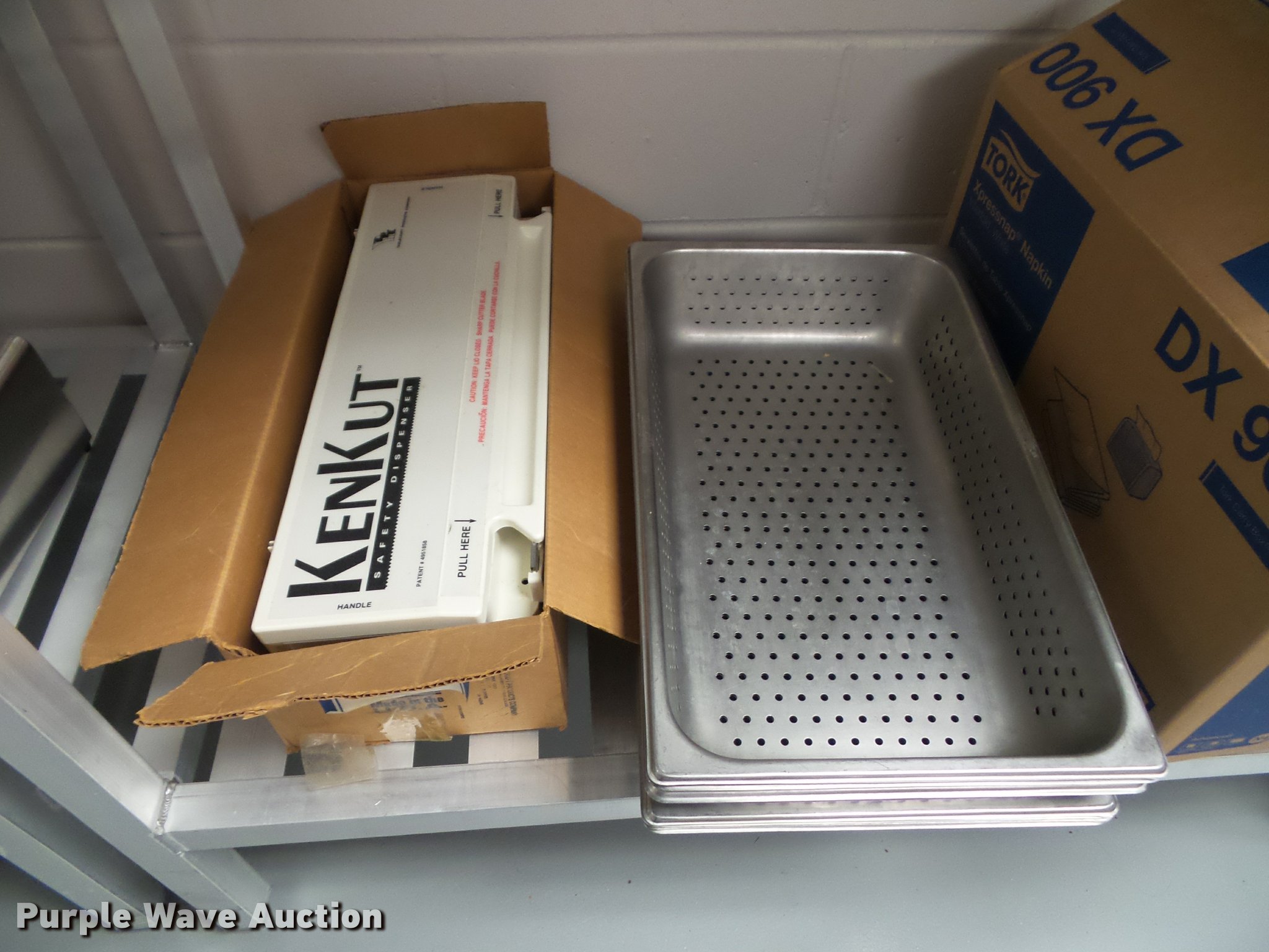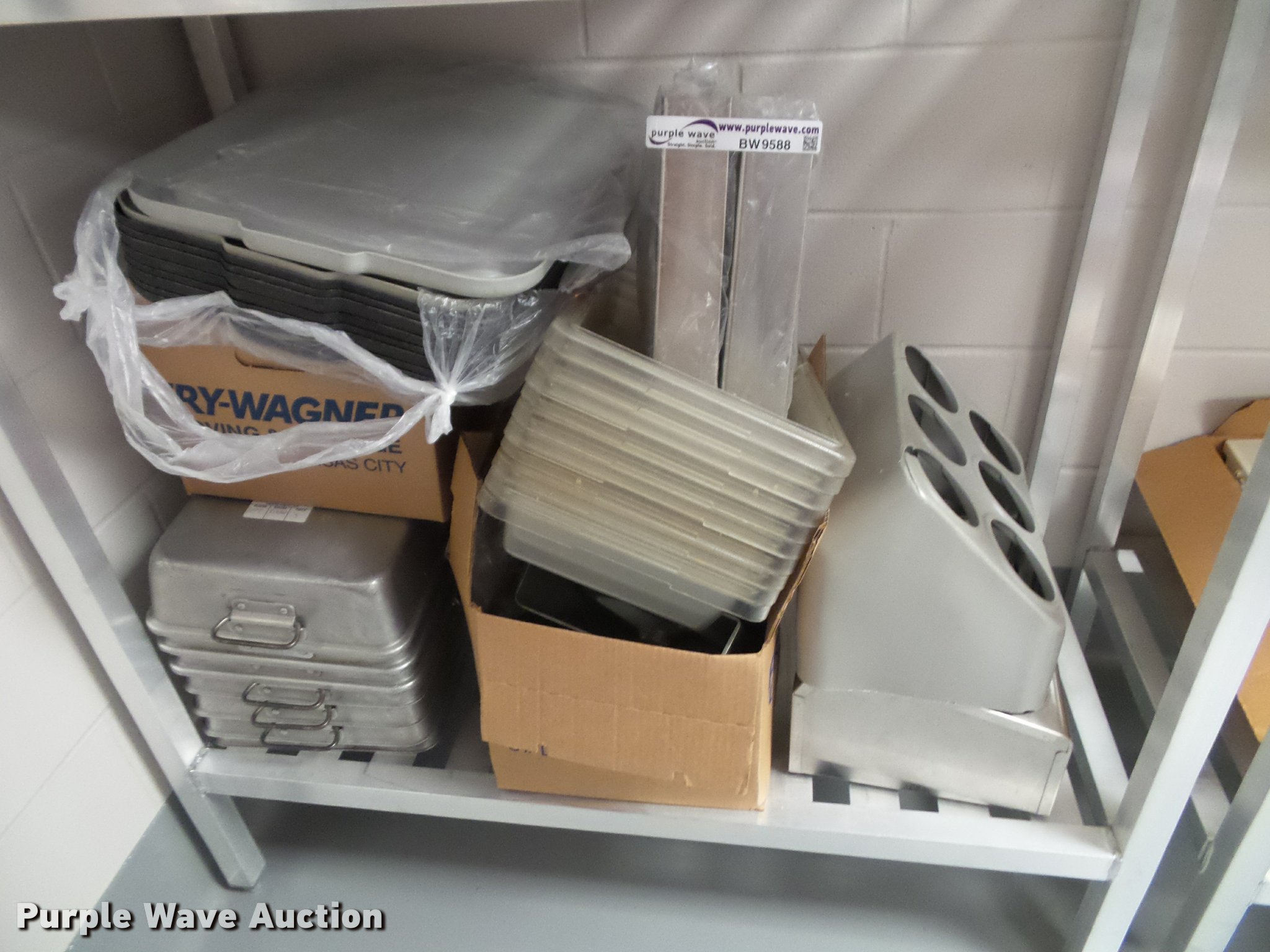 Purple Wave is selling a used Restaurant Equip. in Kansas. This item is a Kitchen equipment with the following: (2) utensil holders, Kenkut safety dispenser, (7) steam table pans, (7) stainless steel pans, (10) plastic food trays, Meat grinder parts, Plastic tote lids, Assorted kitchen items