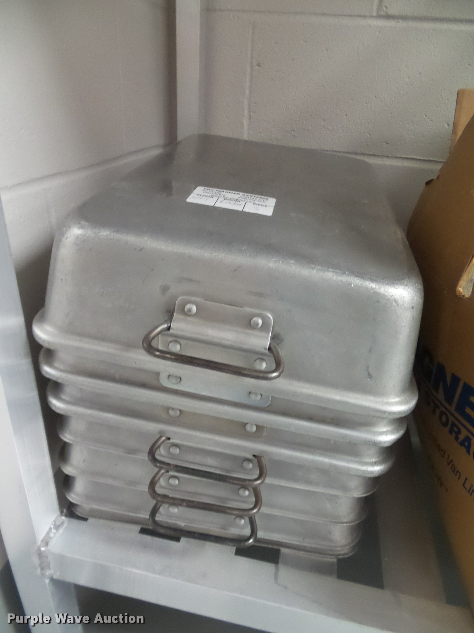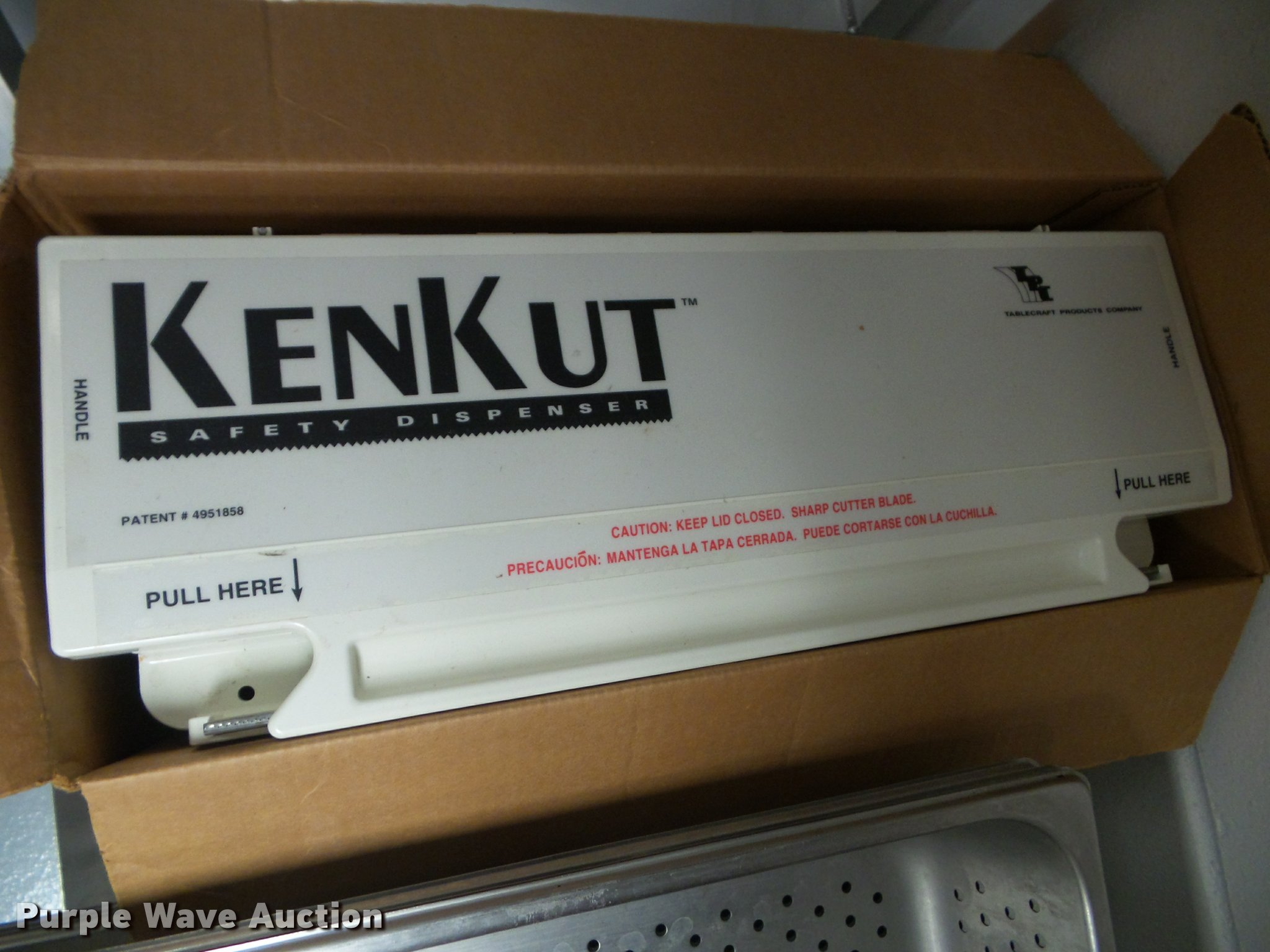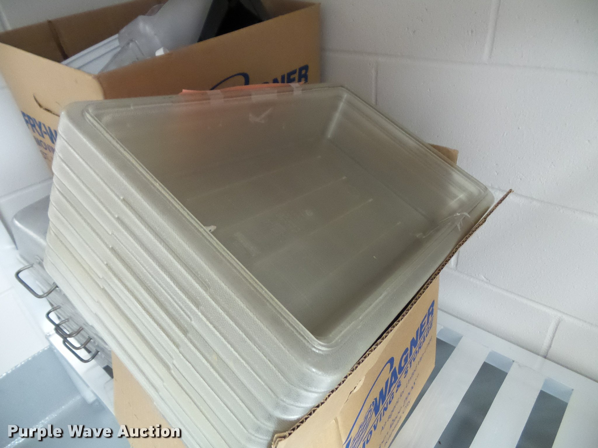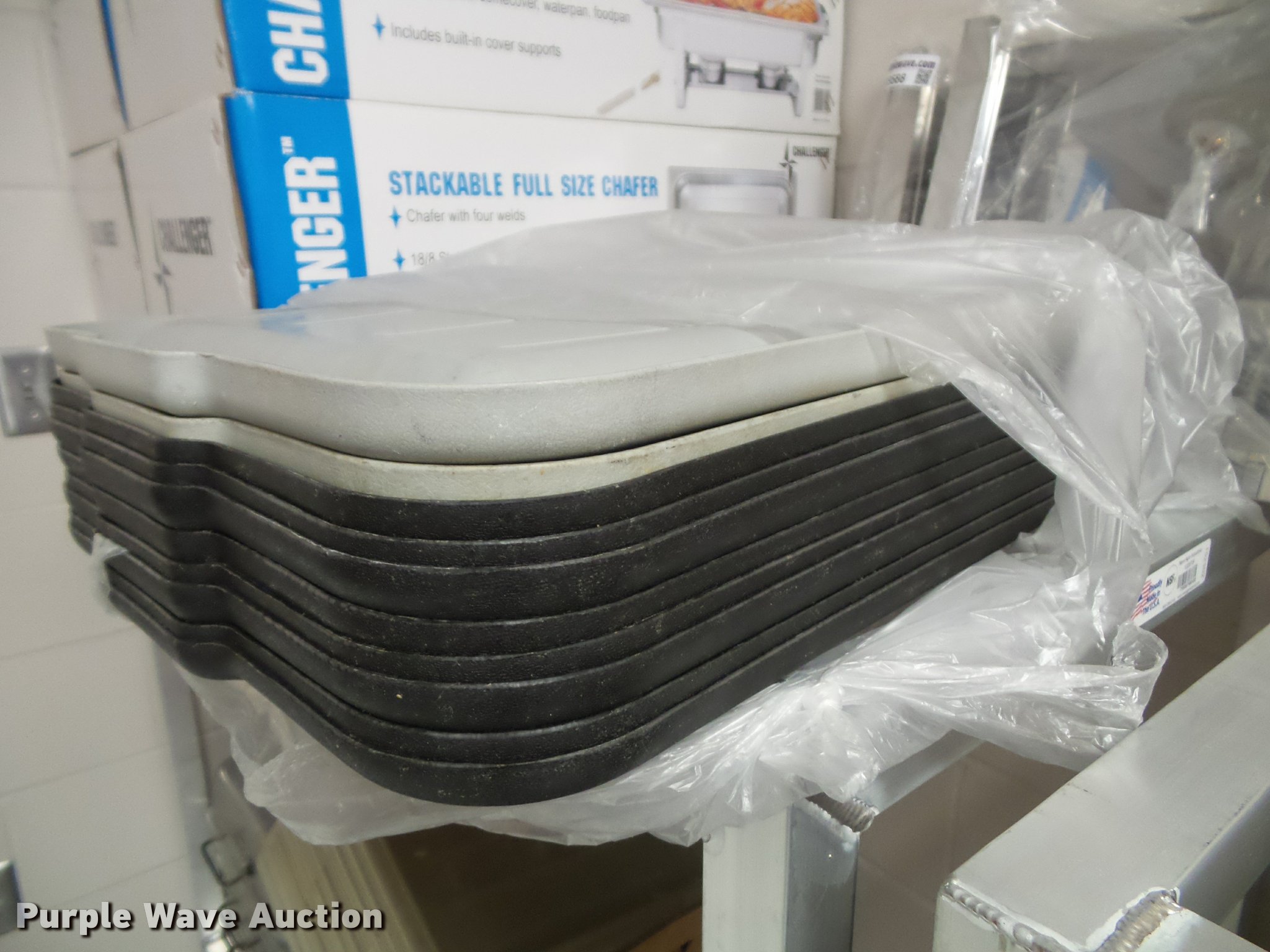 Purple Wave is selling a used Restaurant Equip. in Kansas. This item is a Kitchen equipment with the following: (2) utensil holders, Kenkut safety dispenser, (7) steam table pans, (7) stainless steel pans, (10) plastic food trays, Meat grinder parts, Plastic tote lids, Assorted kitchen items