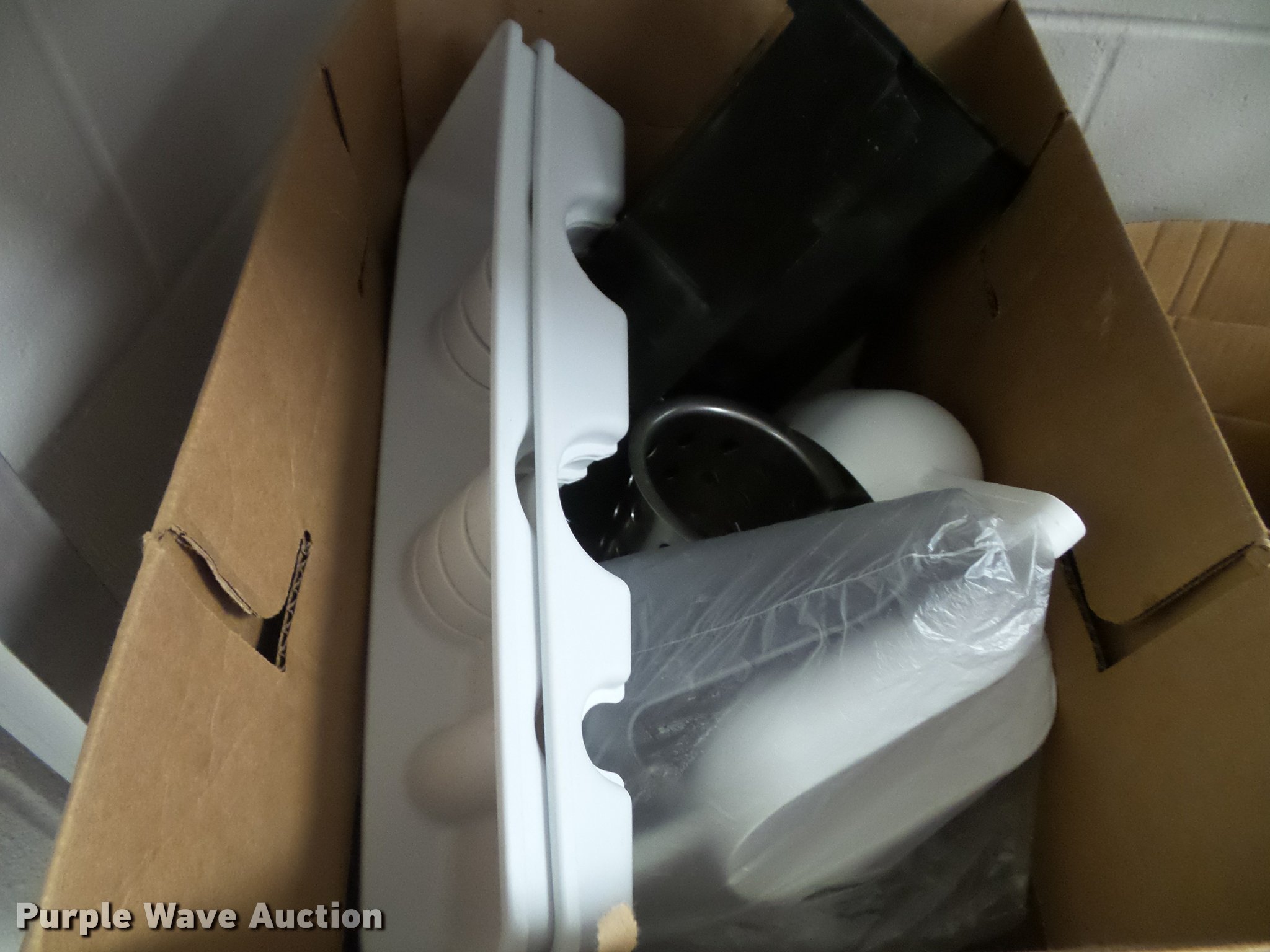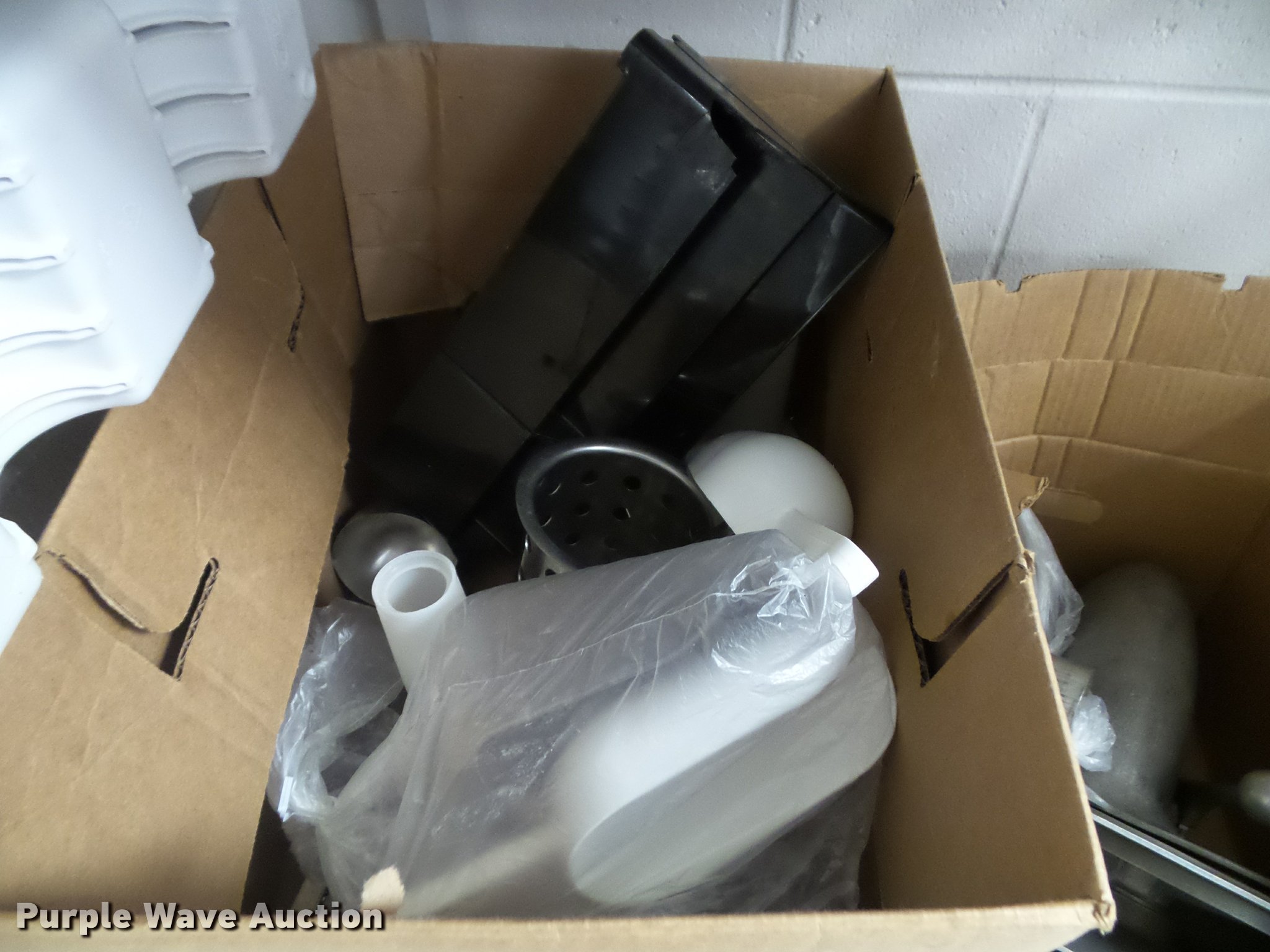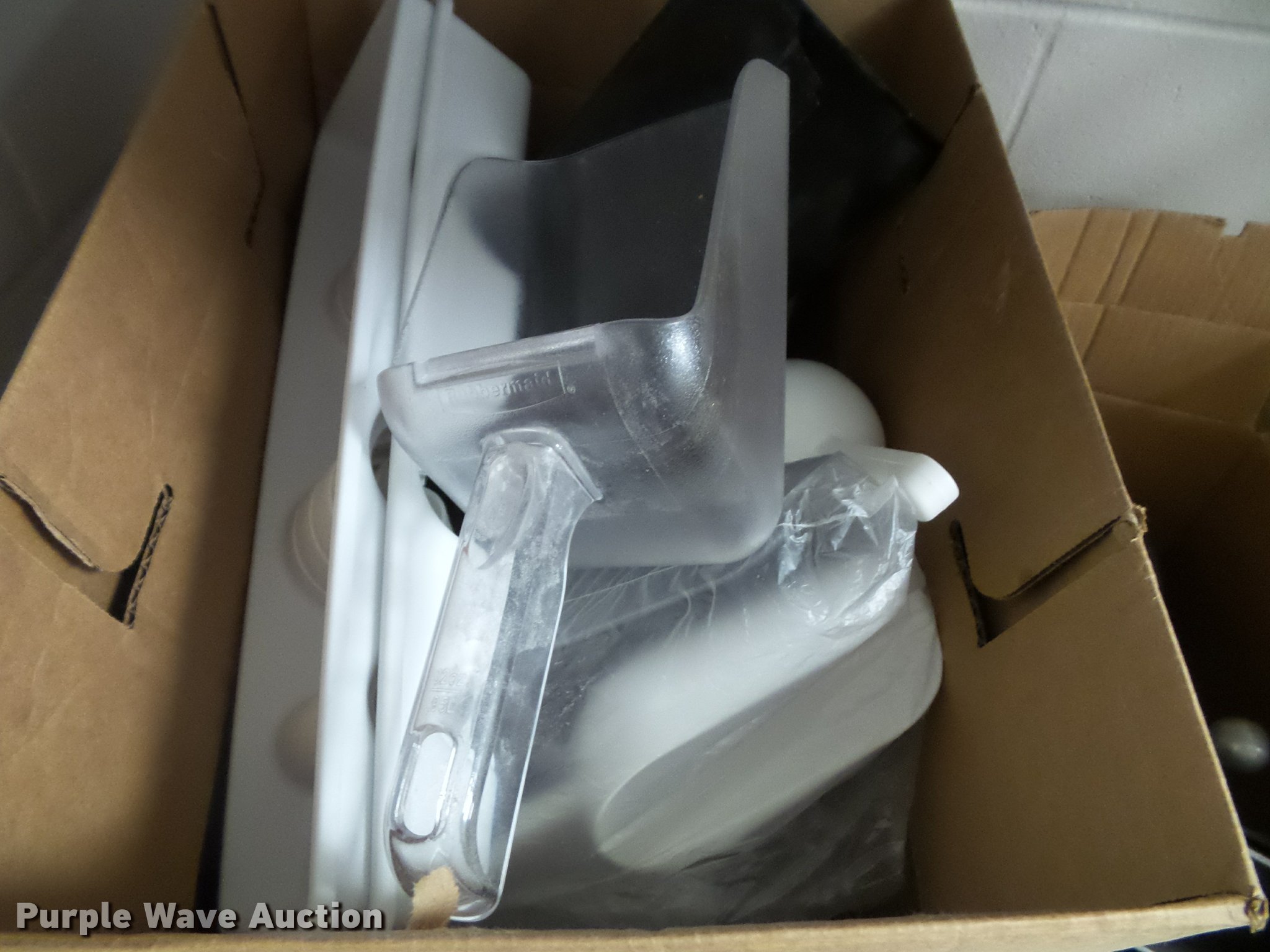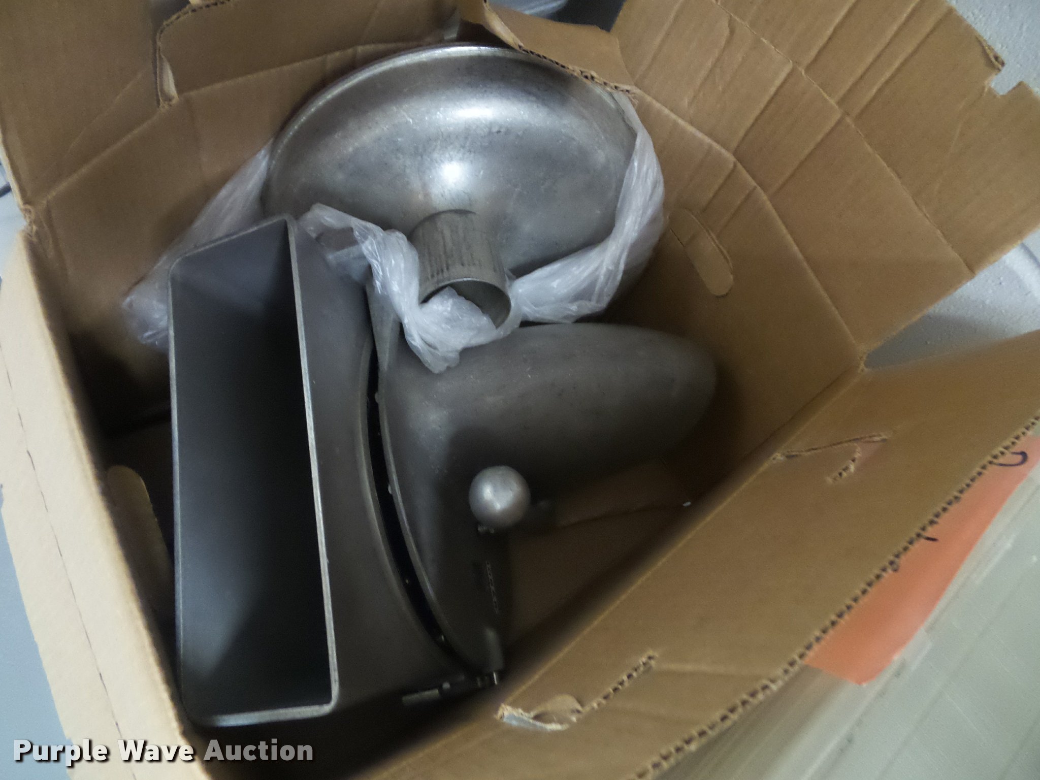 Purple Wave is selling a used Restaurant Equip. in Kansas. This item is a Kitchen equipment with the following: (2) utensil holders, Kenkut safety dispenser, (7) steam table pans, (7) stainless steel pans, (10) plastic food trays, Meat grinder parts, Plastic tote lids, Assorted kitchen items