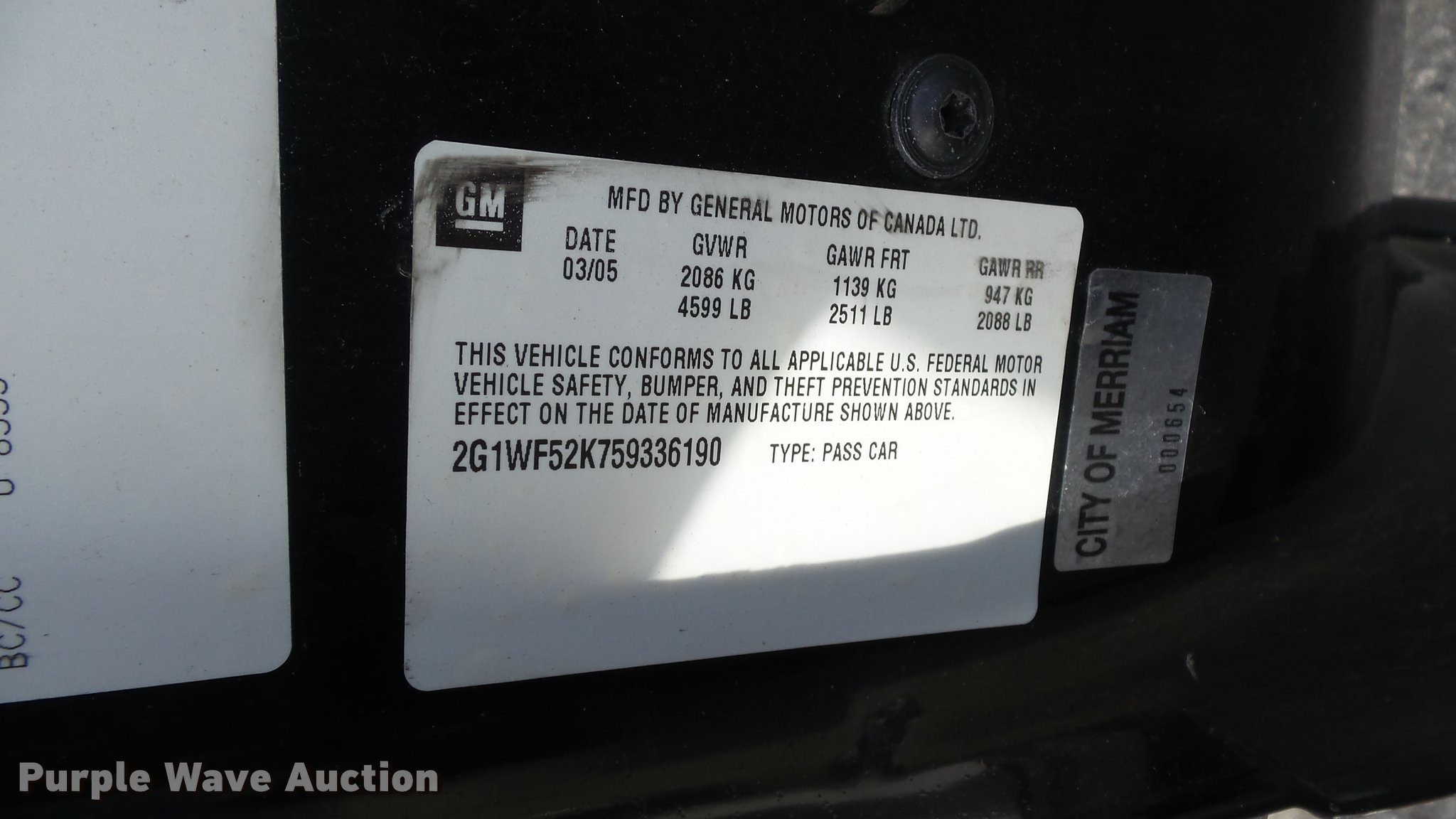 2005 Chevrolet Impala. 135,072 miles on odometer, 3.8L V6 OHV 12V gas engine, Automatic transmission, AC and heat, Tilt, Cruise, AM/FM/cassette, Power windows, locks, mirrors, and seat, Cloth interior, 225/60R16 tires, Paint chipping, Unit# 16. Kansas title. 2G1WF52K759336190. Merriam, KS 66203