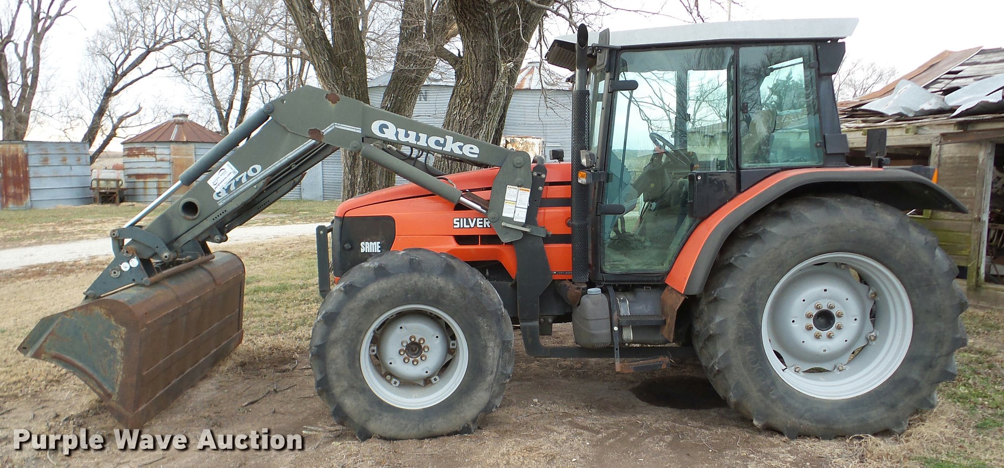 Purple Wave is selling a used Tractor in Kansas. This item is a Same Silver 100GUDT MFWD tractor with the following: 3,071 hours on meter, Six cylinder diesel engine, Hydrostatic transmission, AC and heat, Quicke Q770 loader, 75"W grapple bucket, Quick attach, Bale spear, Joystick controls, Three point, 540 PTO, (3) rear hydraulic remotes, 16.9R24 front tires, 18.4R34 rear tires, Dead battery, Hard to start, Serial SLU106UT6313