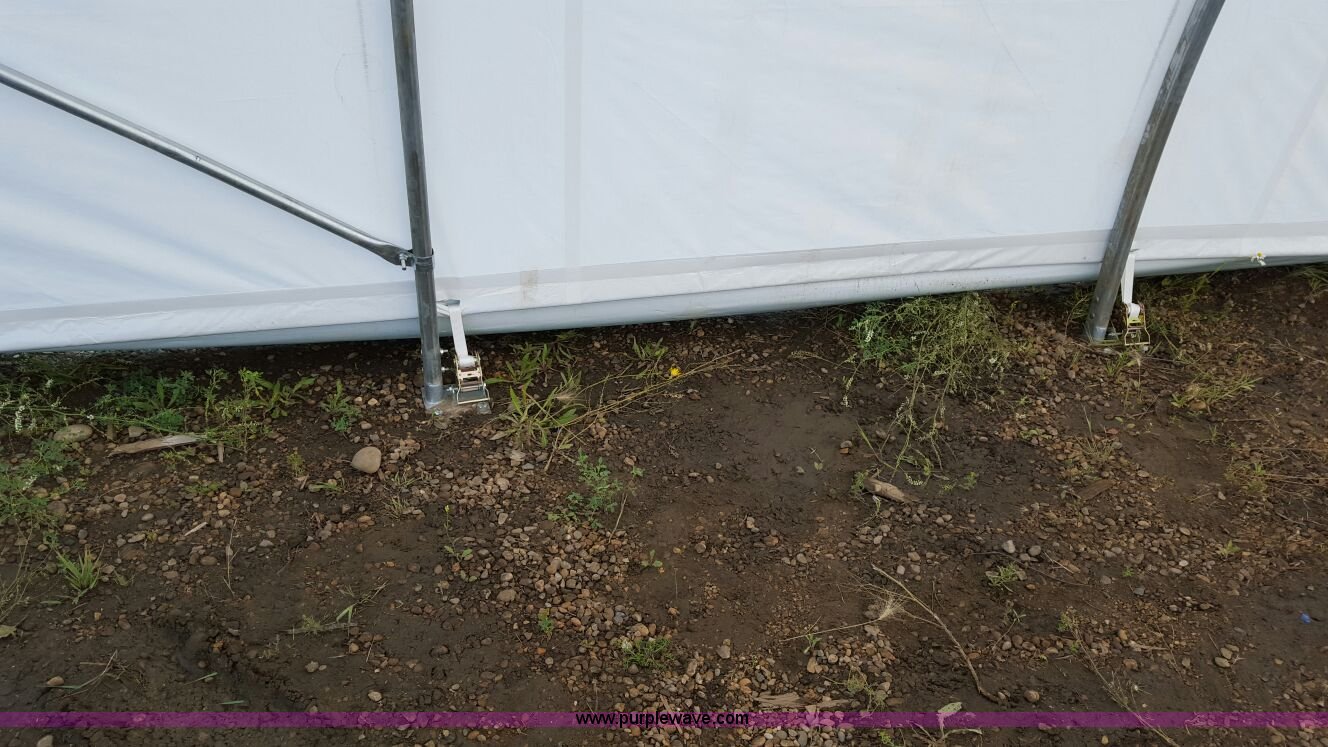 Purple Wave is selling a used Building Materials in Kansas. This item is a Canvas fabric storage building with the following: 30'L x 20'W x 12'H, UV inhibitor, Galvanized steel frame, Rip stop fabric, Side wind brace supports, 10.5 oz. PE fabric backed cover and door, Protective plastic end caps for exposed tube ends, Roll up mechanical doors on both ends, Poly rope for main cover tie down, Rope holes have heavy duty grommets for durability, Zipper wide body door, Full open back, UV fire storage shelter building shed, (2) rear windows, Shelter installation manual, Unused