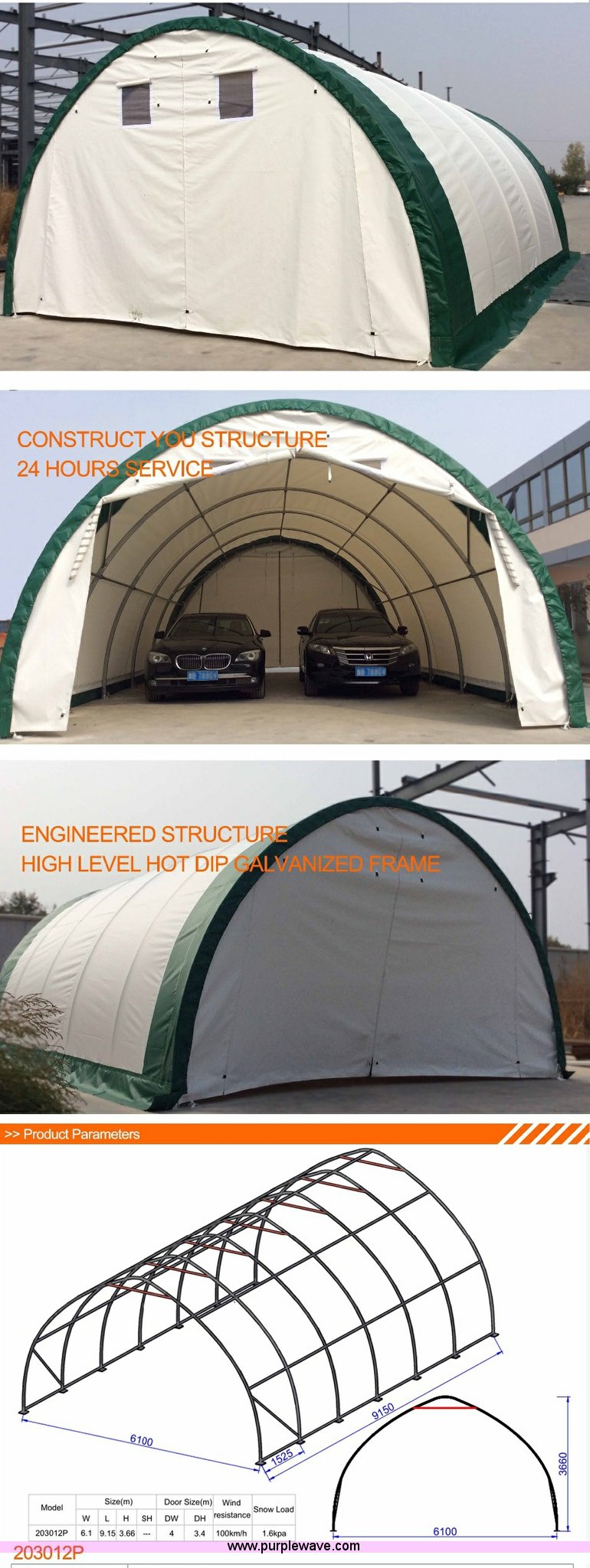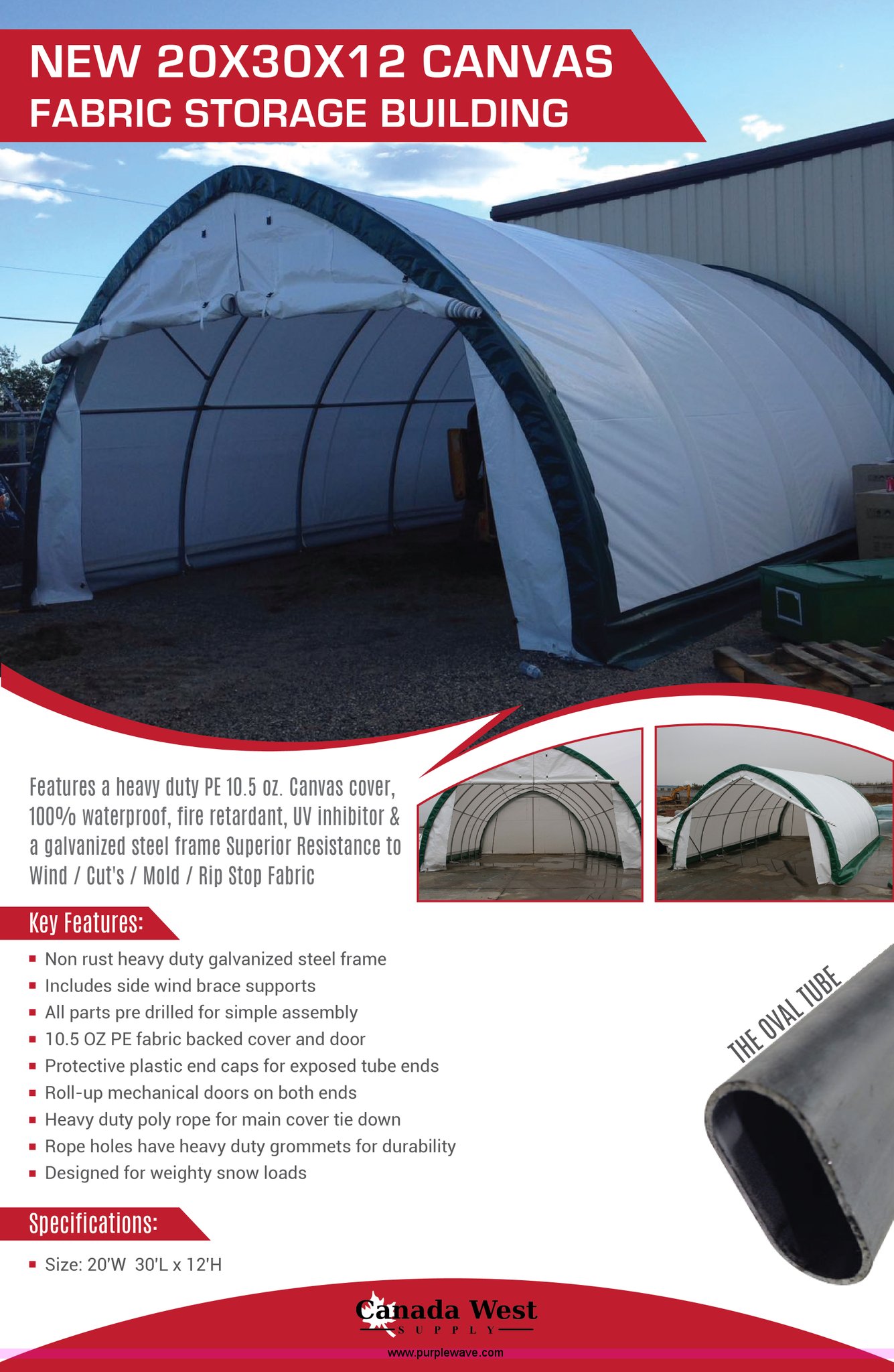Canvas fabric storage building. 30'L x 20'W x 12'H, UV inhibitor, Galvanized steel frame, Rip stop fabric, Side wind brace supports, 10.5 oz. PE fabric backed cover and door, Protective plastic end caps for exposed tube ends, Roll up mechanical doors on both ends, Poly rope for main cover tie down, Rope holes have heavy duty grommets for durability, Zipper wide body door Full open back, UV fire storage shelter building shed, (2) rear windows, Shelter installation manual, Unused. Seller provided shipping available. Contact seller for specific information. Representative photo. Canada West Supply. 17451 Bayside Drive. Tonganoxie, KS 66086