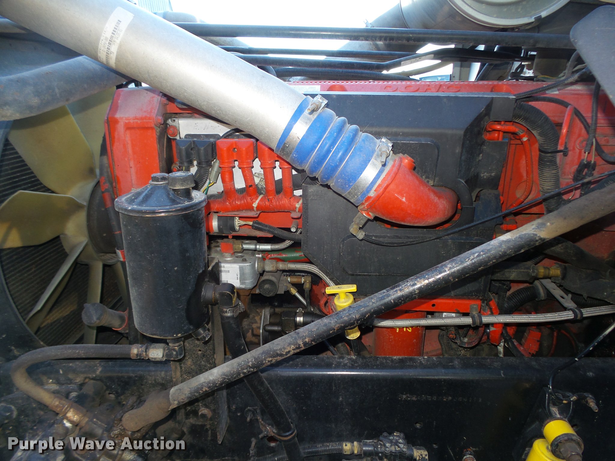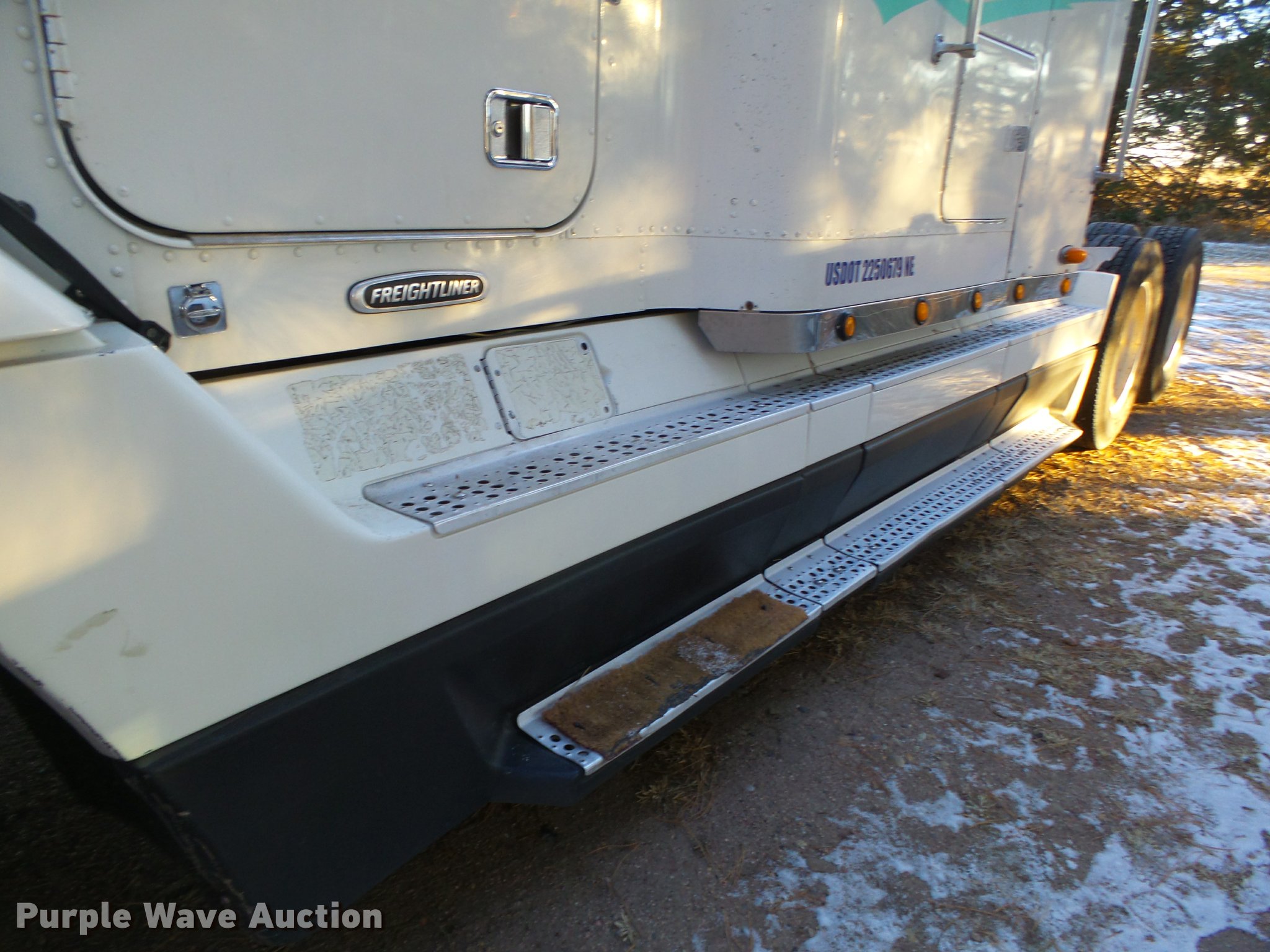 Purple Wave is selling a used Truck Tractor in Nebraska. This item is a 2002 Freightliner FLD120 semi truck with the following: 1,085,409 miles on odometer, Miles may vary, still in use, Cummins ISX450ST2 14.9L L6 turbo diesel engine, Serial 14018336, Meritor 10 speed manual transmission, Tandem axle, Inter-axle differential lock, AC and heat, Tilt, Telescoping steering wheel, Cruise, AM/FM/CD, Power windows, Power and heated mirrors, Air suspension seat, Air ride cab, Cloth interior, Passenger daylight door, Spotlight, Cetect Road Relay monitor, Fog lights, Block heater, 60" sleeper, 66"H I.D., Single bed, Refrigerator, Rear climate control, Cab extenders, Dump valves, Exterior visor, Front tow hooks, Single rear exhaust stack, Aluminum deck plate, Fixed fifth wheel plate, Dual 150 gallon fuel tanks, Receiver hitch, Full length fairings, Quarter fenders, Mud flaps, Air suspension, Air brakes, Engine brake, 230" wheelbase, Aluminum wheels, Bridgestone 285/75R24.5 front tires, Bridgestone 285/75R24.5 rear tires, GVWR 52,000 lbs, FAWR 12,000 lbs, IAWR 20,000 lbs, RAWR 20,000 lbs, Unit only has one key, Doors will not lock