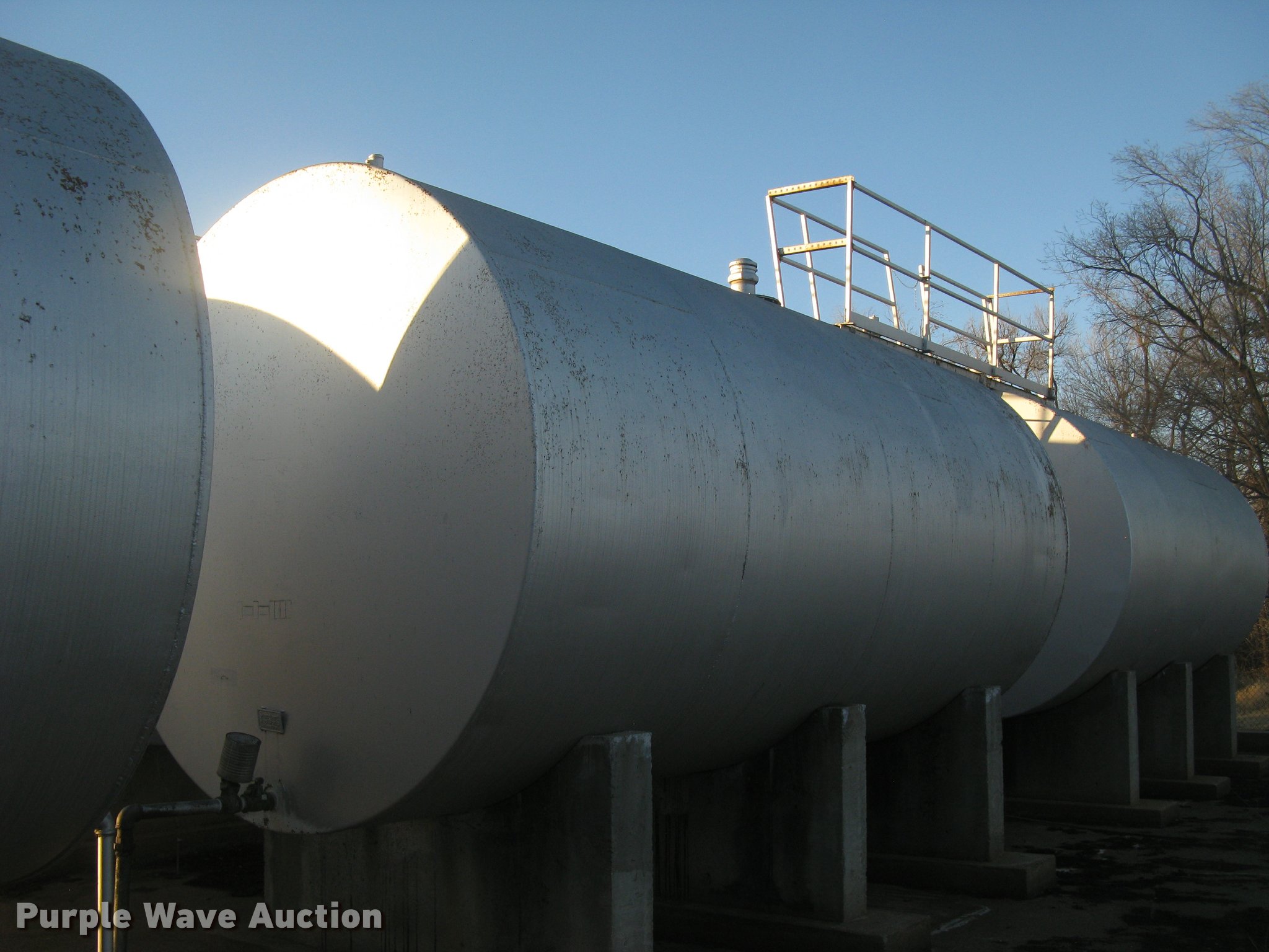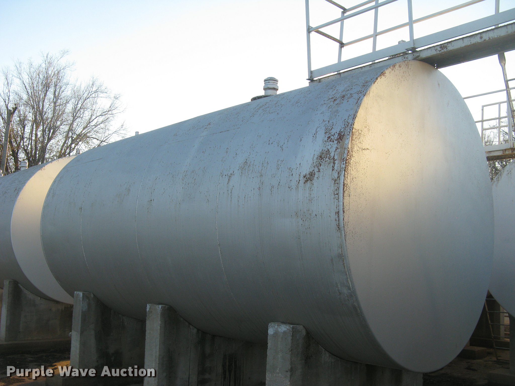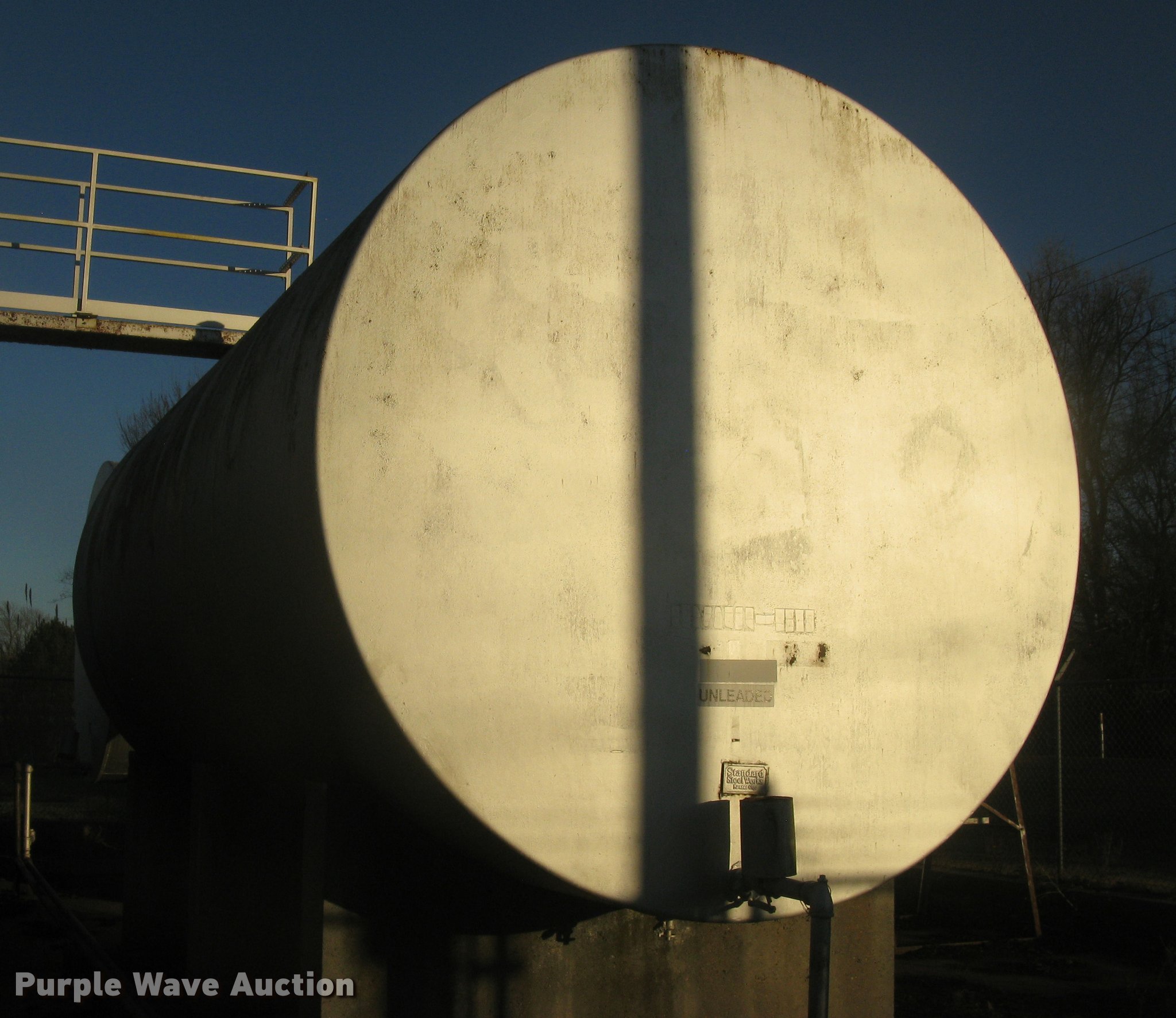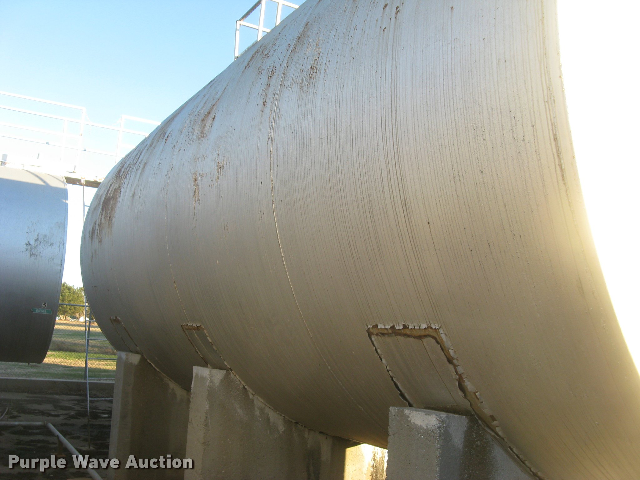 Purple Wave is selling a used Fuel and Lube in Kansas. This item is a Bulk fuel fill center with the following: (7) Standard Steel Works single wall fuel tanks, #1, 20'L x 10' diameter, 12,000 gallon capacity, Piped in conjunction with tank #7, Previously used for gasoline, #2, 20'L x 10' diameter, 12,000 gallon capacity, #3, 20'L x 10' diameter, 12,000 gallon capacity, Previously used for gasoline, #4, 16'L x 8' diameter, (2) chamers, 6,000 gallon capacity, Previously used for diesel, #5, 20'L x 10' diameter, 12,000 gallon capacity, Previously used for diesel, #6, 20'L x 10' diameter, 12,000 gallon capacity, Previously used for diesel, #7, 20'L x 10' diameter, 12,000 gallon capacity, Previously used for gasoline,, (2) steel catwalks and ladders, Approx. 14'L and 28'L, Approx. 300' steel pipe fuel supply lines with pedestal stands, Approx. 90' steel pipe at fill station with elbows, valves, and Kamlok caps, (3) Gorman-Rupp fuel pumps, 1.5 HP electric motors, 115/230V, Single phase, (2) Morrison bulk fill fuel nozzles, 36"L fill tubes, Steel filling platform with staircase, 8'L platform, Electric will be disconnected by seller just above ground level, Fence will be removed by seller and is not included, Concrete tank stands are poured in place and not included