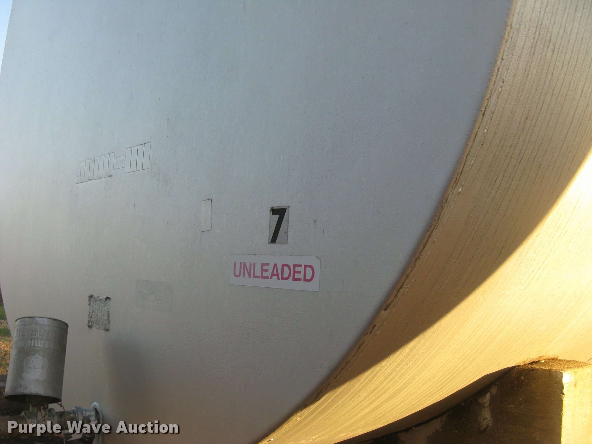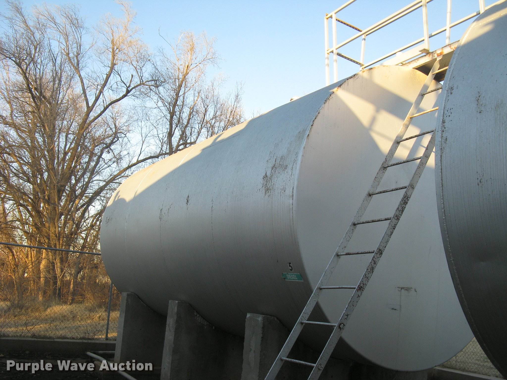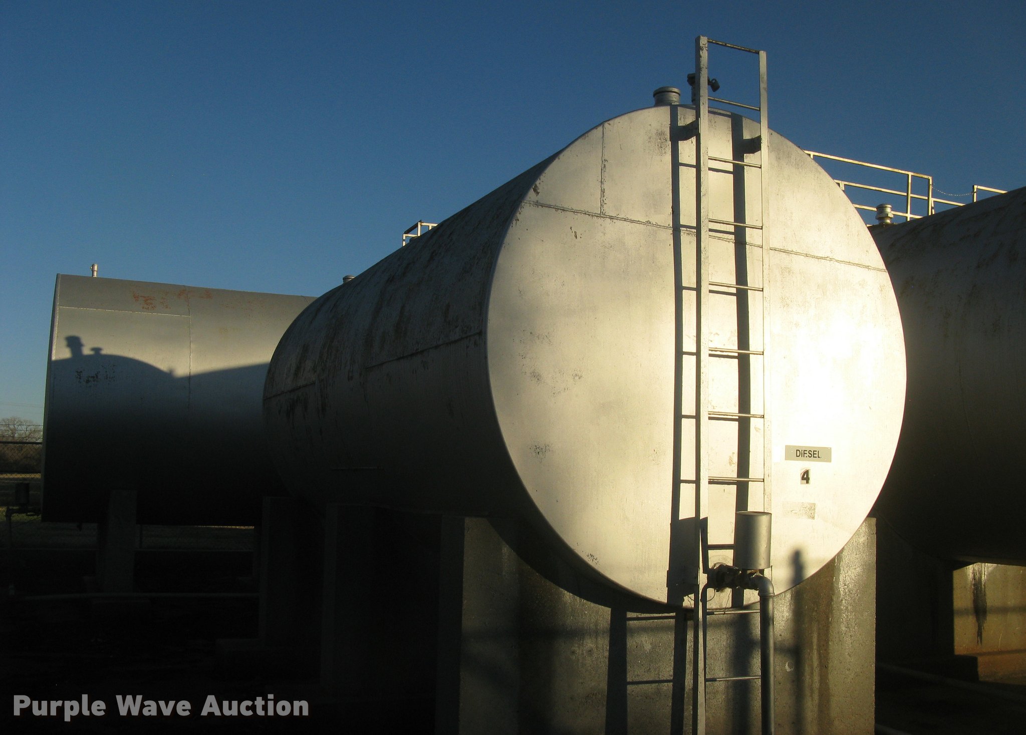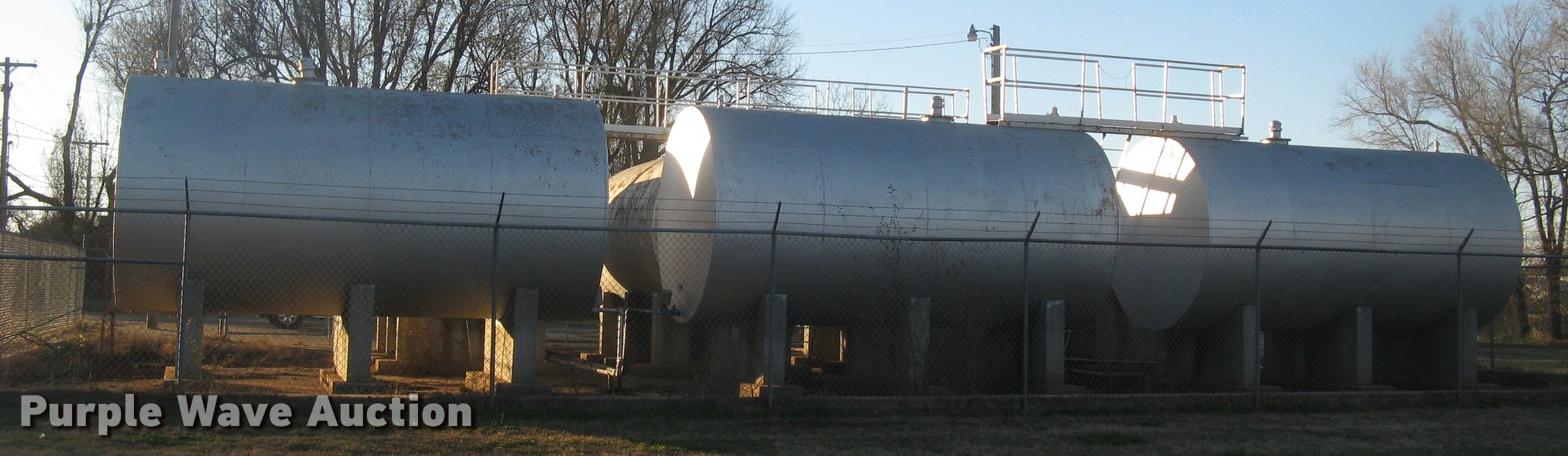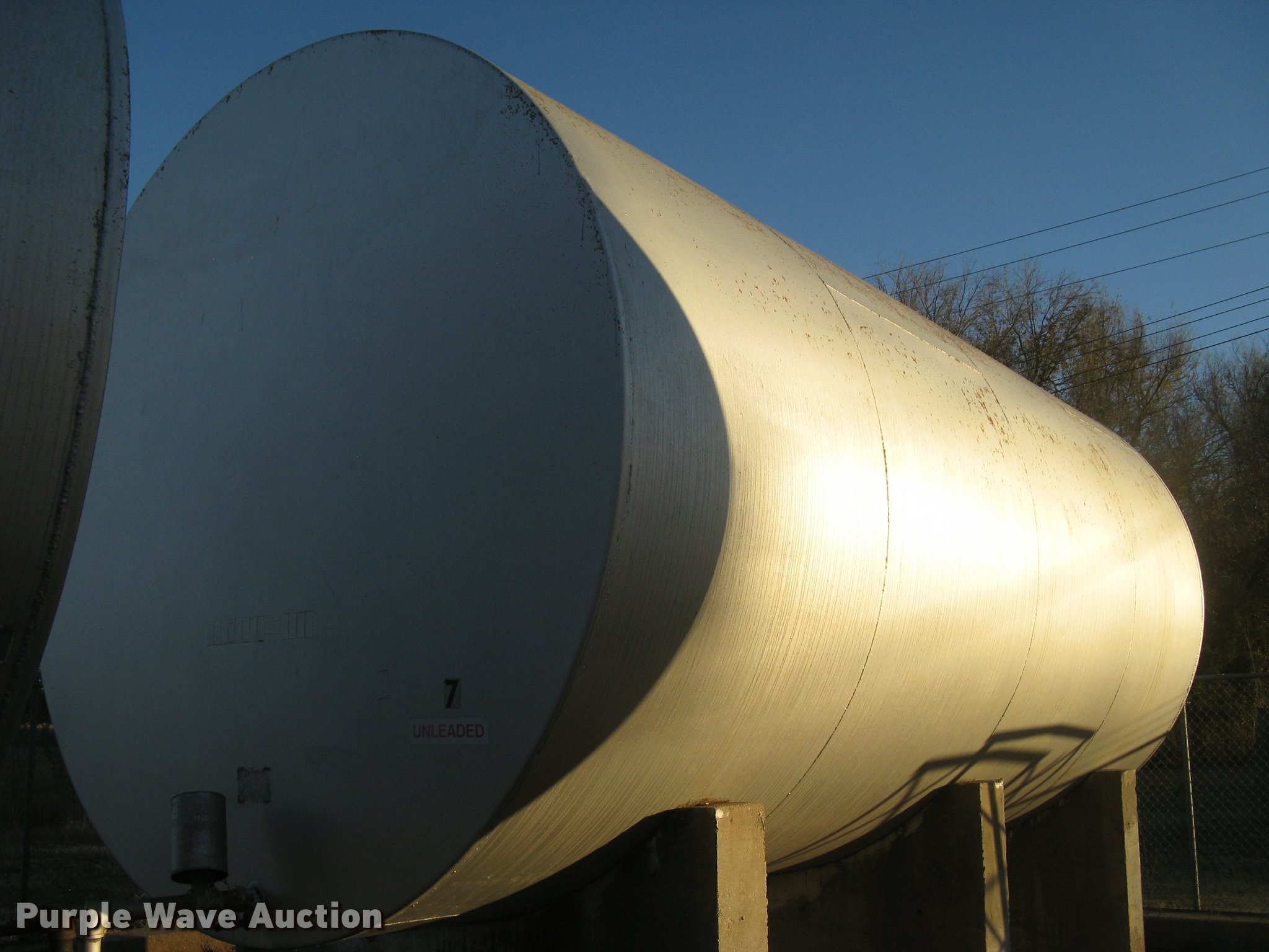 Purple Wave is selling a used Fuel and Lube in Kansas. This item is a Bulk fuel fill center with the following: (7) Standard Steel Works single wall fuel tanks, #1, 20'L x 10' diameter, 12,000 gallon capacity, Piped in conjunction with tank #7, Previously used for gasoline, #2, 20'L x 10' diameter, 12,000 gallon capacity, #3, 20'L x 10' diameter, 12,000 gallon capacity, Previously used for gasoline, #4, 16'L x 8' diameter, (2) chamers, 6,000 gallon capacity, Previously used for diesel, #5, 20'L x 10' diameter, 12,000 gallon capacity, Previously used for diesel, #6, 20'L x 10' diameter, 12,000 gallon capacity, Previously used for diesel, #7, 20'L x 10' diameter, 12,000 gallon capacity, Previously used for gasoline,, (2) steel catwalks and ladders, Approx. 14'L and 28'L, Approx. 300' steel pipe fuel supply lines with pedestal stands, Approx. 90' steel pipe at fill station with elbows, valves, and Kamlok caps, (3) Gorman-Rupp fuel pumps, 1.5 HP electric motors, 115/230V, Single phase, (2) Morrison bulk fill fuel nozzles, 36"L fill tubes, Steel filling platform with staircase, 8'L platform, Electric will be disconnected by seller just above ground level, Fence will be removed by seller and is not included, Concrete tank stands are poured in place and not included