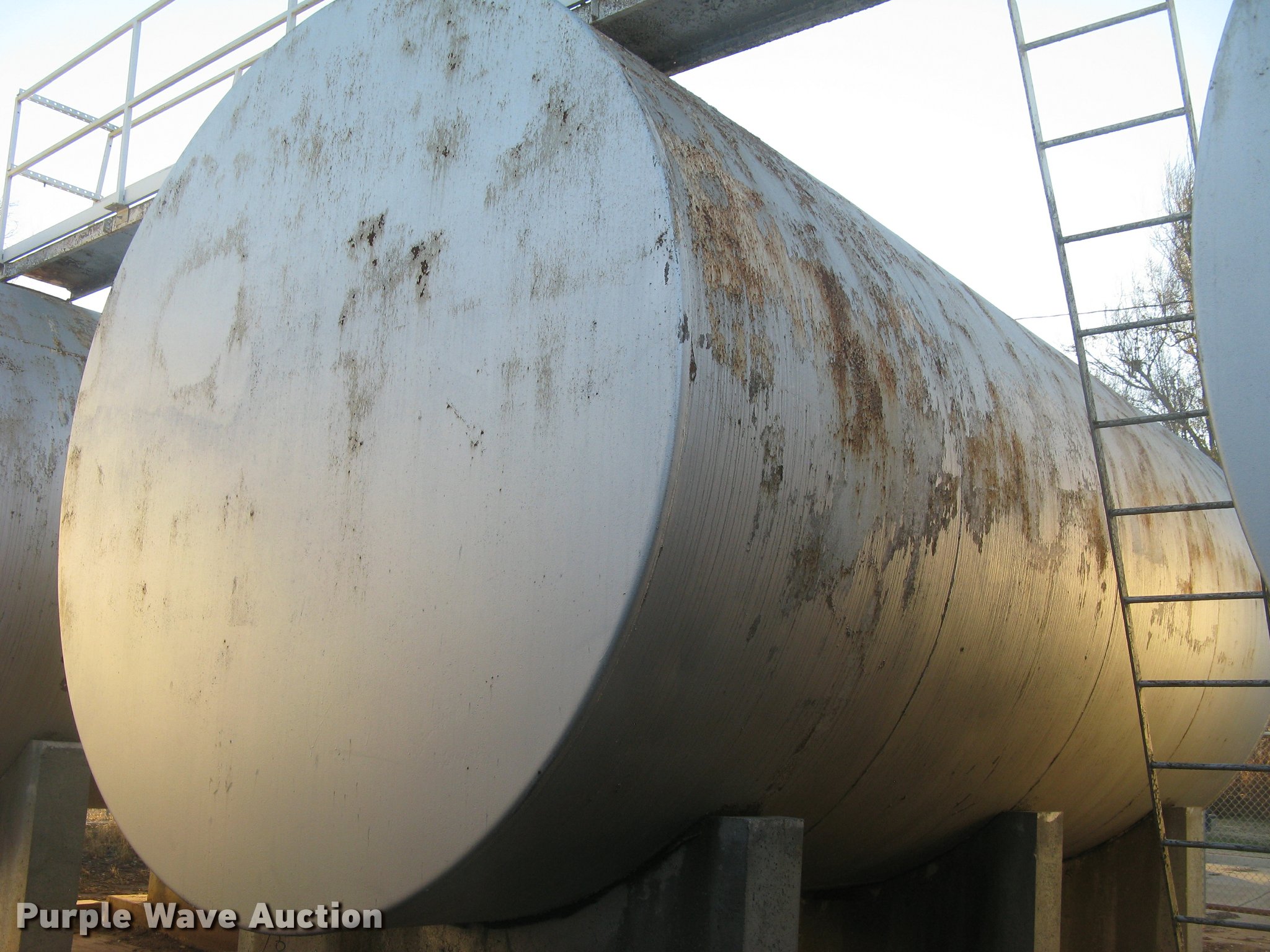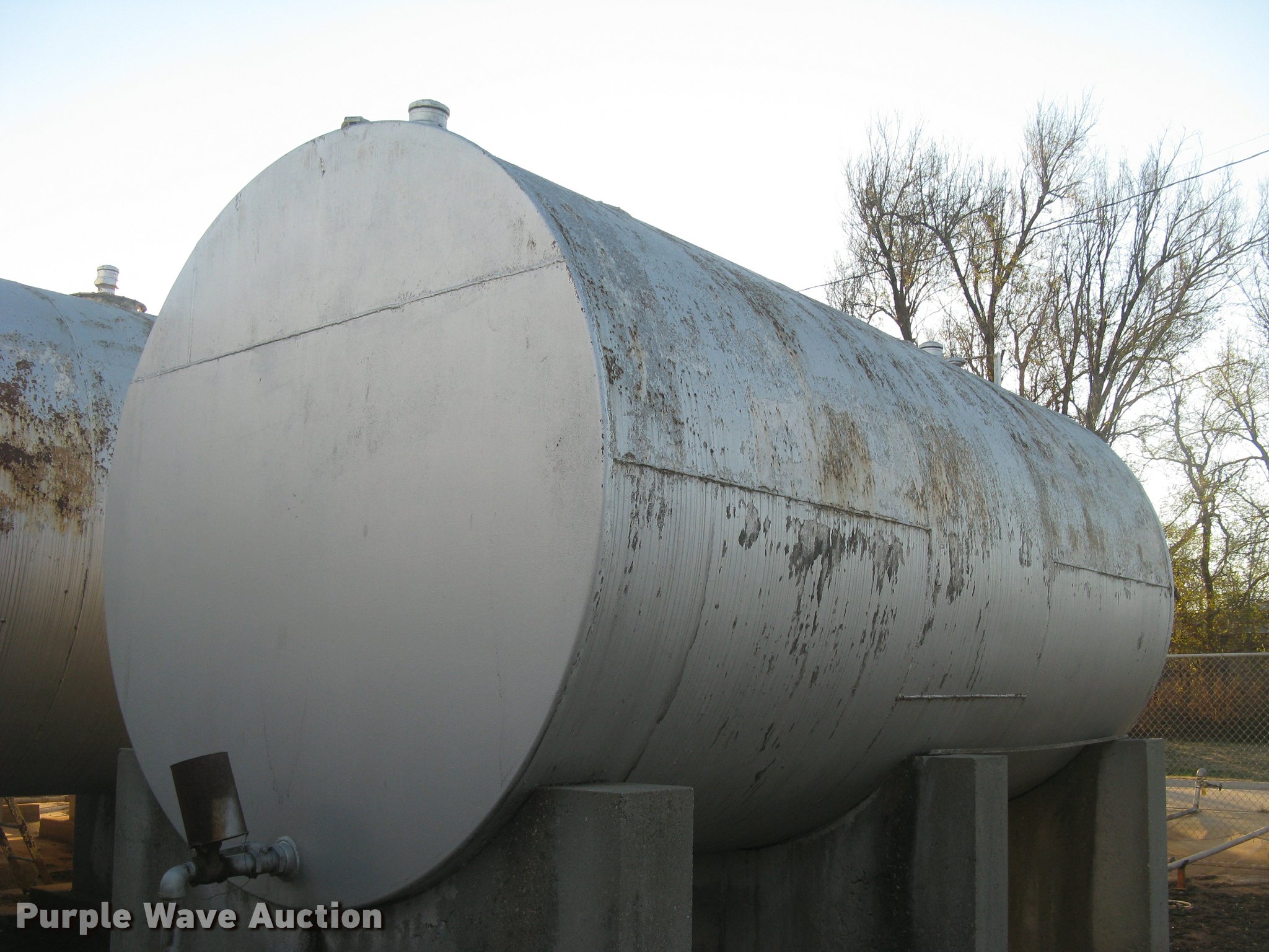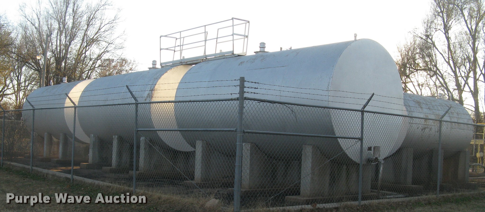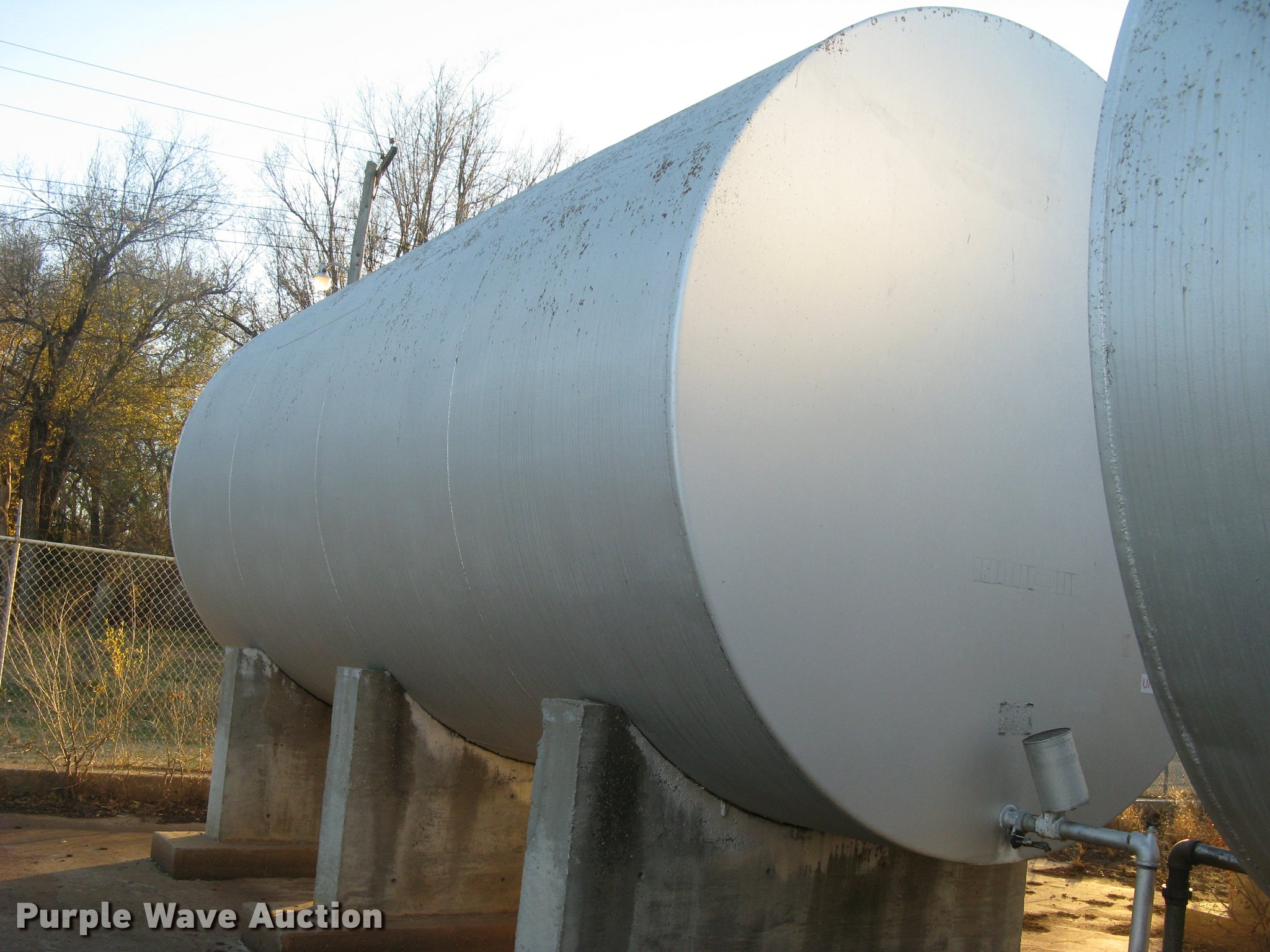 Purple Wave is selling a used Fuel and Lube in Kansas. This item is a Bulk fuel fill center with the following: (7) Standard Steel Works single wall fuel tanks, #1, 20'L x 10' diameter, 12,000 gallon capacity, Piped in conjunction with tank #7, Previously used for gasoline, #2, 20'L x 10' diameter, 12,000 gallon capacity, #3, 20'L x 10' diameter, 12,000 gallon capacity, Previously used for gasoline, #4, 16'L x 8' diameter, (2) chamers, 6,000 gallon capacity, Previously used for diesel, #5, 20'L x 10' diameter, 12,000 gallon capacity, Previously used for diesel, #6, 20'L x 10' diameter, 12,000 gallon capacity, Previously used for diesel, #7, 20'L x 10' diameter, 12,000 gallon capacity, Previously used for gasoline,, (2) steel catwalks and ladders, Approx. 14'L and 28'L, Approx. 300' steel pipe fuel supply lines with pedestal stands, Approx. 90' steel pipe at fill station with elbows, valves, and Kamlok caps, (3) Gorman-Rupp fuel pumps, 1.5 HP electric motors, 115/230V, Single phase, (2) Morrison bulk fill fuel nozzles, 36"L fill tubes, Steel filling platform with staircase, 8'L platform, Electric will be disconnected by seller just above ground level, Fence will be removed by seller and is not included, Concrete tank stands are poured in place and not included