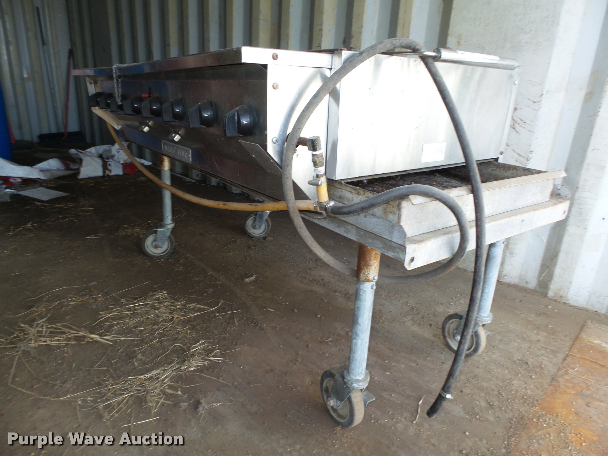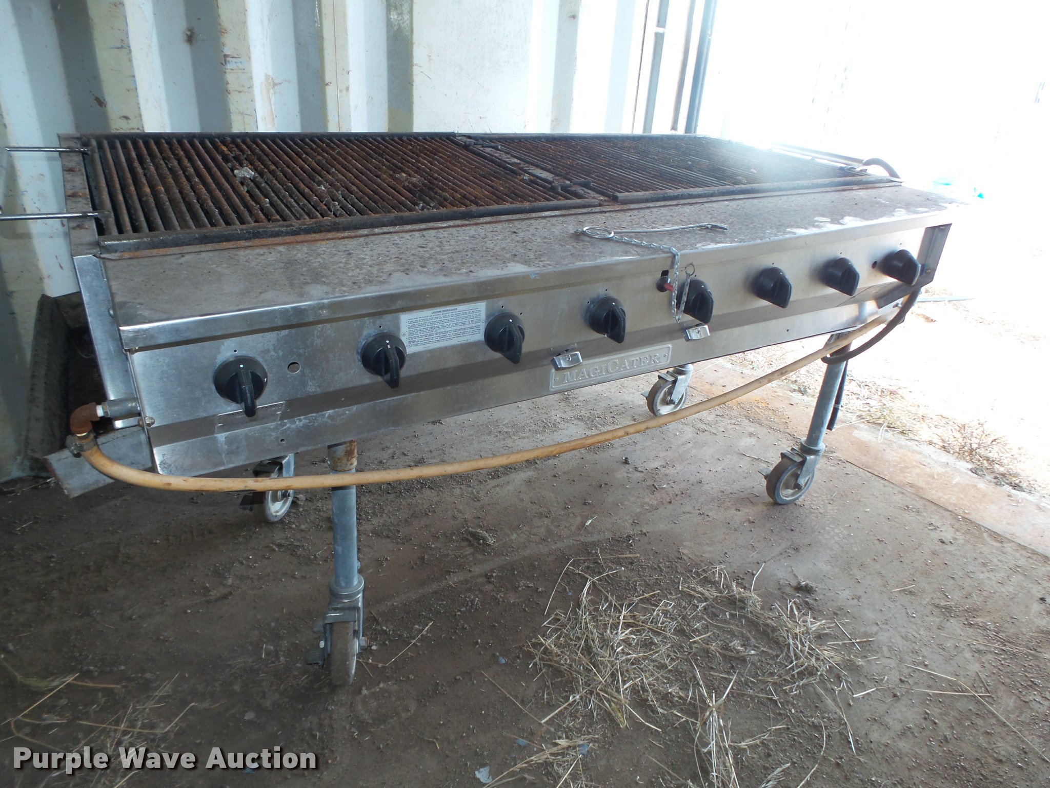 Purple Wave is selling a used Lawn and Garden in Nebraska. This item is a 2005 MajiCater stainless steel grill with the following: Model PAGA60, 5'L x 2'W x 36'H grill top, Propane fired, Locking casters, Serial 00051694