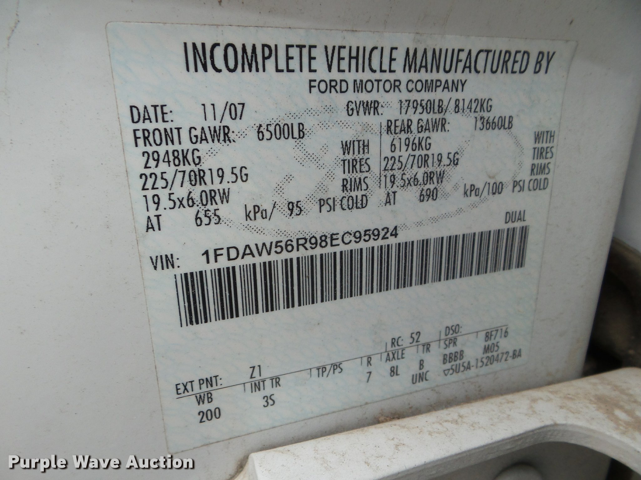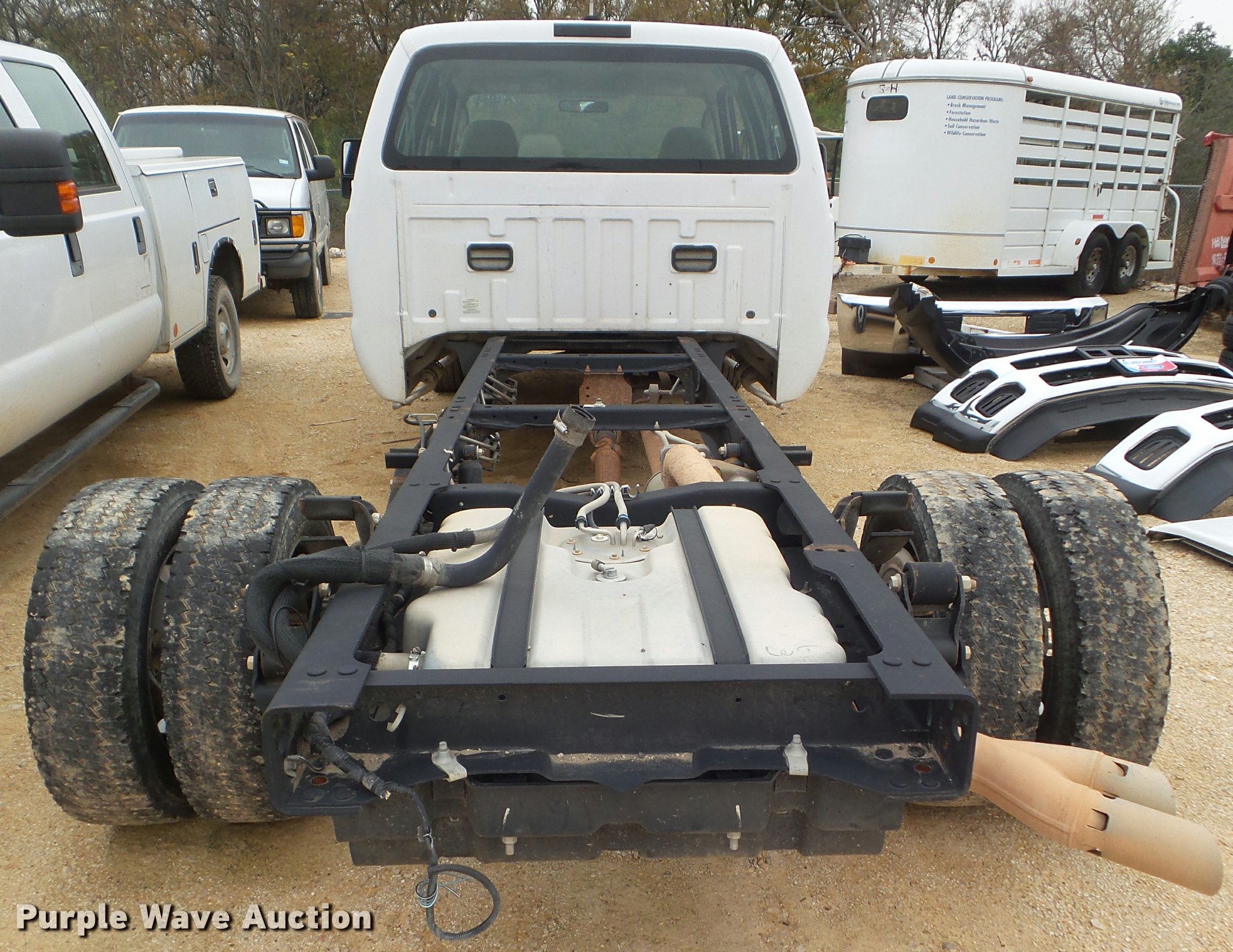 Purple Wave is selling a used Truck Chassis in Texas. This item is a 2008 Ford F550 Crew Cab truck cab and chassis with the following: Unknown miles on odometer, 6.4L V8 OHV 32V diesel engine, Automatic transmission, AC and heat, Tilt, Cruise, AM/FM, Power windows, locks, and mirrors, Cloth interior, Grill guard, Trailer wiring, 225/70R19.5 tires, Hail damage, Non-operational unit, Unit# 52172