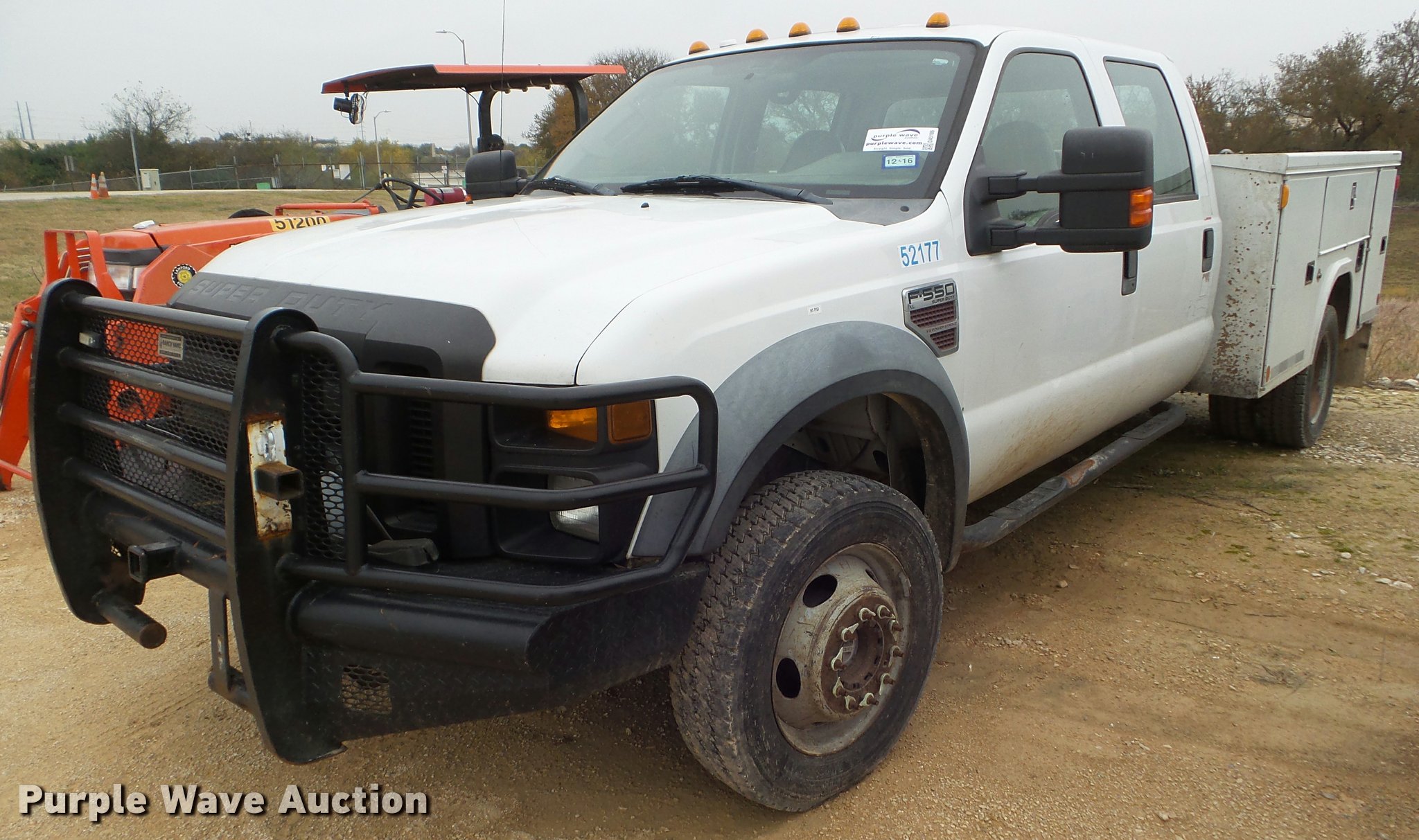Purple Wave is selling a used Service Truck in Texas. This item is a 2008 Ford F550 Crew Cab utility truck with the following: Unknown miles on odometer, Approx. 142,739 miles, 6.4L V8 OHV 32V diesel engine, Automatic transmission, Four wheel drive, AC and heat, Tilt, Cruise, AM/FM, Power windows, locks, and mirrors, Vinyl interior, Grill guard, Running boards, RKI utility bed, 9'L, (6) compartments, Receiver hitch, Trailer wiring, 225/70R19.5 tires, Hail damage, Non-operational unit, Unit# 52177