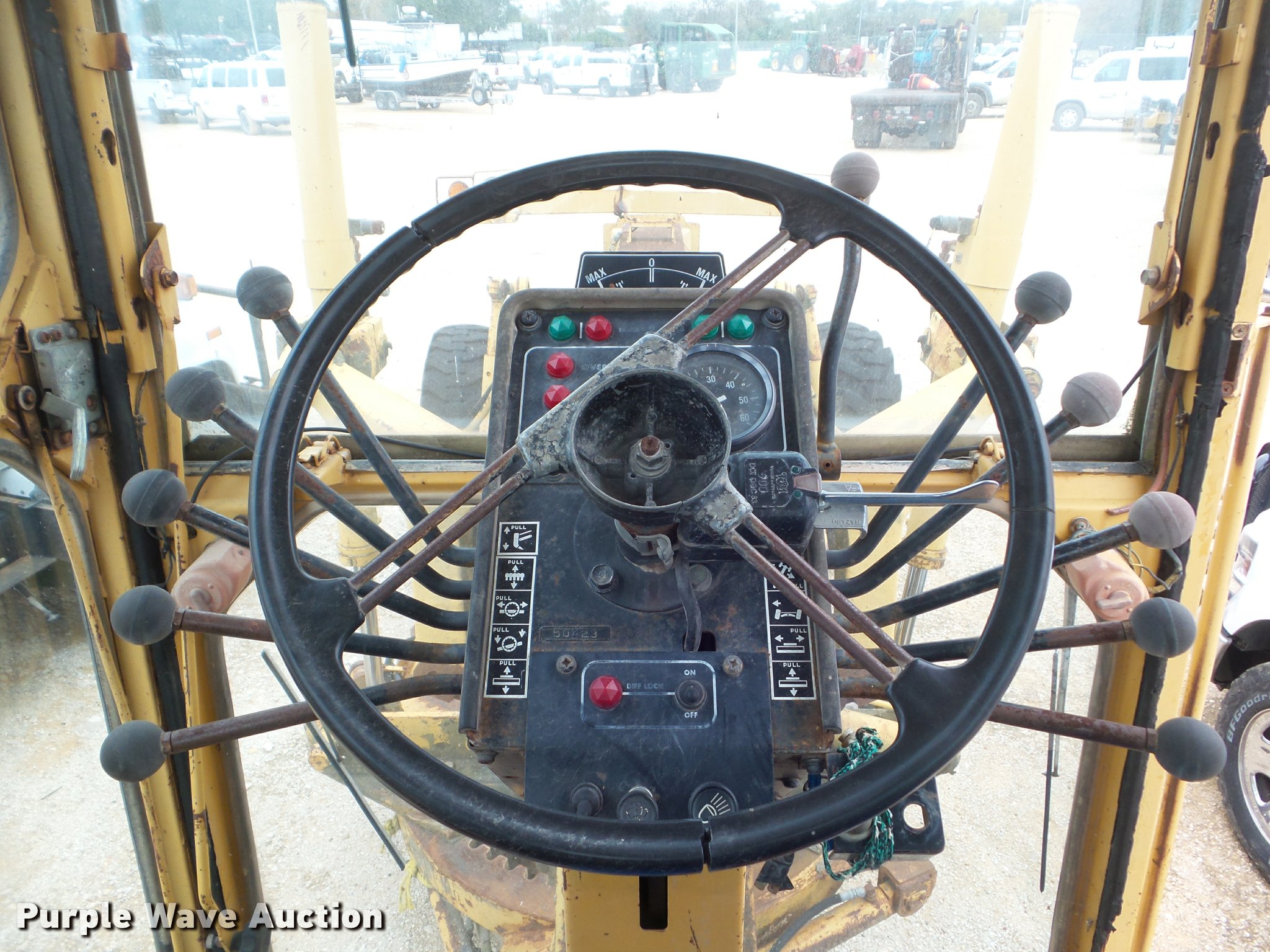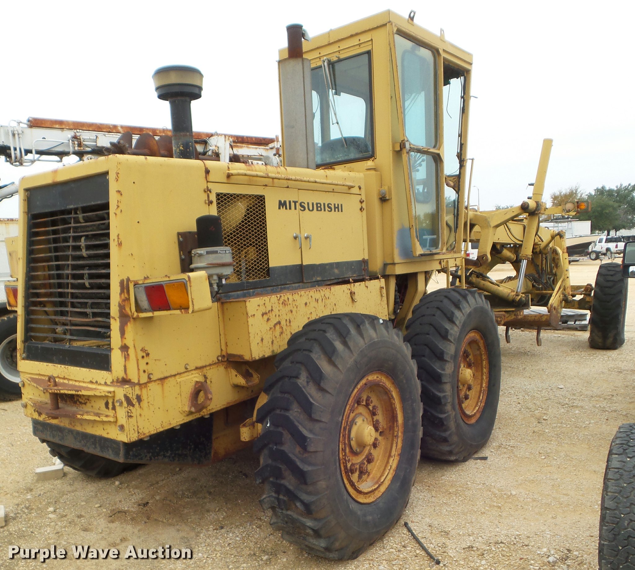 Purple Wave is selling a used Motor Grader in Texas. This item is a 1987 Mitsubishi MG400 motor grader with the following: 31,301 hours on meter, Six cylinder turbo diesel engine, Powershift transmission, 6F-6R gears, Enclosed cab, AM/FM, Suspension seat, Front and rear work lights, 10 hydraulic control valves, 14' moldboard, Tip control, Side shift, Circle slip clutch, Mid-mounted scarifier, (3) teeth, 14.00-24 tires, Unknown operating condition, Serial 4G000730, Unit# 50423