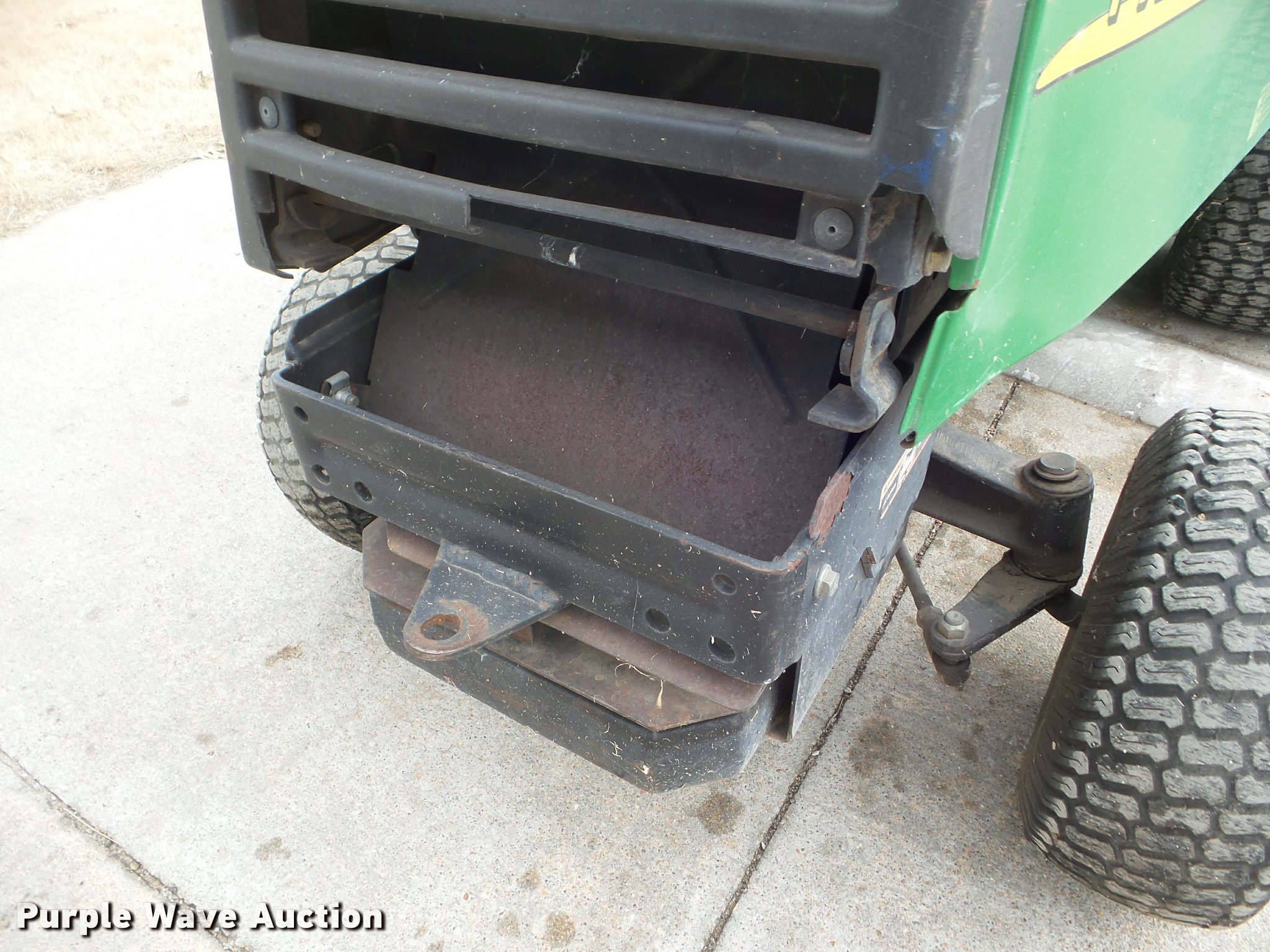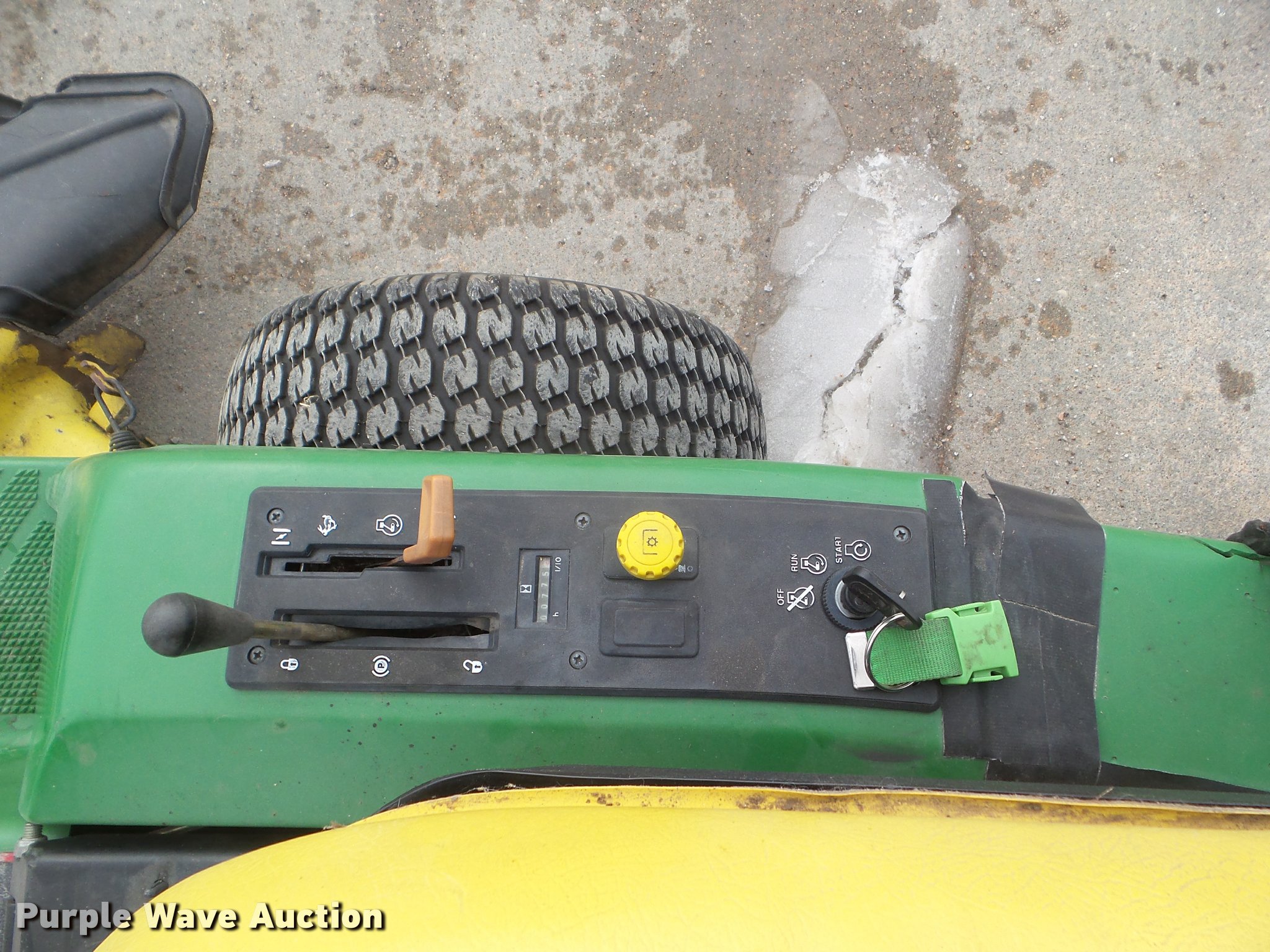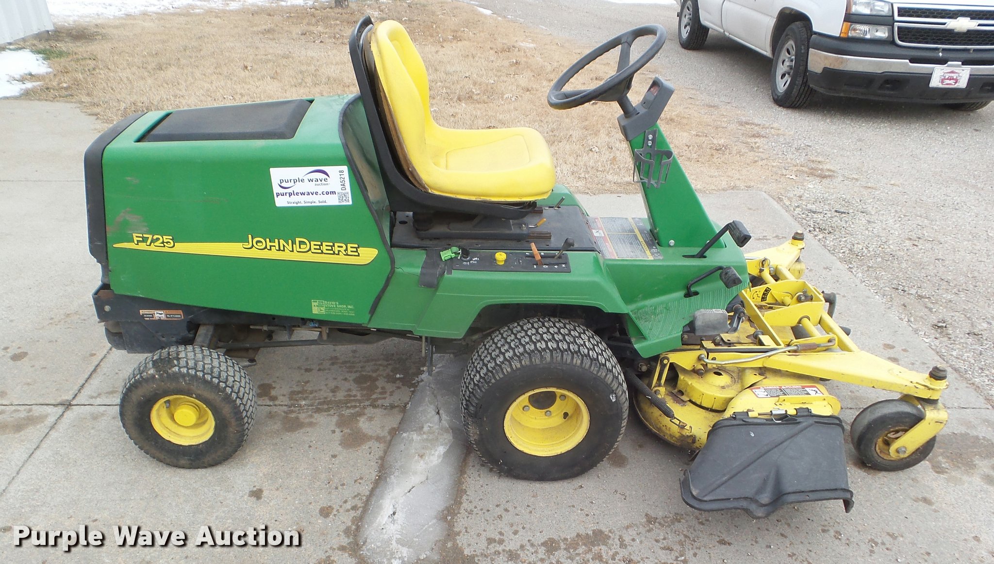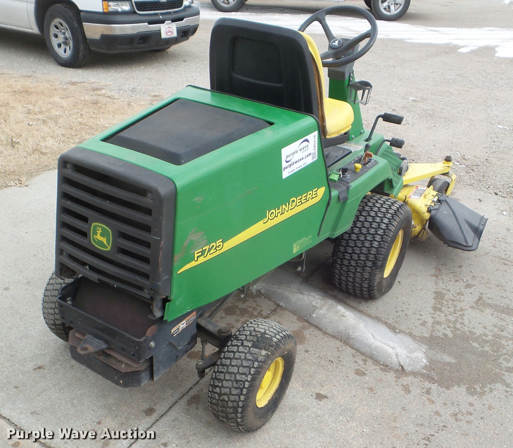 Purple Wave is selling a used Lawn Mower in Kansas. This item is a John Deere F725 lawn mower with the following: 775 hours on meter, 48"W deck, Kawasaki 585cc gas engine, Hydrostatic transmission, 20 x 10.00-8 front tires, 15 x 6.00-6 rear tires, Serial TCF725X120799