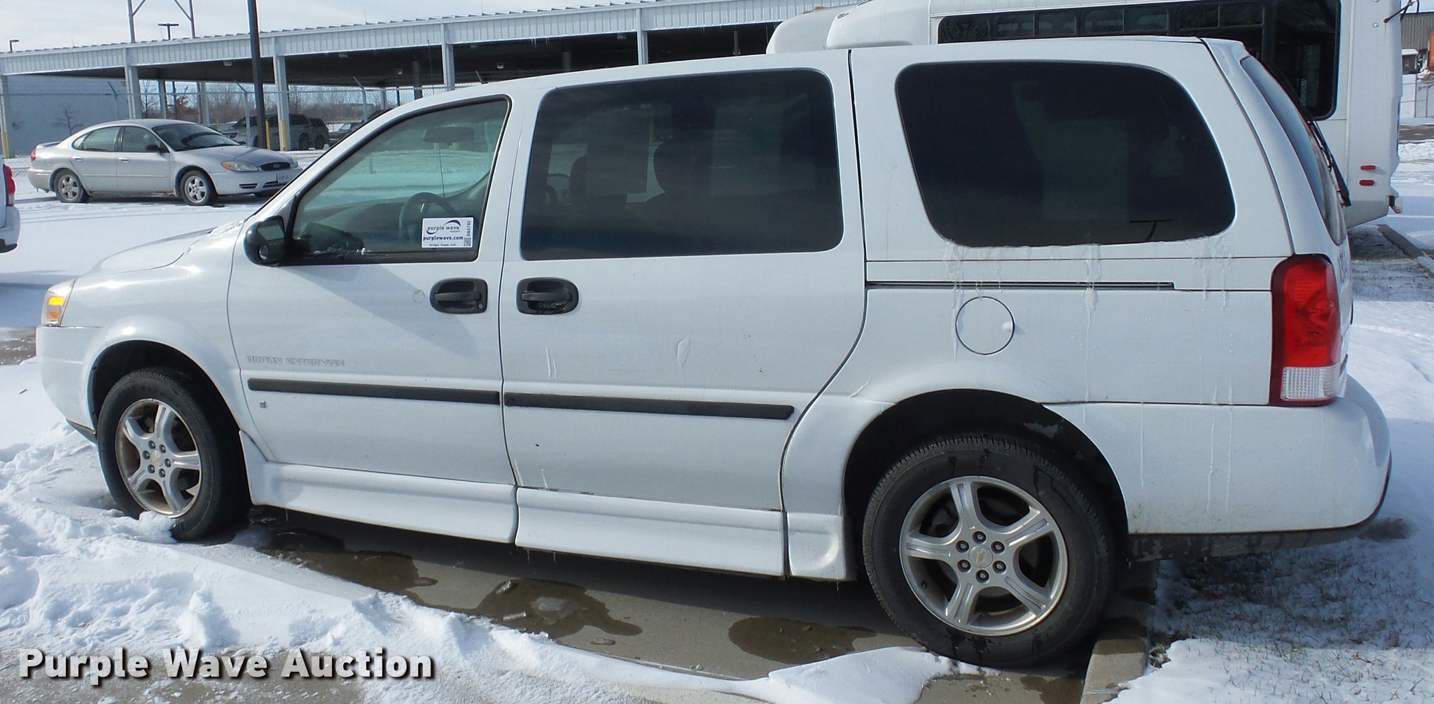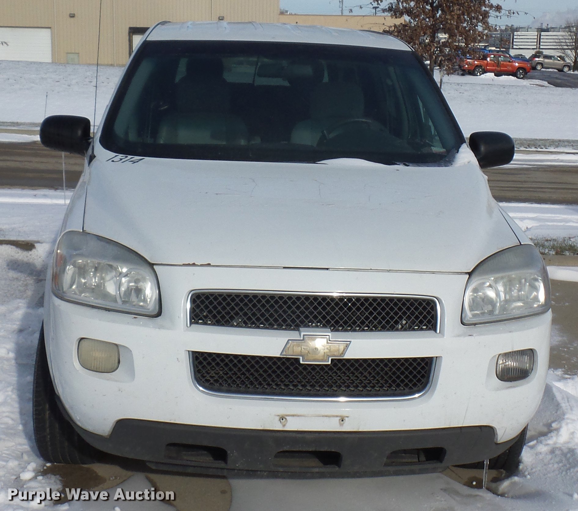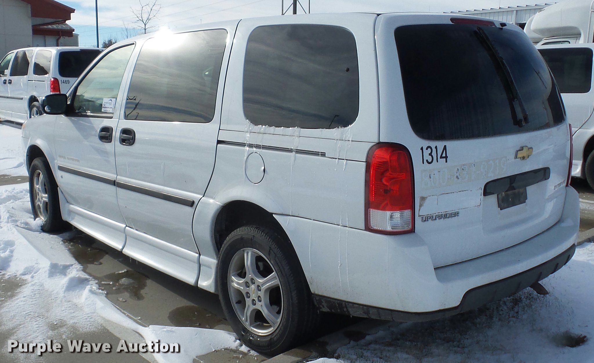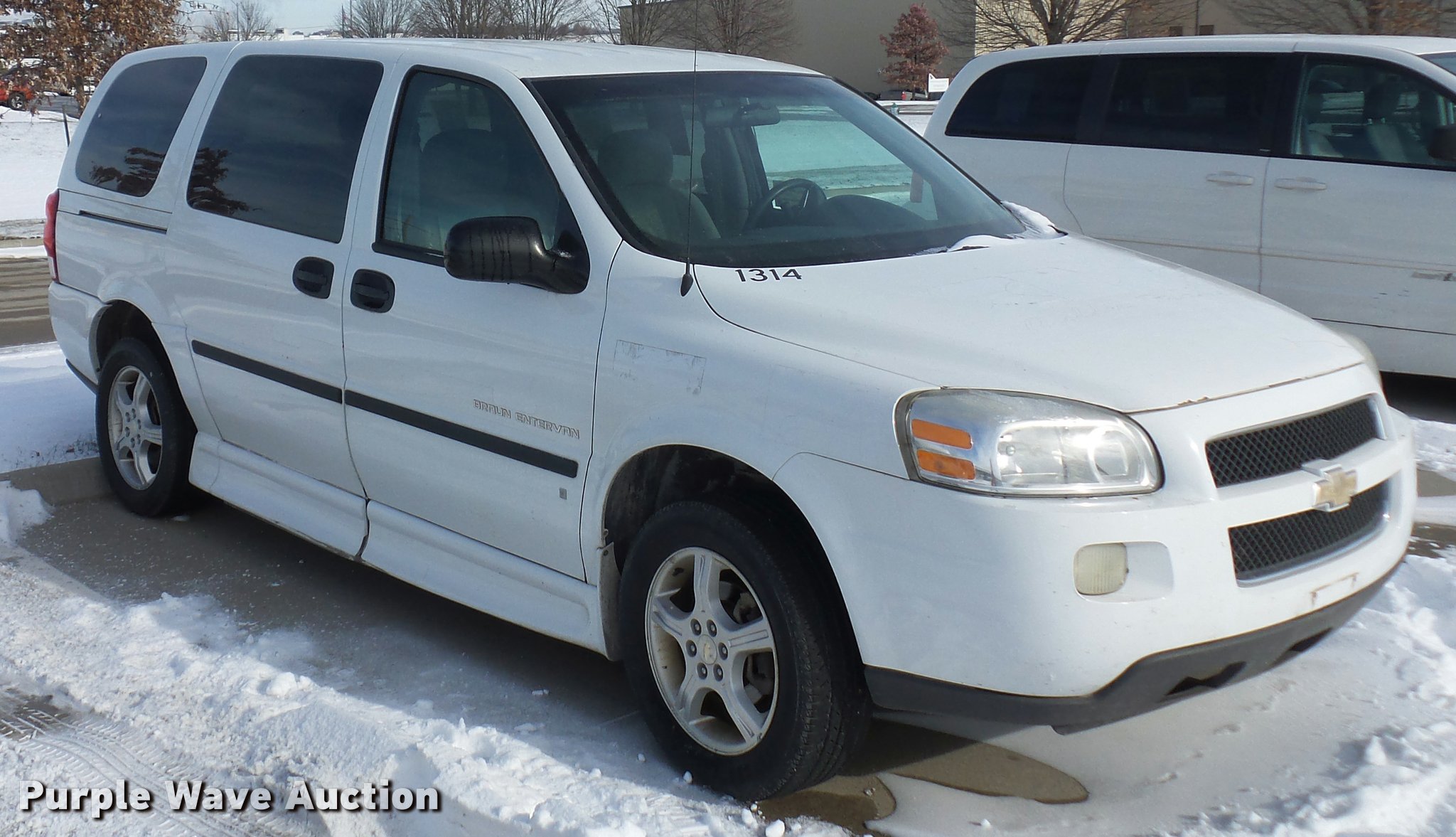 Purple Wave is selling a used Passenger Vehicle in Missouri. This item is a 2006 Chevrolet Uplander van with the following: 175,181 miles on odometer, 3.5L V6 gas engine, Automatic transmission, AC and heat, Tilt, Cruise, AM/FM/CD, Power windows, locks, and mirrors, Cloth interior, Wheelchair ramp, 225/60R17 tires, Check engine light on, Unit# 1314
