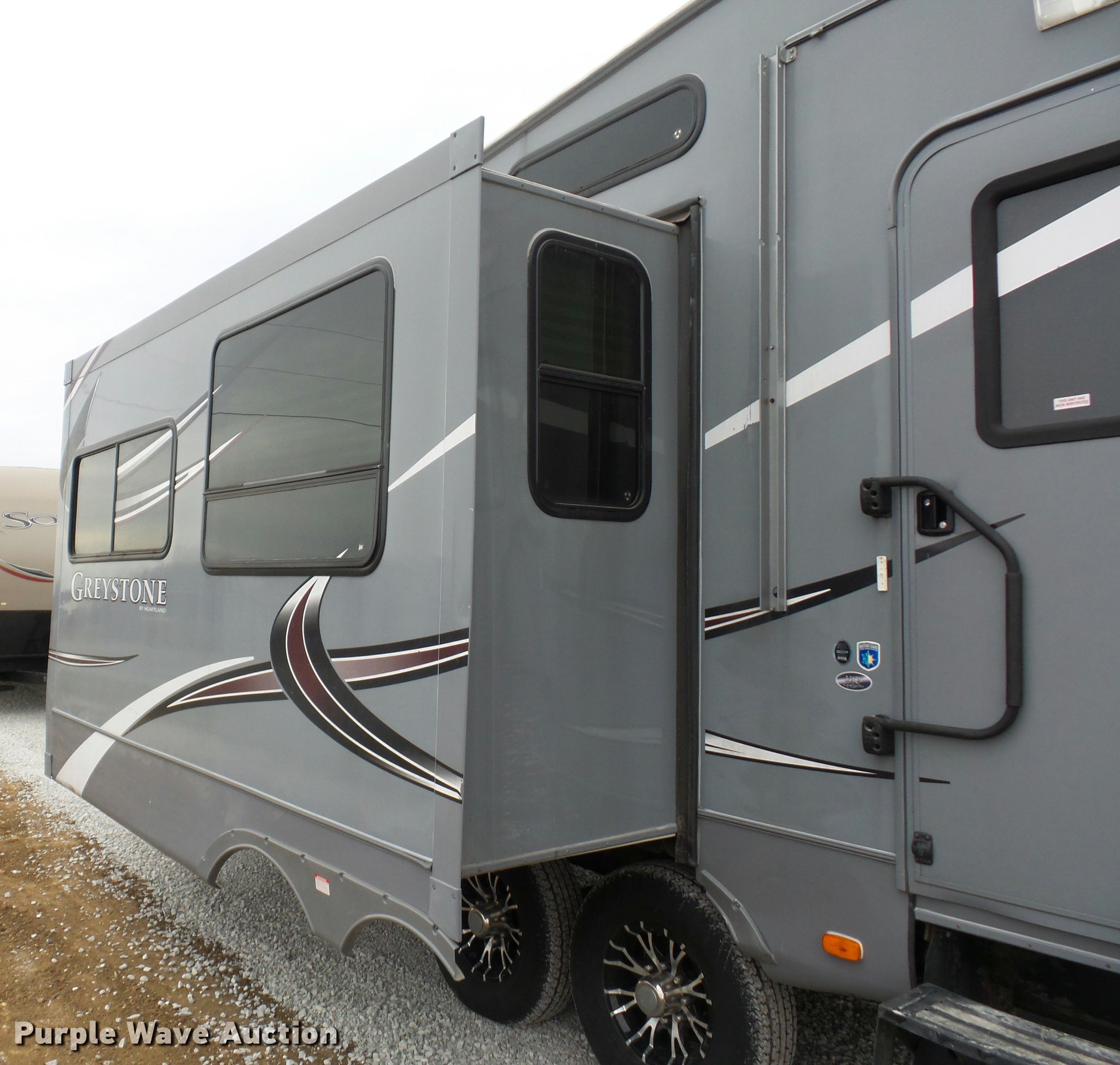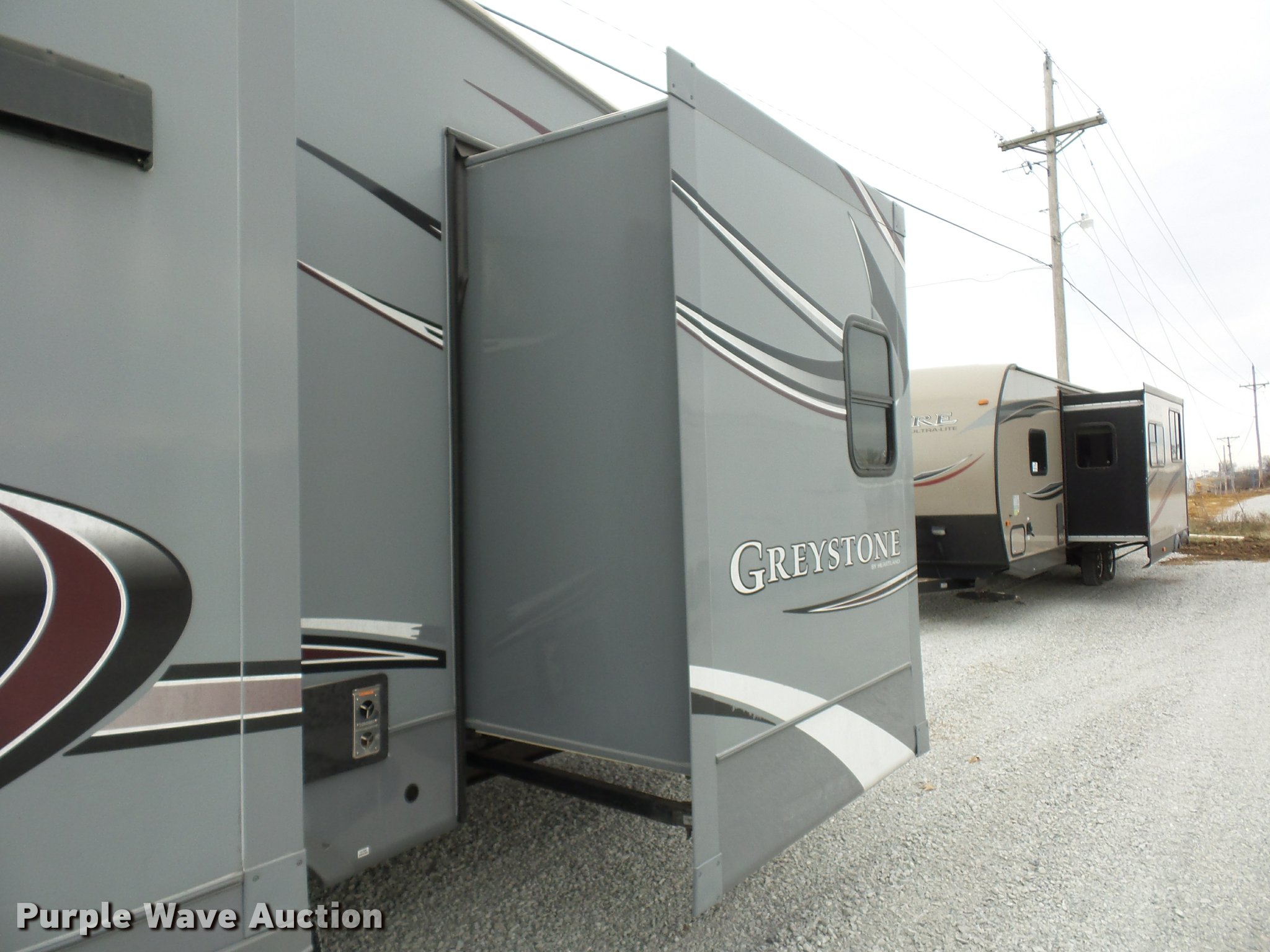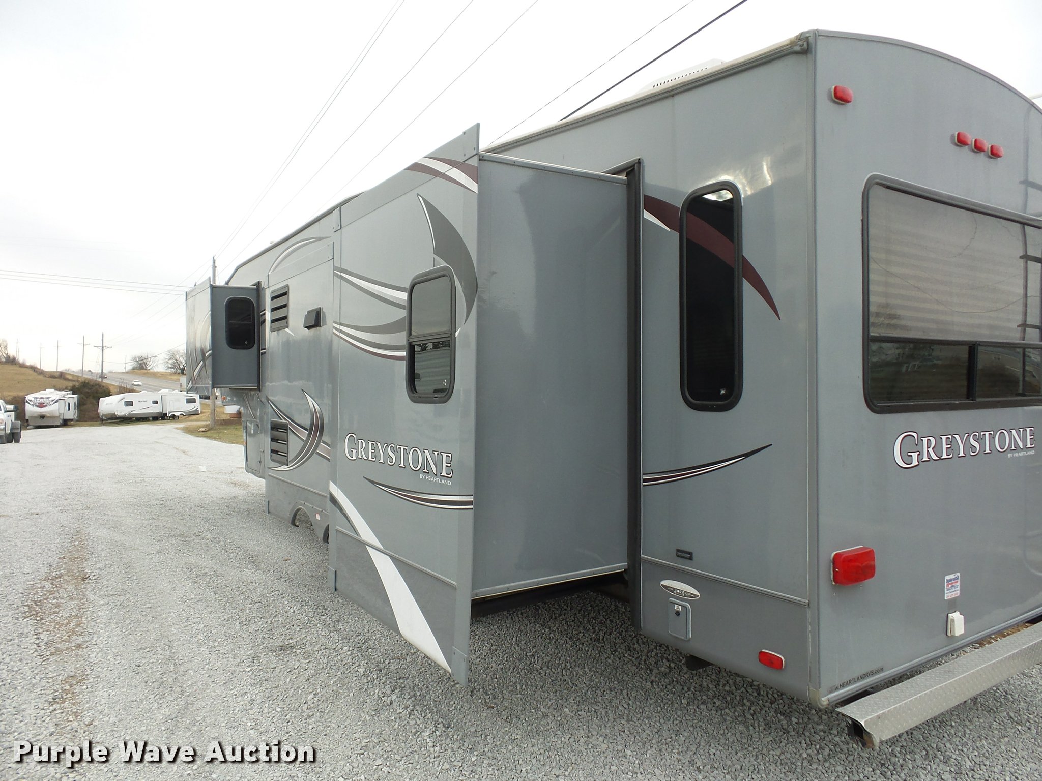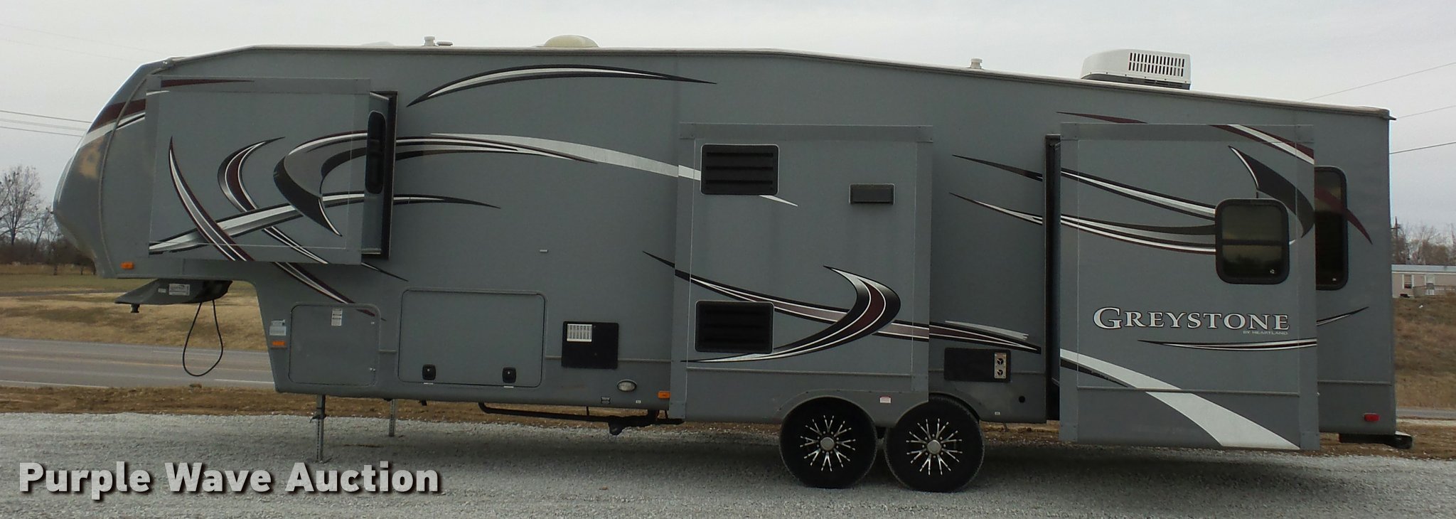 Purple Wave is selling a used RV in Missouri. This item is a 2012 Greystone 33QX camper with the following: 38'L, (3) slide-outs, Kitchen, Stove, Sink, Refrigerator/freezer, Desk, Fireplace, Bathroom, Sink, Toilet, Shower, Manual jack stand, Fifth wheel hitch, 235/80R16 tires, GVWR 13,930 lbs, Spring suspension, Electric brakes, Possible electrical issues
