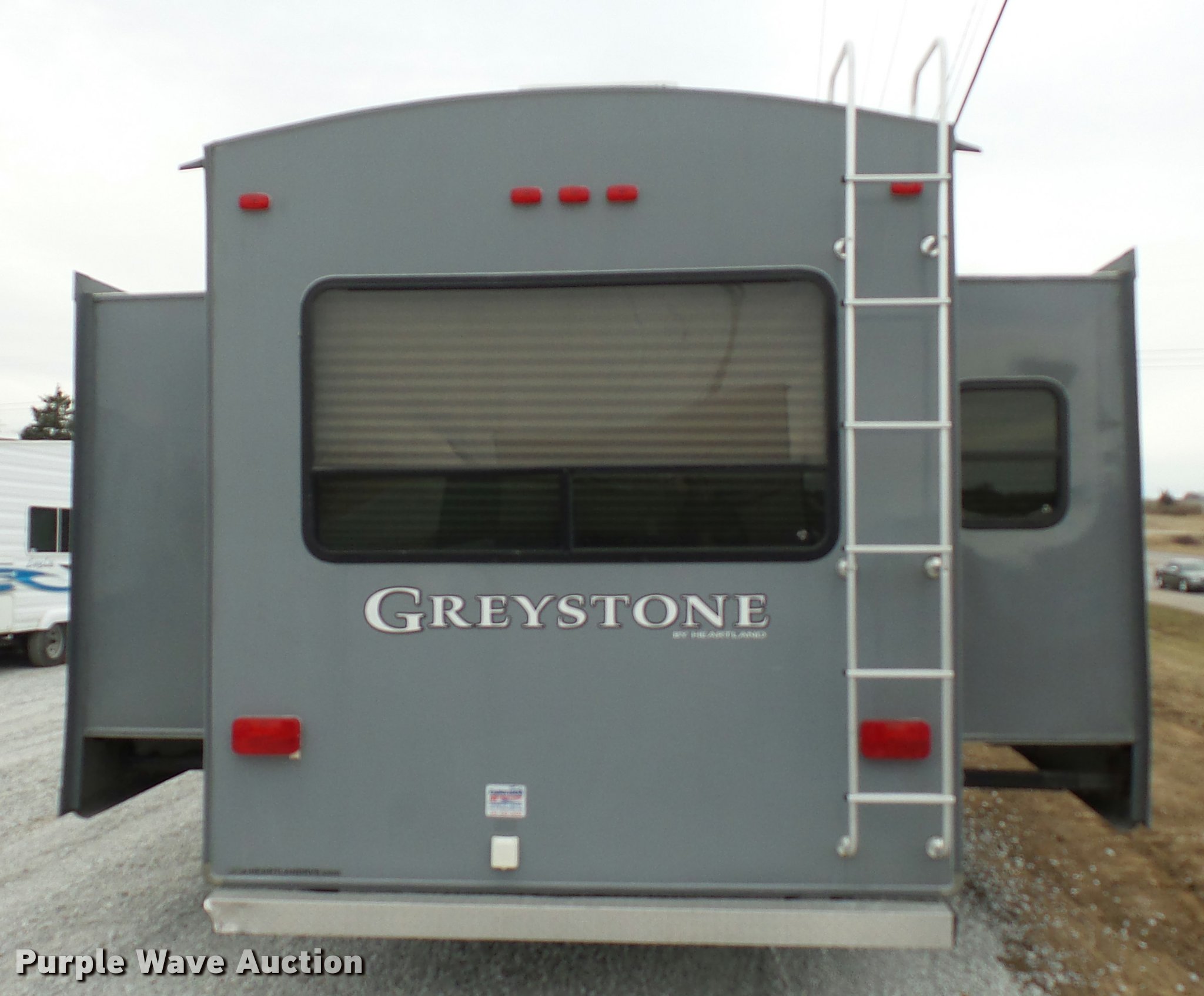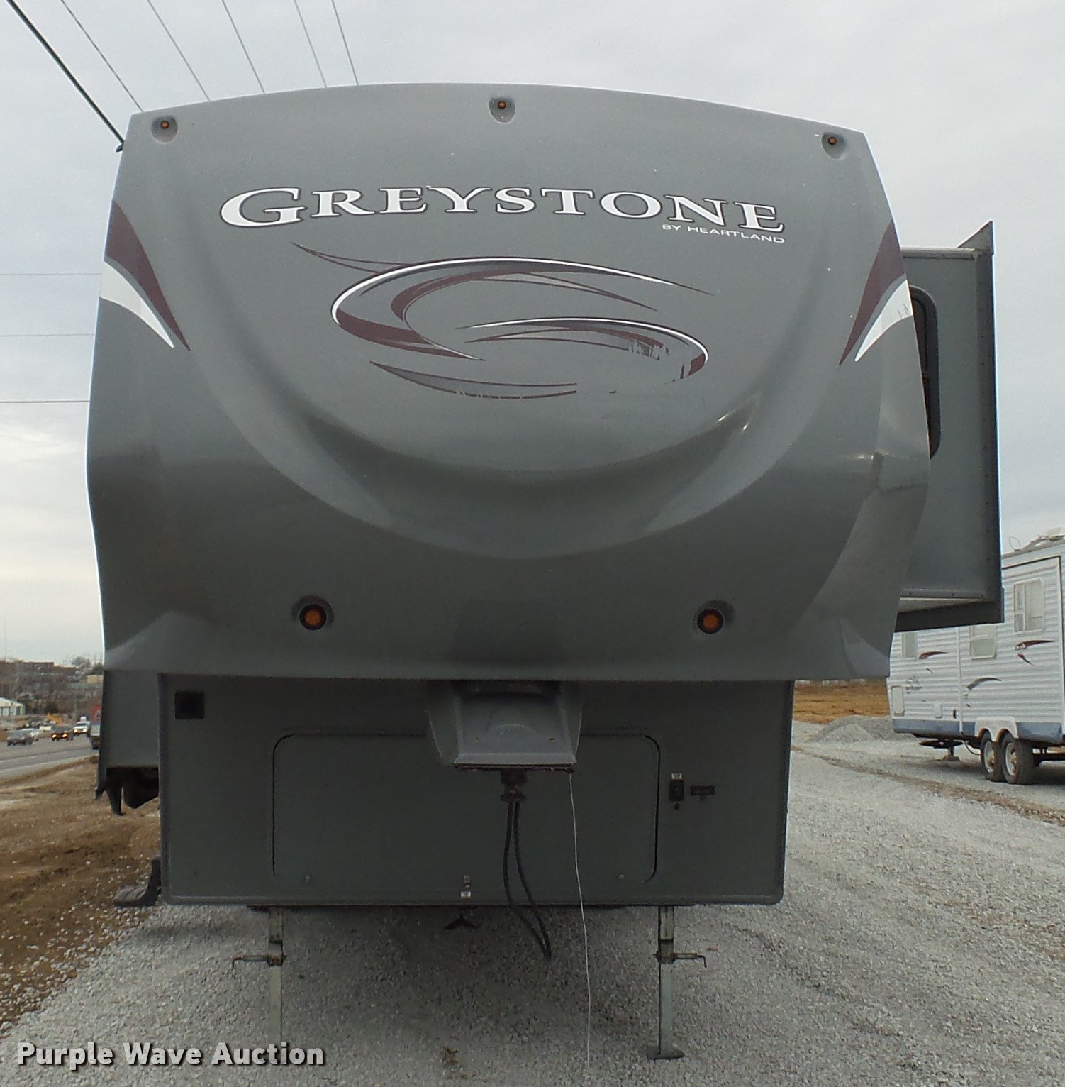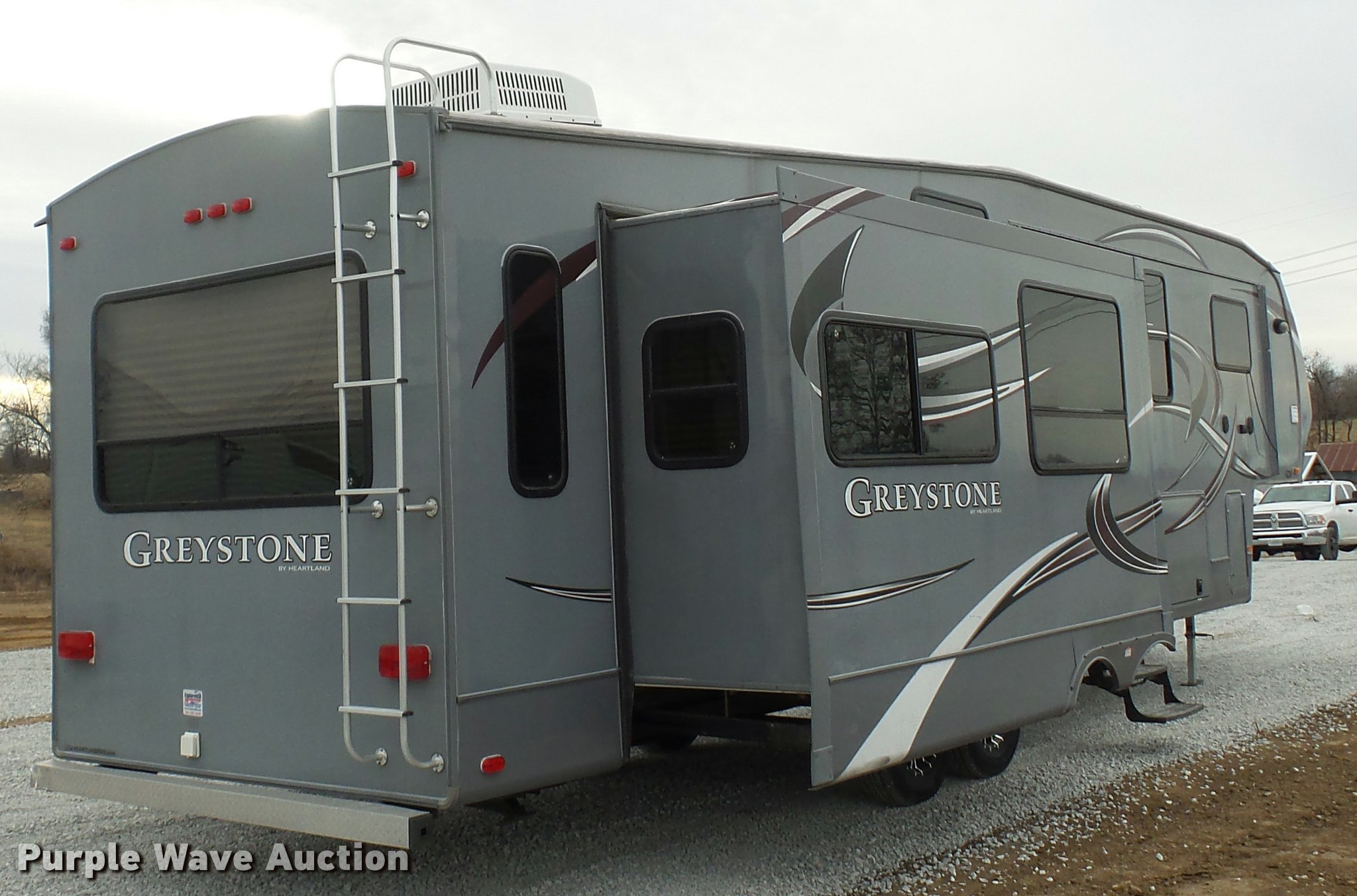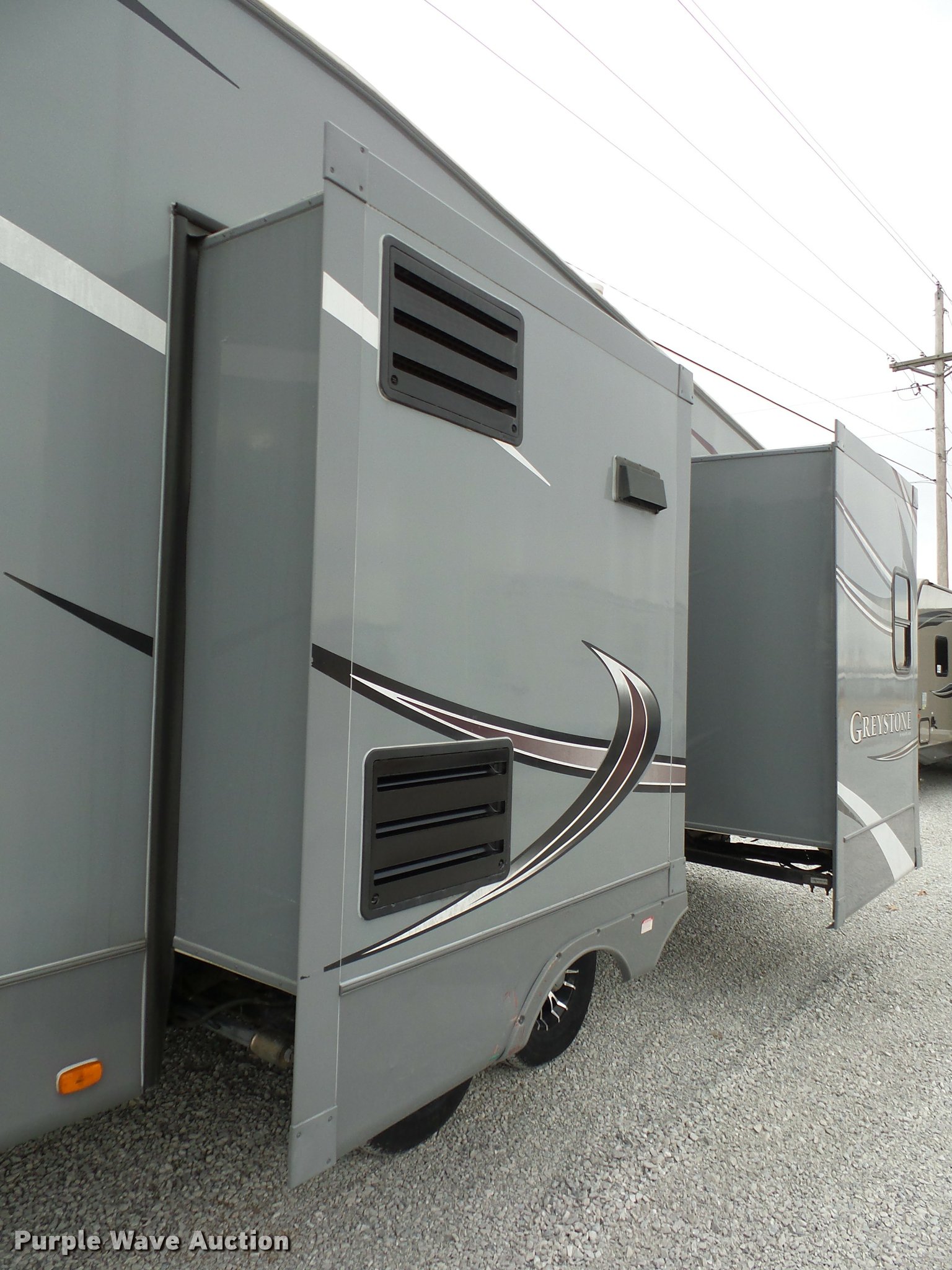 Purple Wave is selling a used RV in Missouri. This item is a 2012 Greystone 33QX camper with the following: 38'L, (3) slide-outs, Kitchen, Stove, Sink, Refrigerator/freezer, Desk, Fireplace, Bathroom, Sink, Toilet, Shower, Manual jack stand, Fifth wheel hitch, 235/80R16 tires, GVWR 13,930 lbs, Spring suspension, Electric brakes, Possible electrical issues
